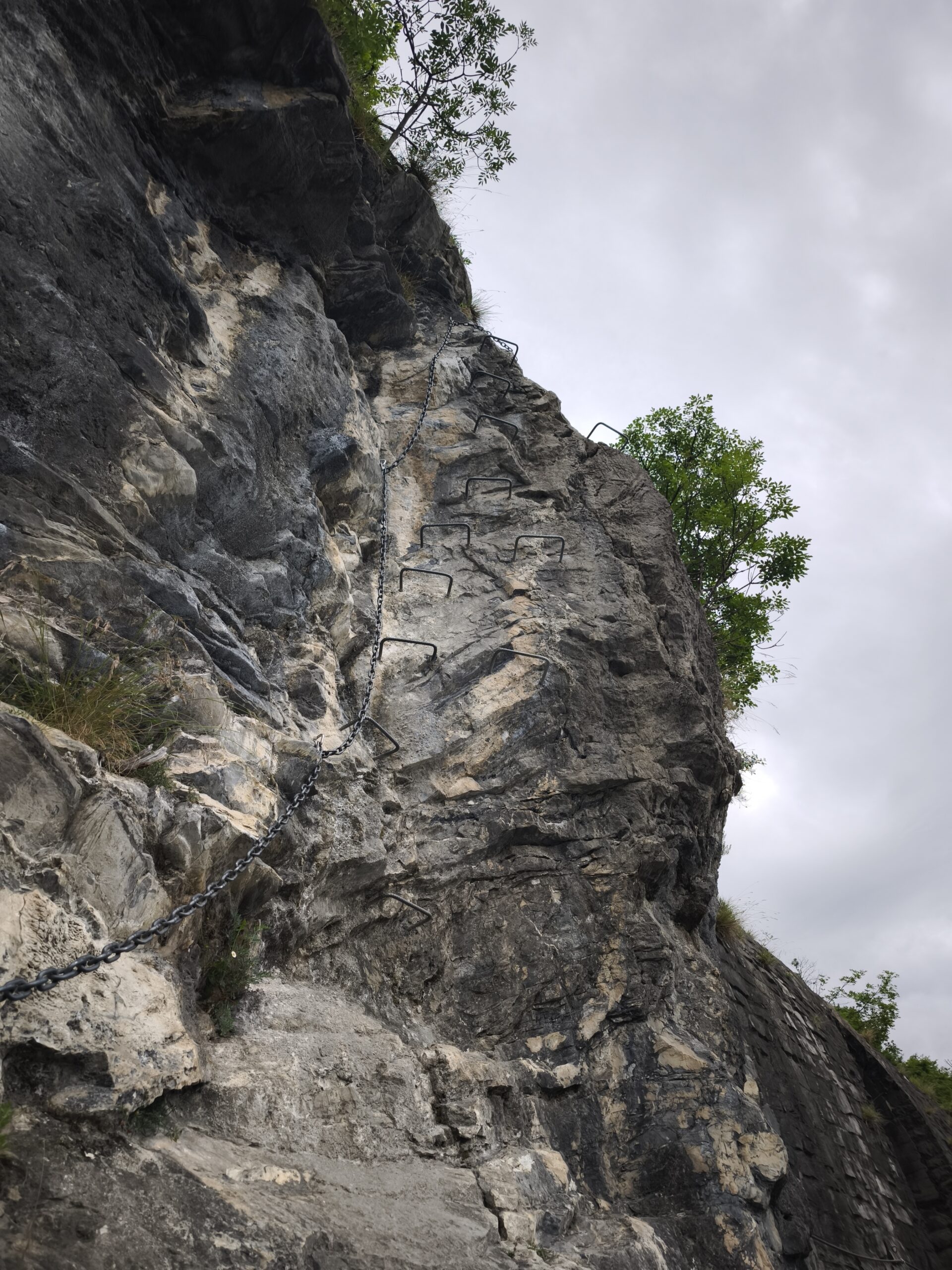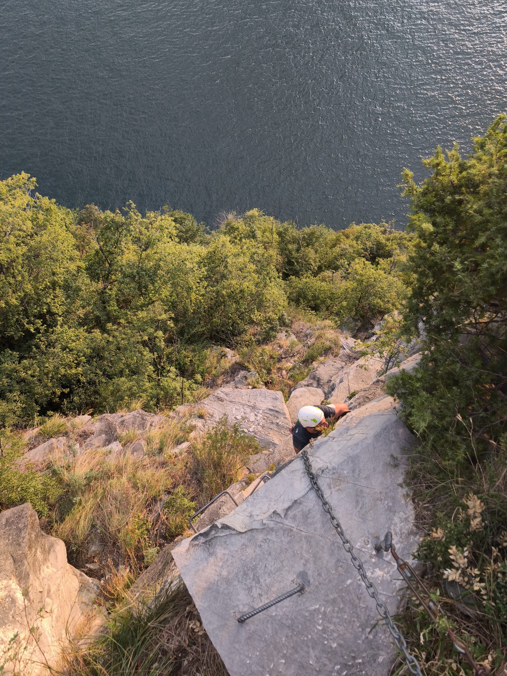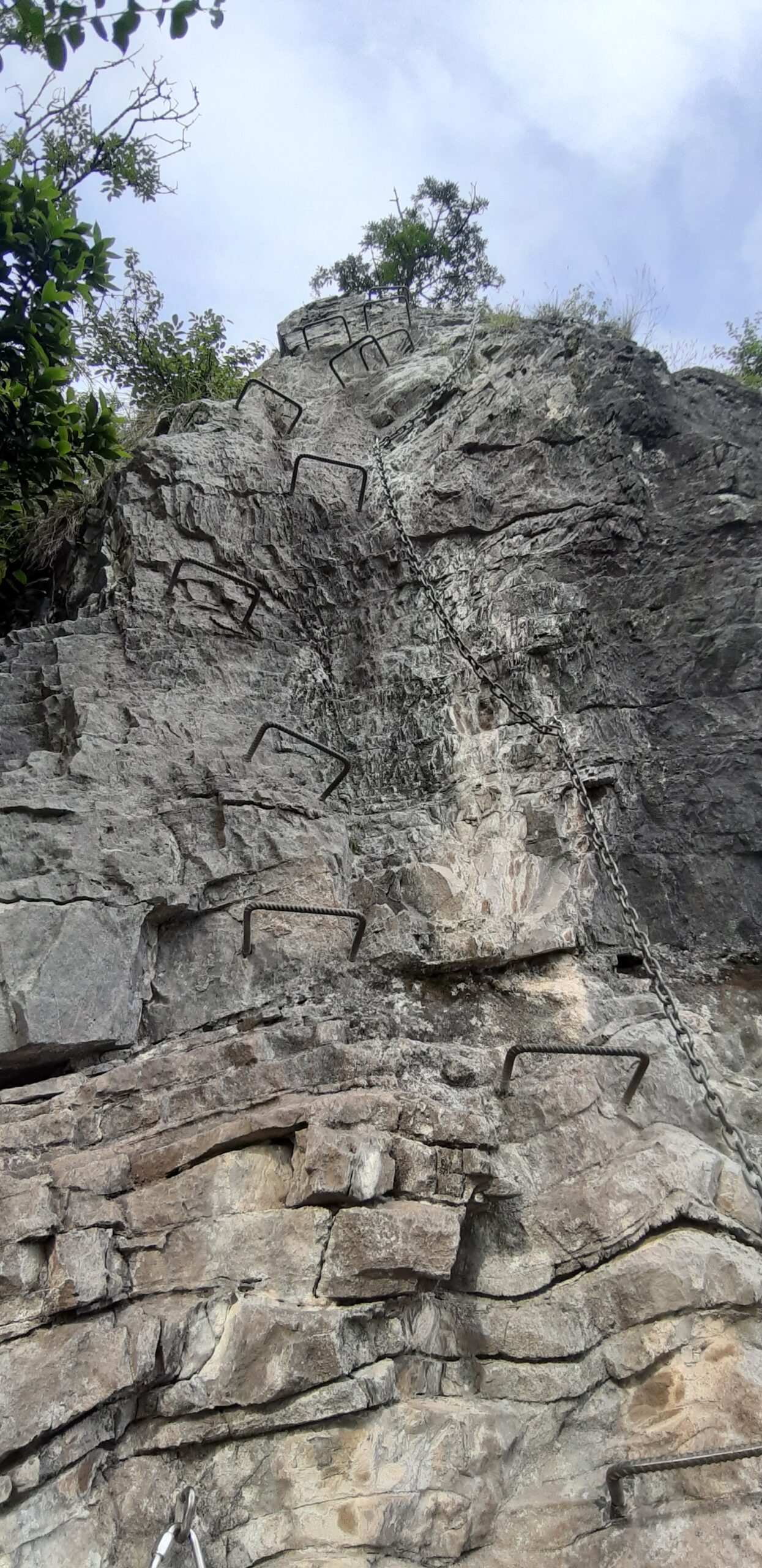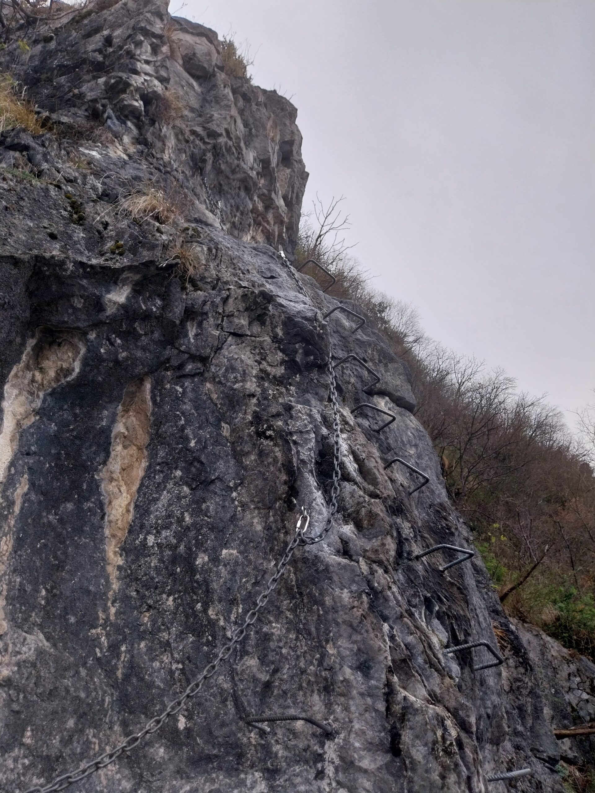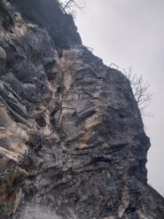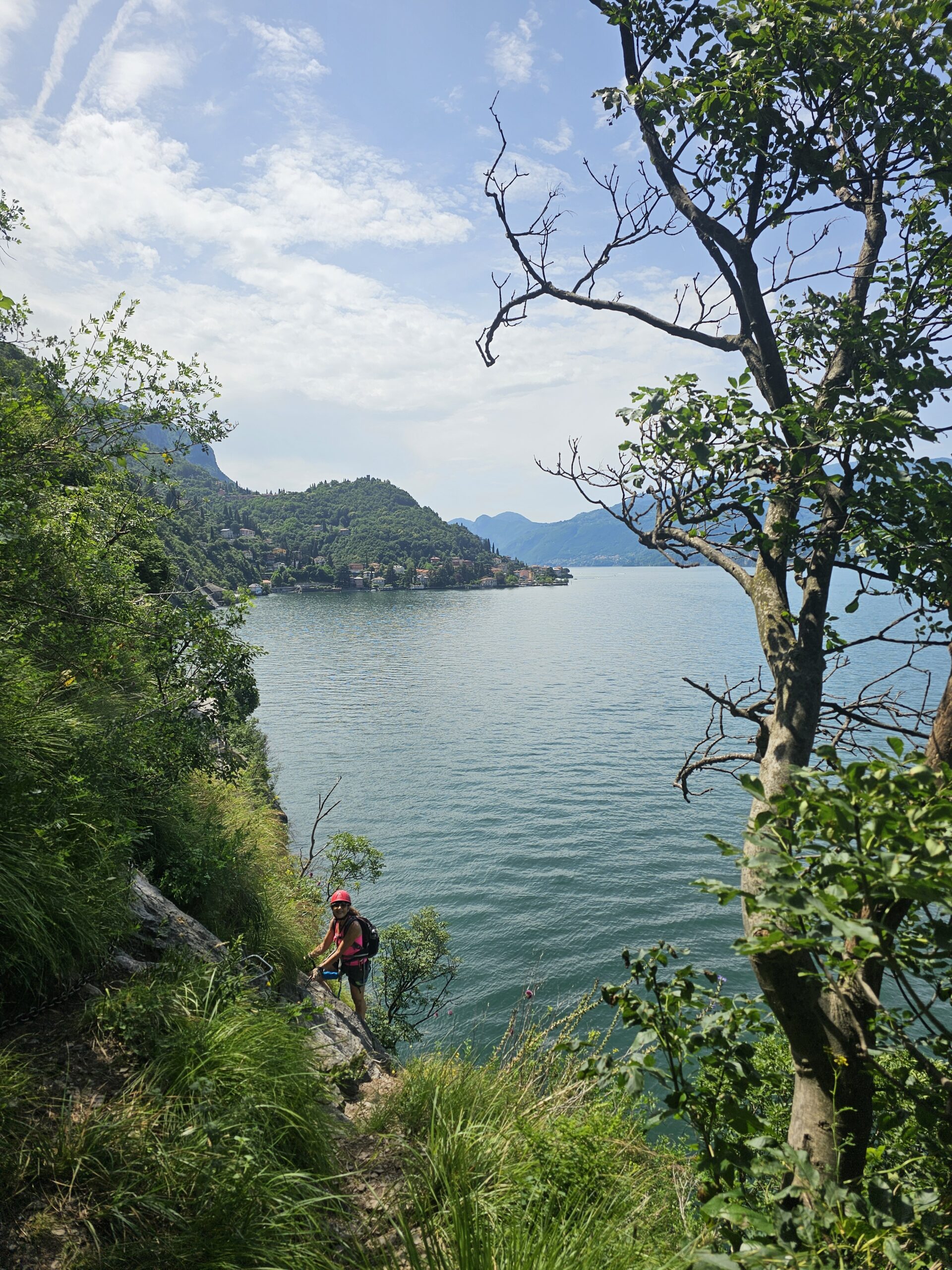 Dall’attacco traversare a sinistra e abbassarsi sfruttando i gradini, superare un primo muretto e portarsi poi a destra per superarne uno più verticale, quasi strapiombante. Raggiunta la sommità della galleria salire in obliquo verso sinistra alternando passaggi su roccia a tratti con terra ed erba. Proseguire lungo un sentiero con cavo sino a raggiungere un muretto attrezzato con vecchi pioli arrugginiti oltre i quali si raggiunge un bivio. Sulla sinistra corre il rientro (possibile via di fuga). Prendere la destra e superare alcuni muretti verticali sino ad un traverso verso destra cui segue un’ultima paretina verticale superata la quale si giunge alla fine della ferrata su un balcone panoramico a picco sul lago.