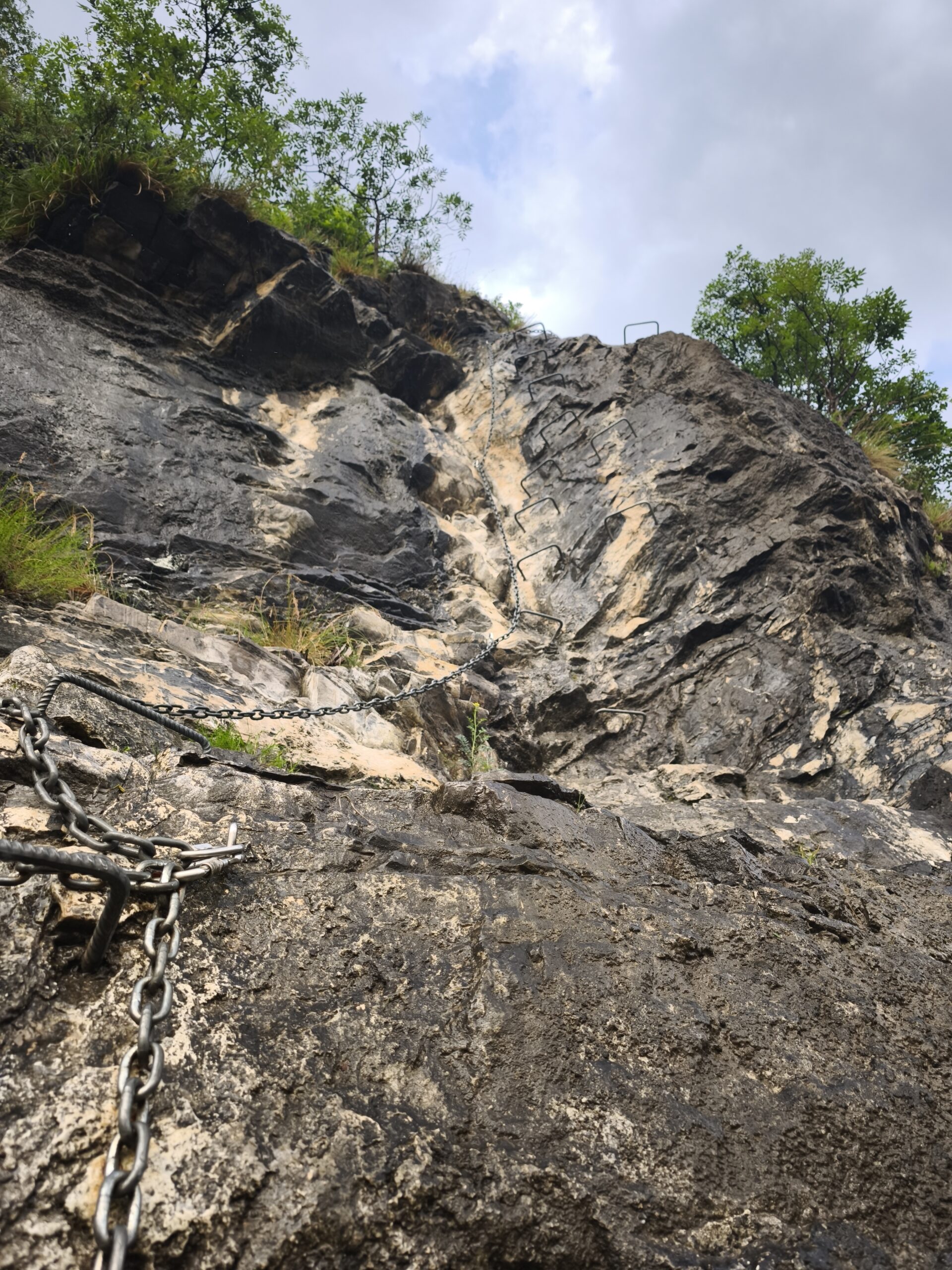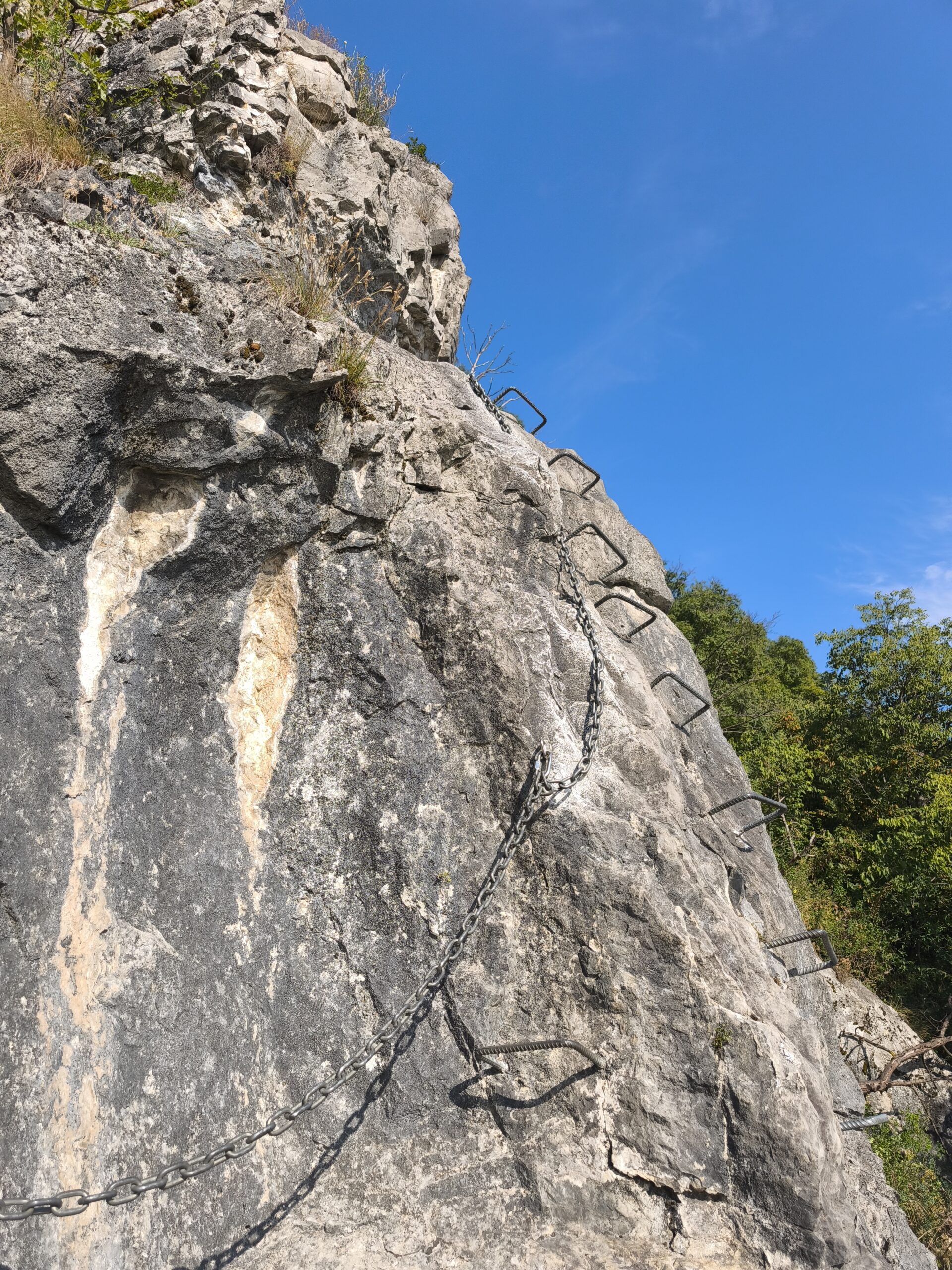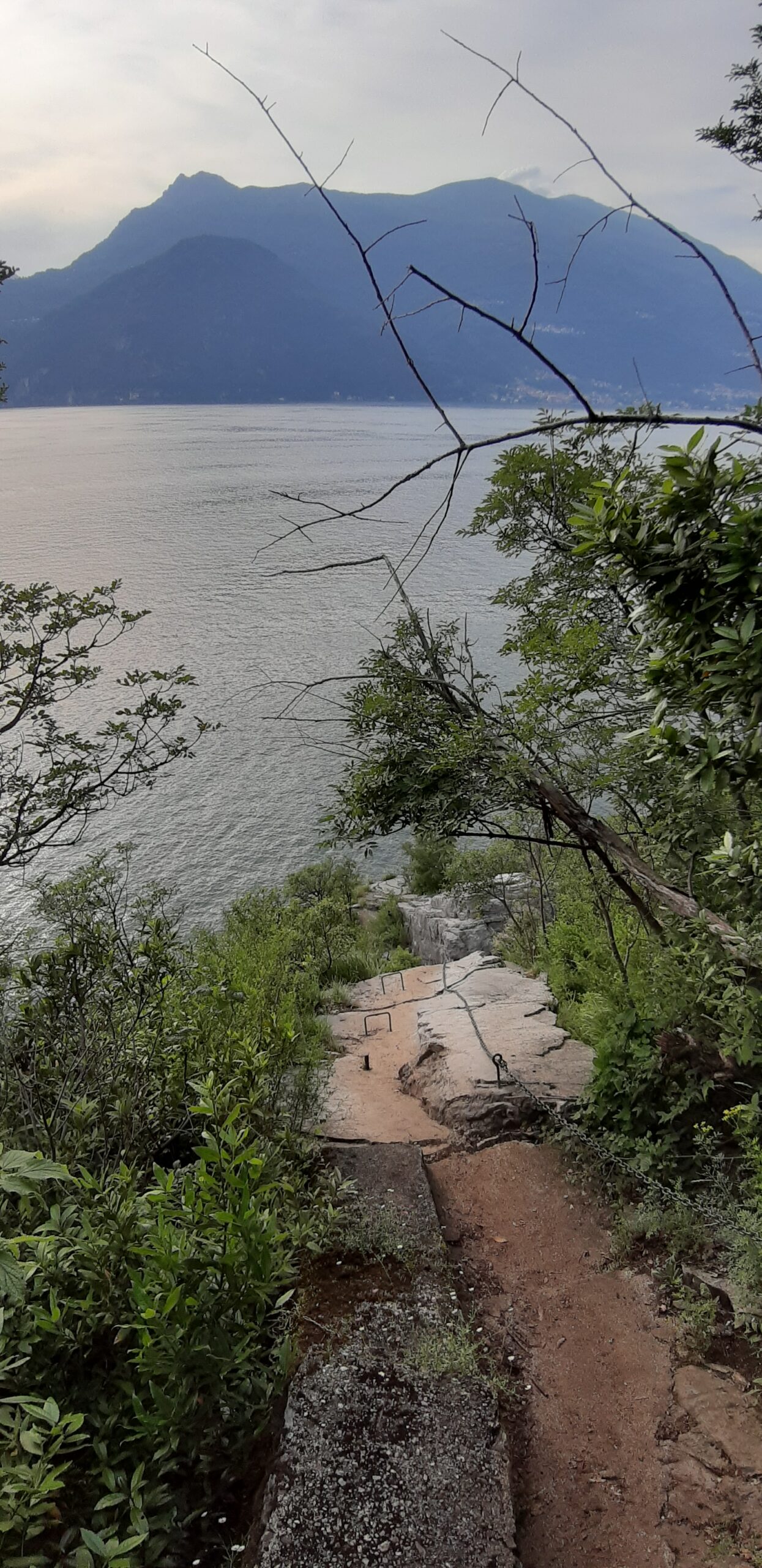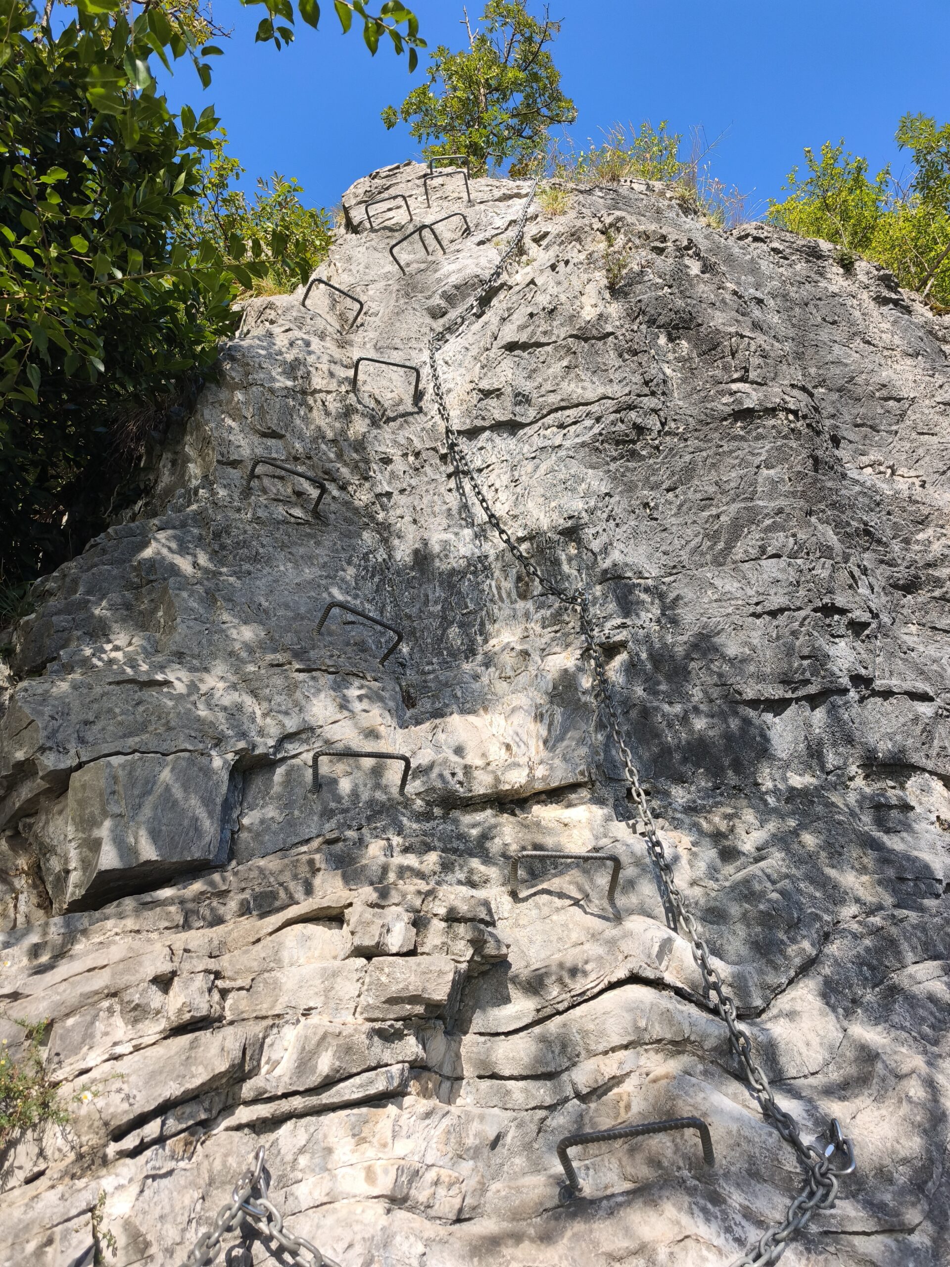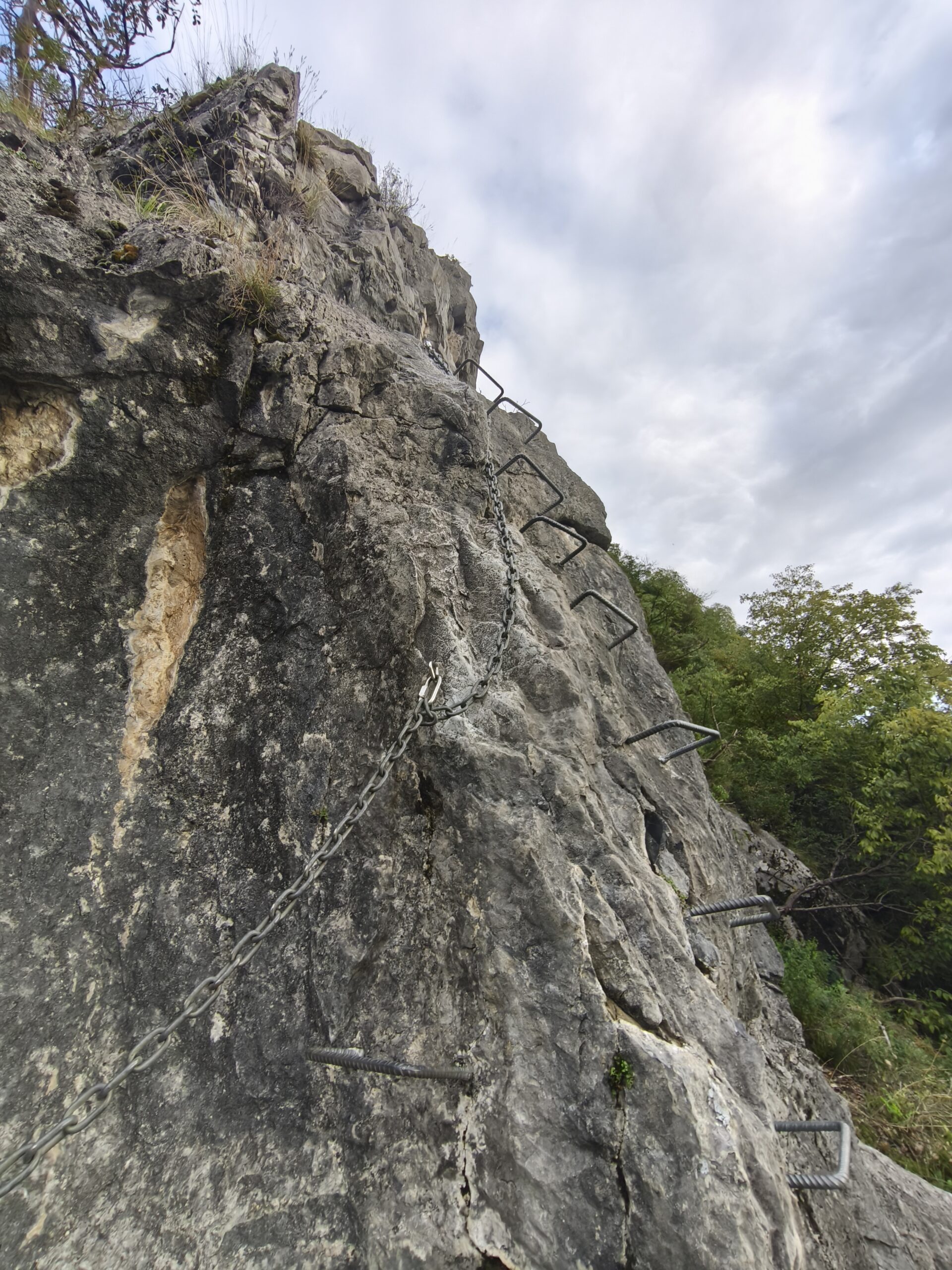 Dall’attacco traversare a sinistra e abbassarsi sfruttando i gradini, superare un primo muretto e portarsi poi a destra per superarne uno più verticale, quasi strapiombante. Raggiunta la sommità della galleria salire in obliquo verso sinistra alternando passaggi su roccia a tratti con terra ed erba. Proseguire lungo un sentiero con cavo sino a raggiungere un muretto attrezzato con vecchi pioli arrugginiti oltre i quali si raggiunge un bivio. Sulla sinistra corre il rientro (possibile via di fuga). Prendere la destra e superare alcuni muretti verticali sino ad un traverso verso destra cui segue un’ultima paretina verticale superata la quale si giunge alla fine della ferrata su un balcone panoramico a picco sul lago.