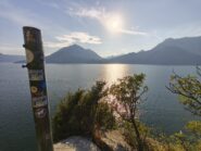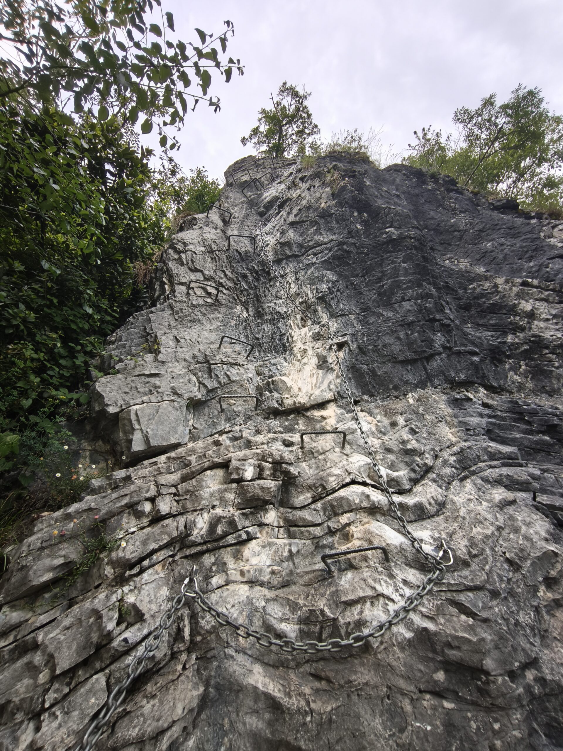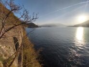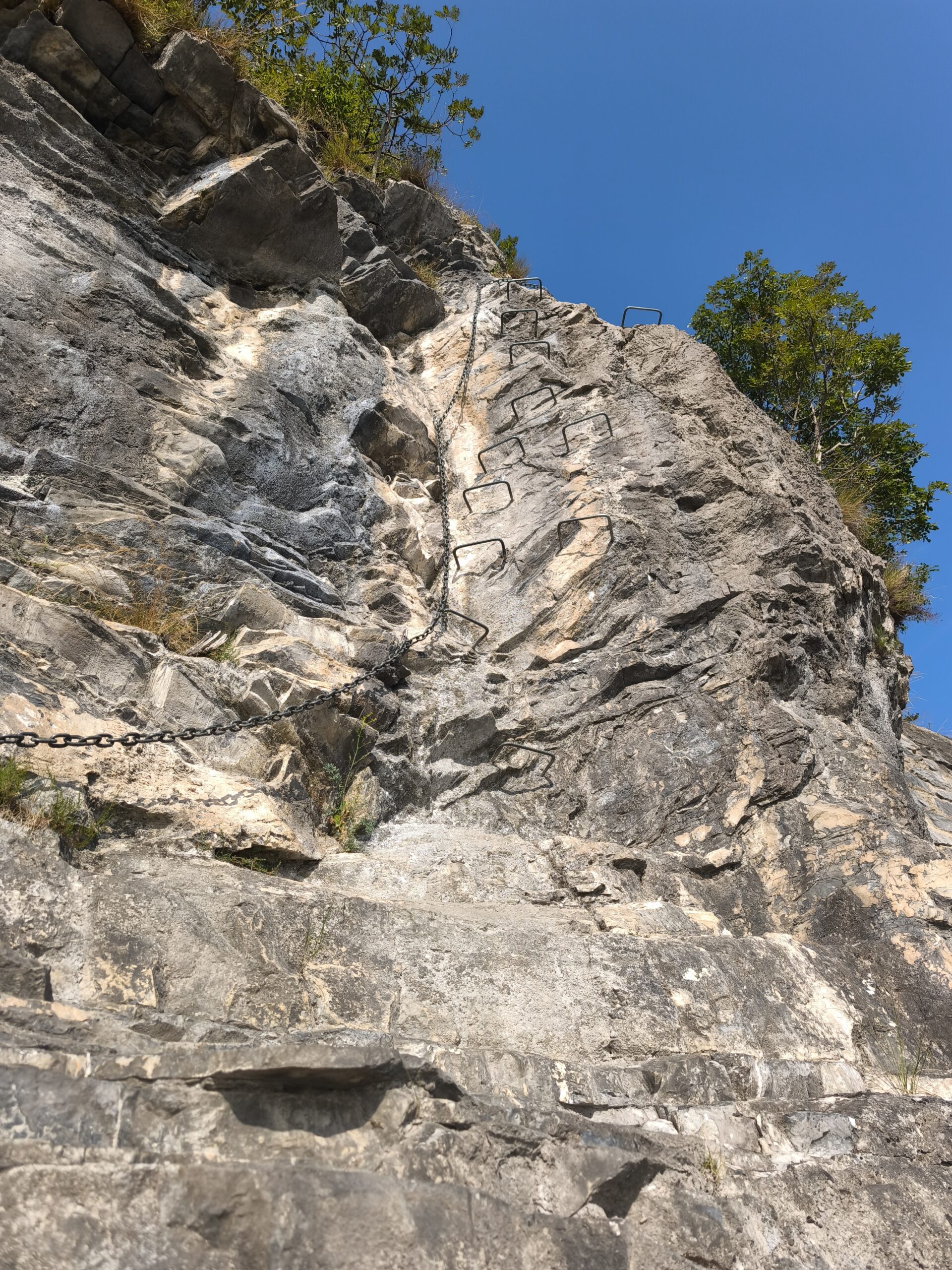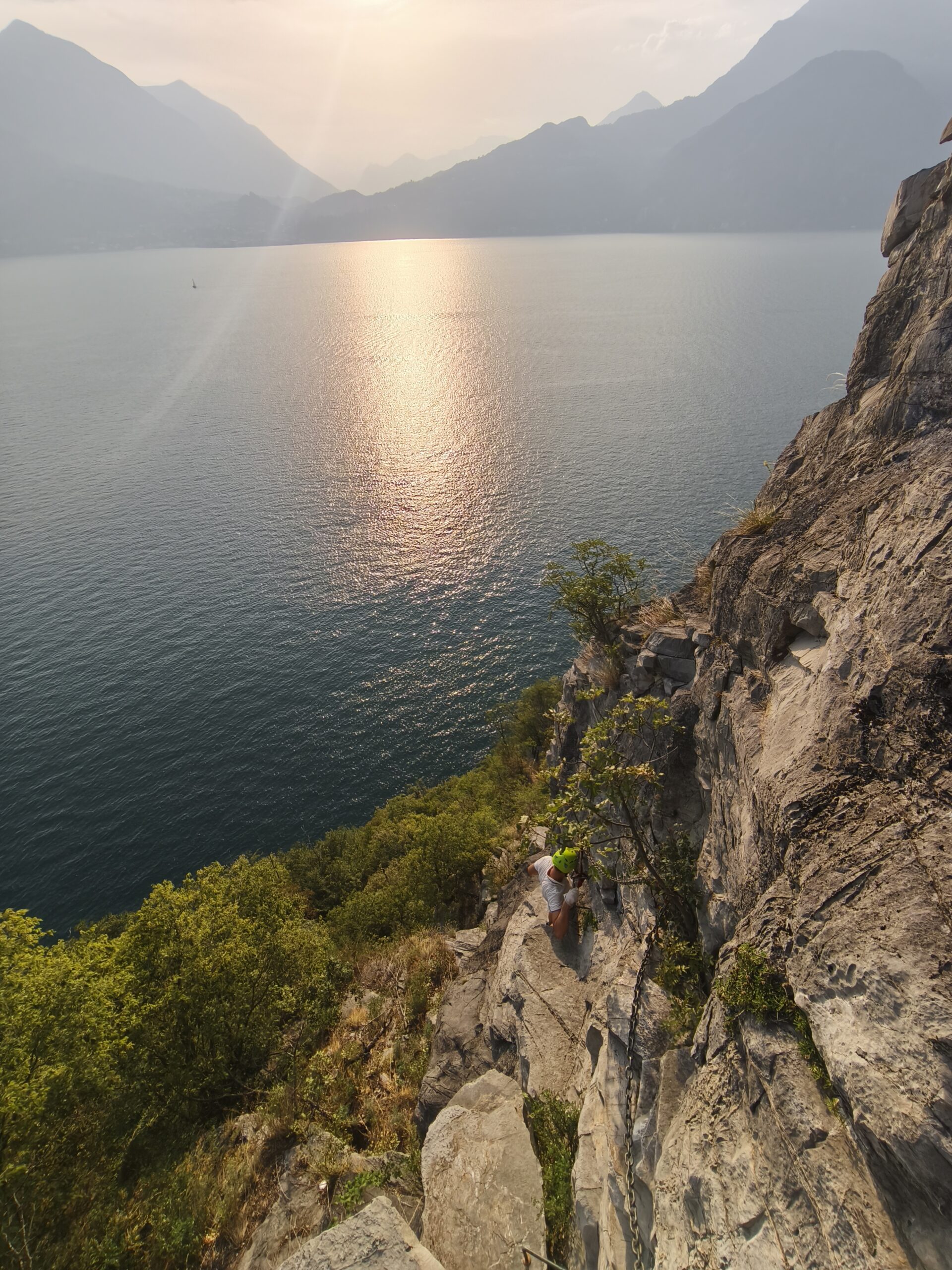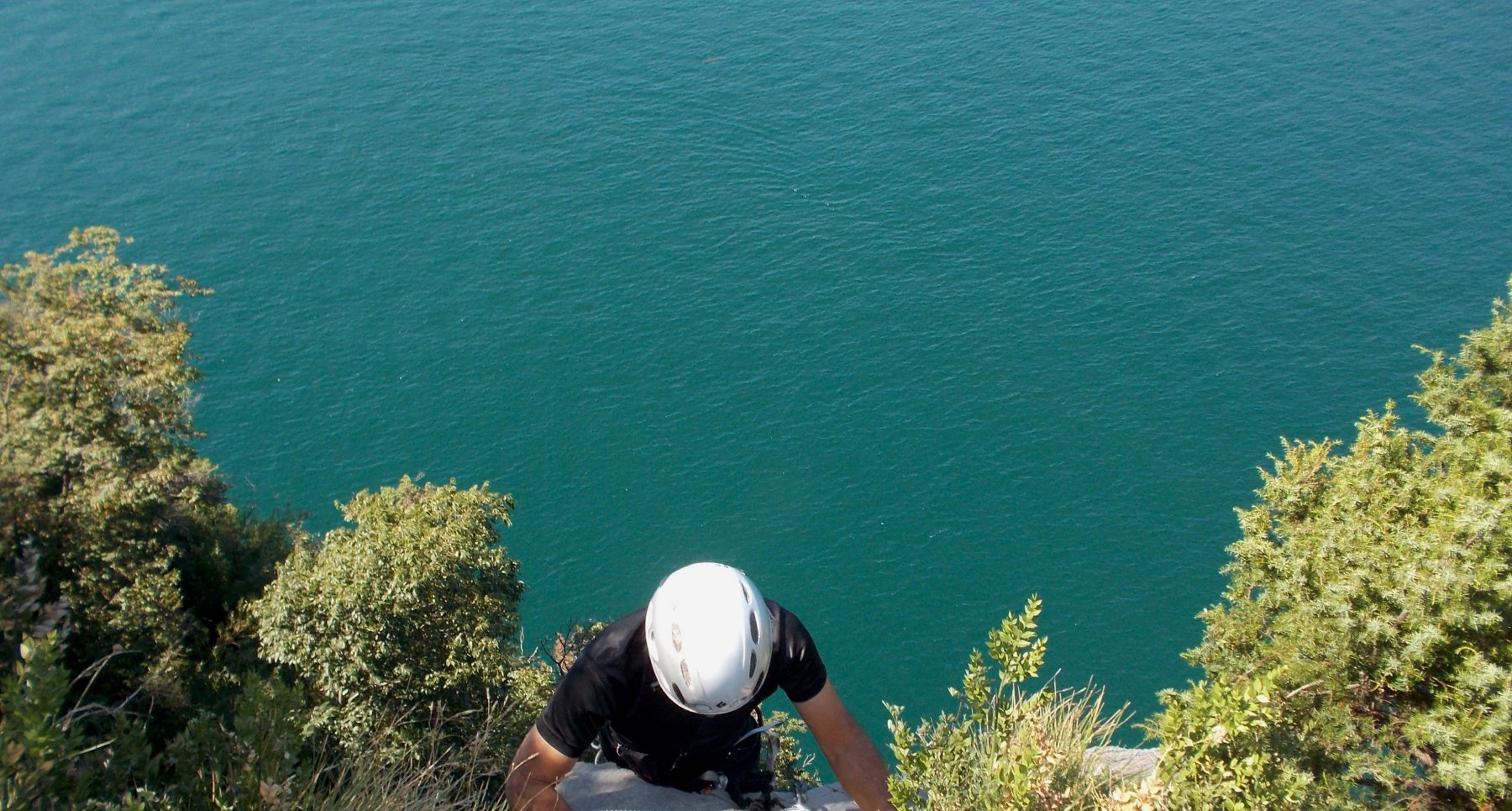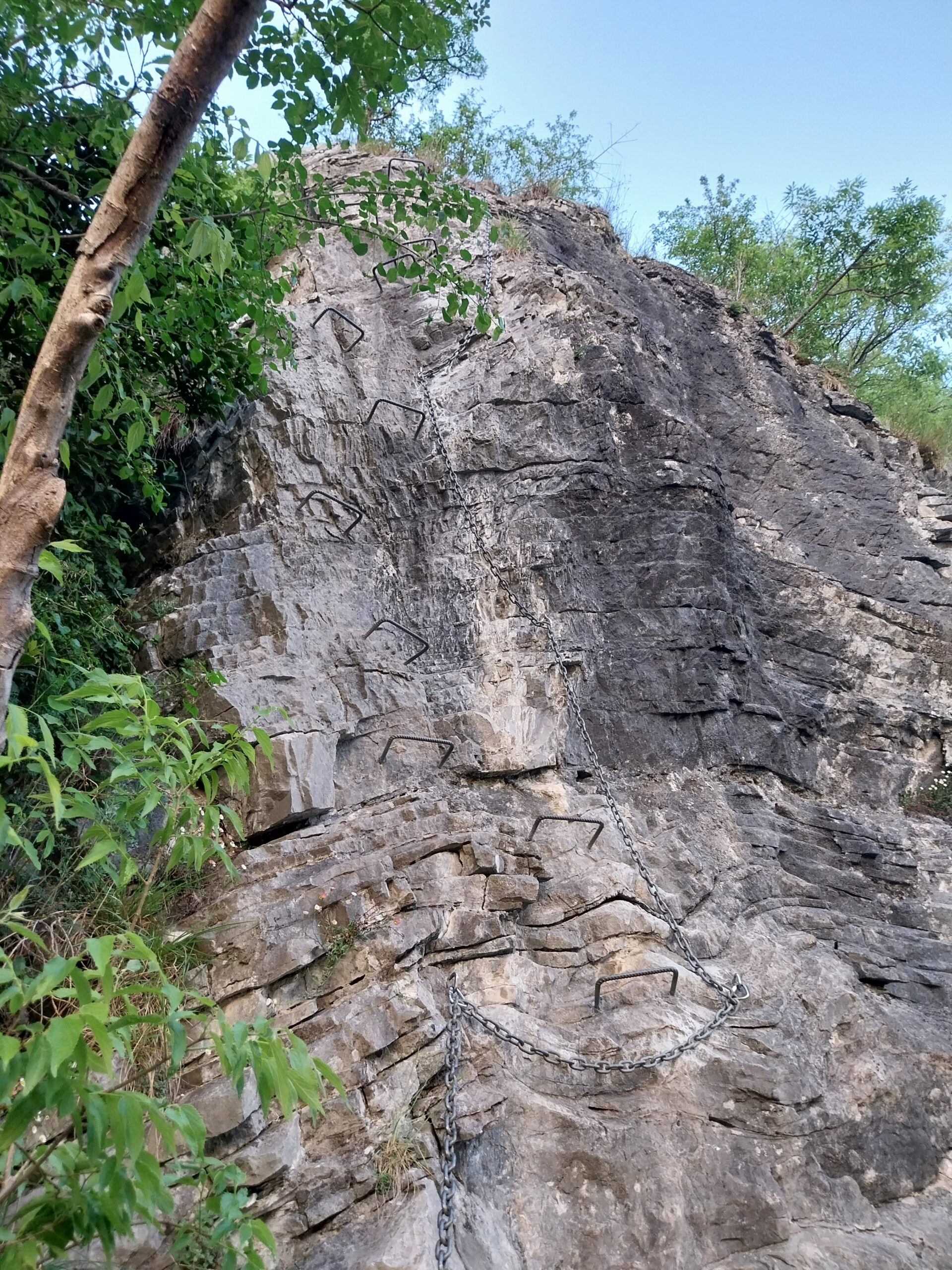 Dall’attacco traversare a sinistra e abbassarsi sfruttando i gradini, superare un primo muretto e portarsi poi a destra per superarne uno più verticale, quasi strapiombante. Raggiunta la sommità della galleria salire in obliquo verso sinistra alternando passaggi su roccia a tratti con terra ed erba. Proseguire lungo un sentiero con cavo sino a raggiungere un muretto attrezzato con vecchi pioli arrugginiti oltre i quali si raggiunge un bivio. Sulla sinistra corre il rientro (possibile via di fuga). Prendere la destra e superare alcuni muretti verticali sino ad un traverso verso destra cui segue un’ultima paretina verticale superata la quale si giunge alla fine della ferrata su un balcone panoramico a picco sul lago.
