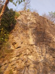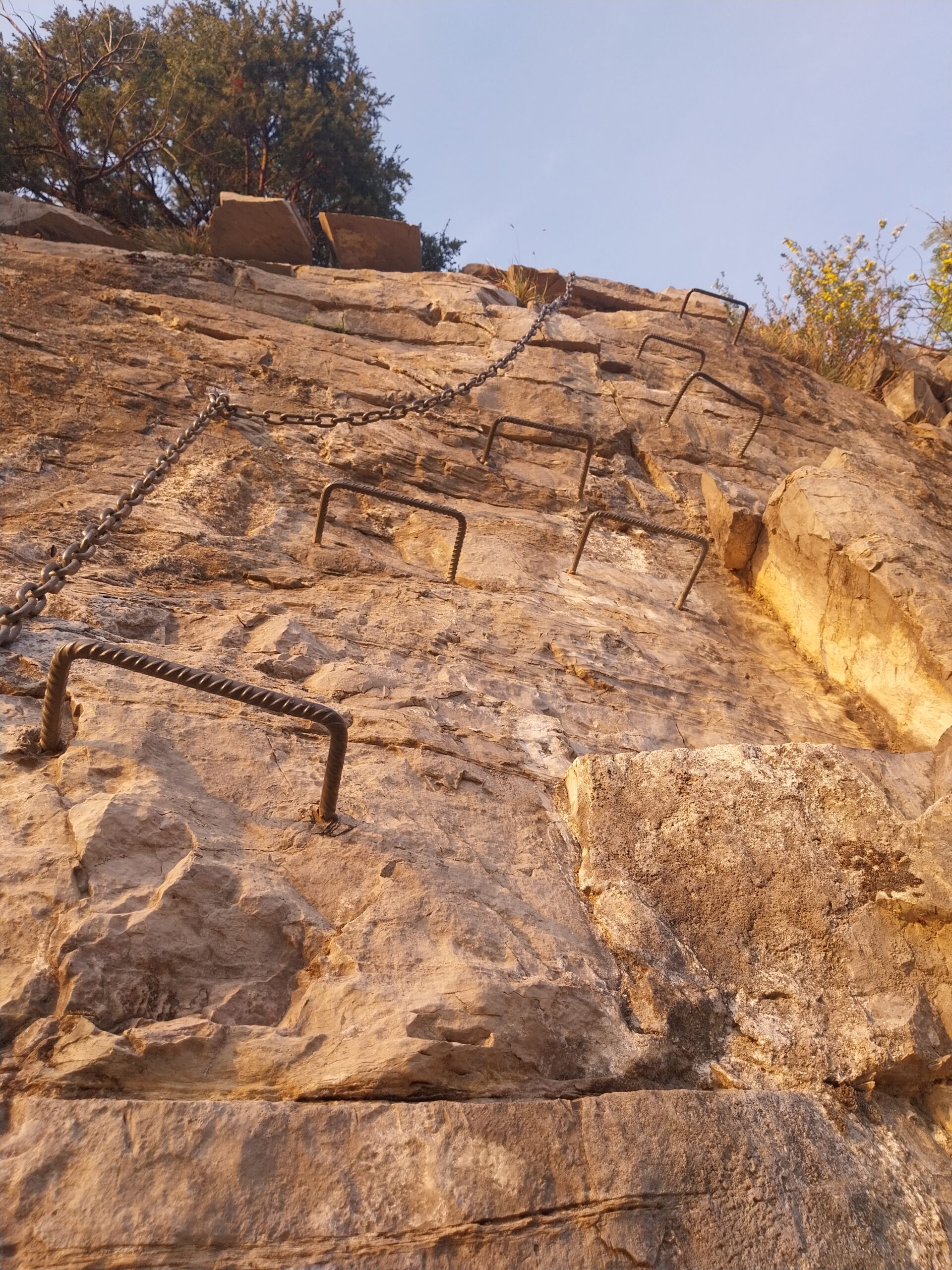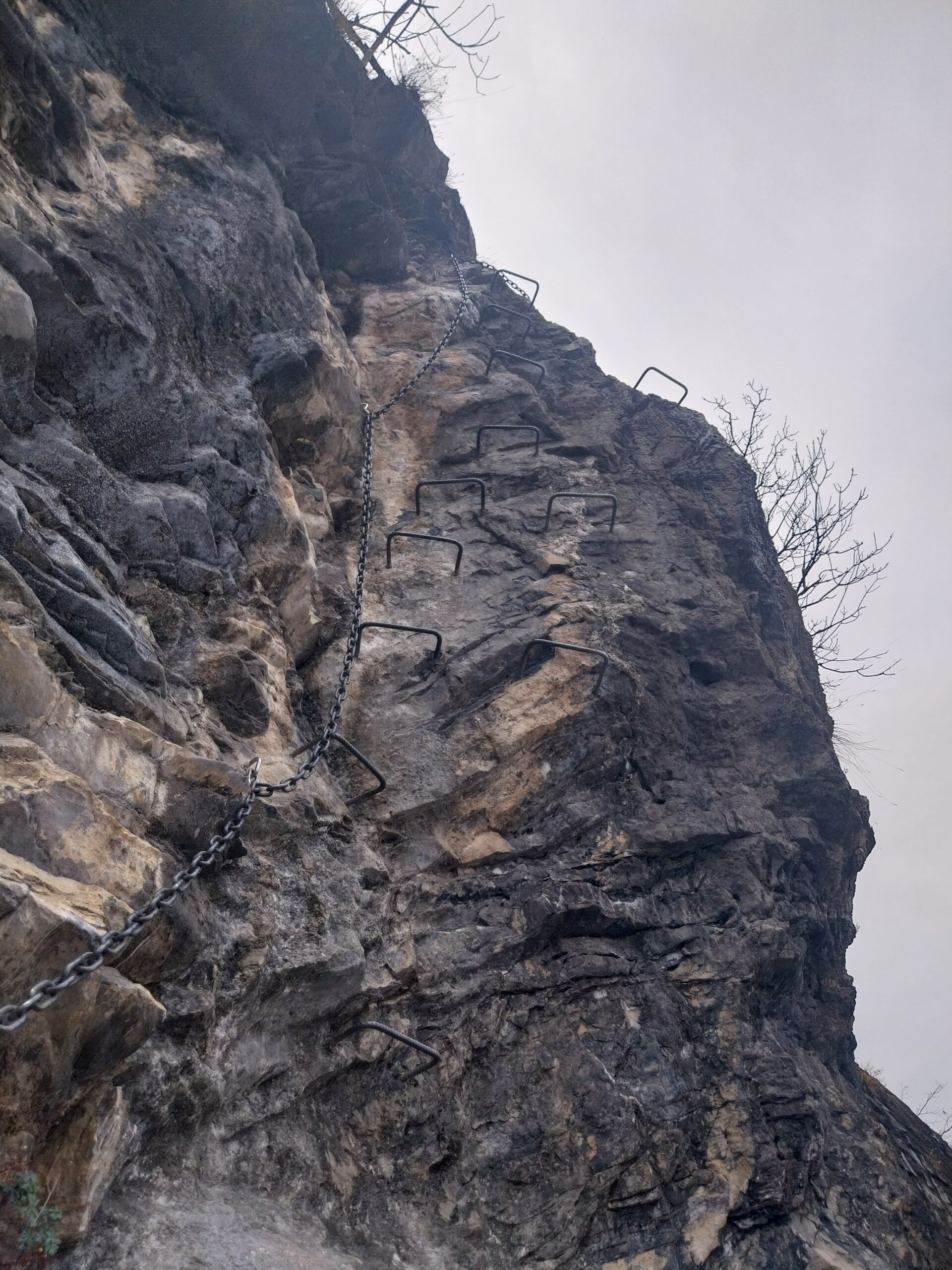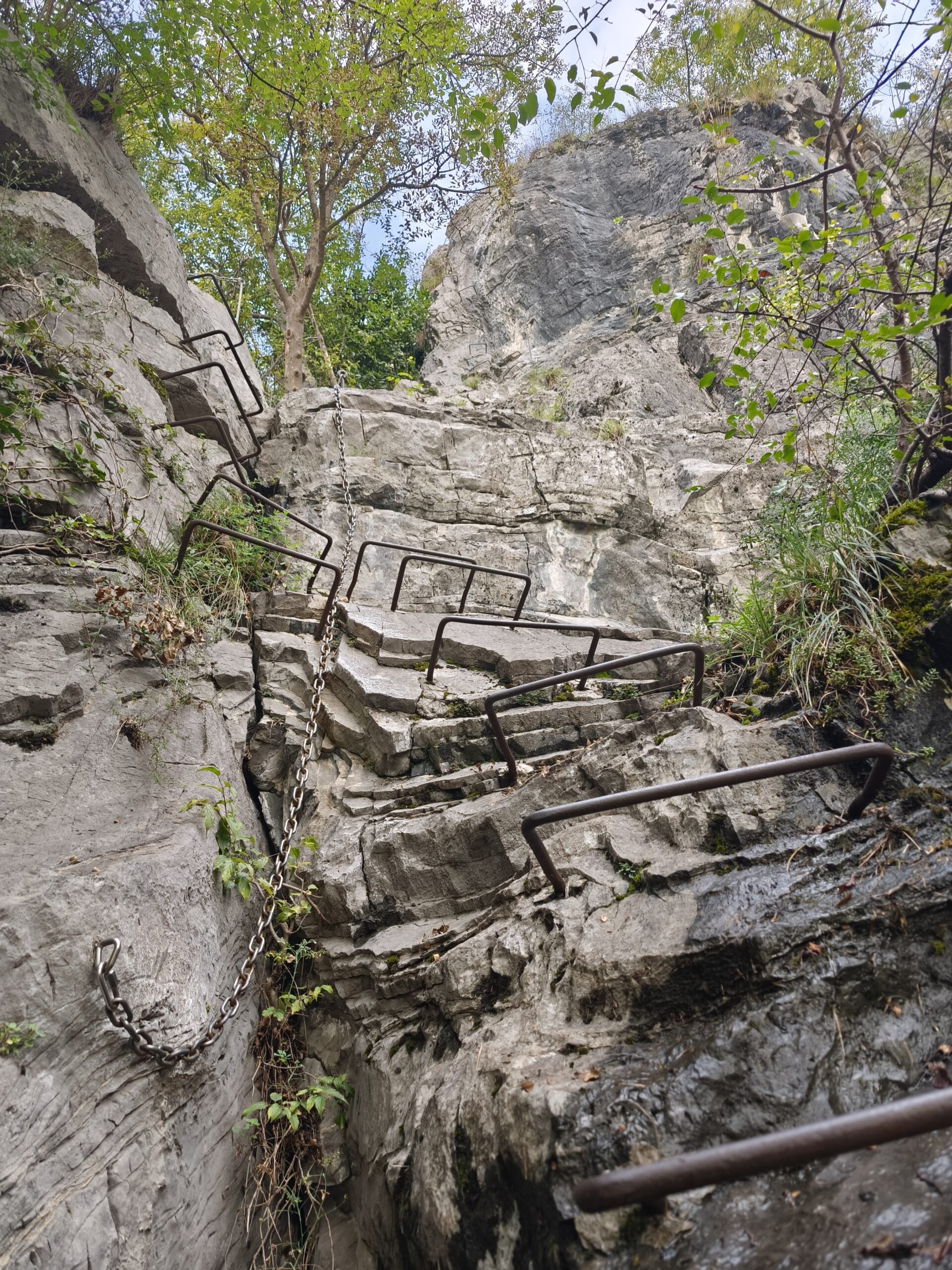 Un cavo metallico conduce a un ripido sentiero di discesa; raggiunta una rete paramassi oltrepassarla sfruttando un buco (pioli e catene). Il sentiero diviene nuovamente tranquillo e continua a perdere quota sino a raggiungere il bivio incontrato durante la salita. Scendere e tenere la destra (visibile un muretto ricoperto di muschio) sino a delle placche inclinate che conducono proprio sopra la galleria. Qualche passaggio e si è nuovamente sulla strada provinciale e quindi alla macchina.