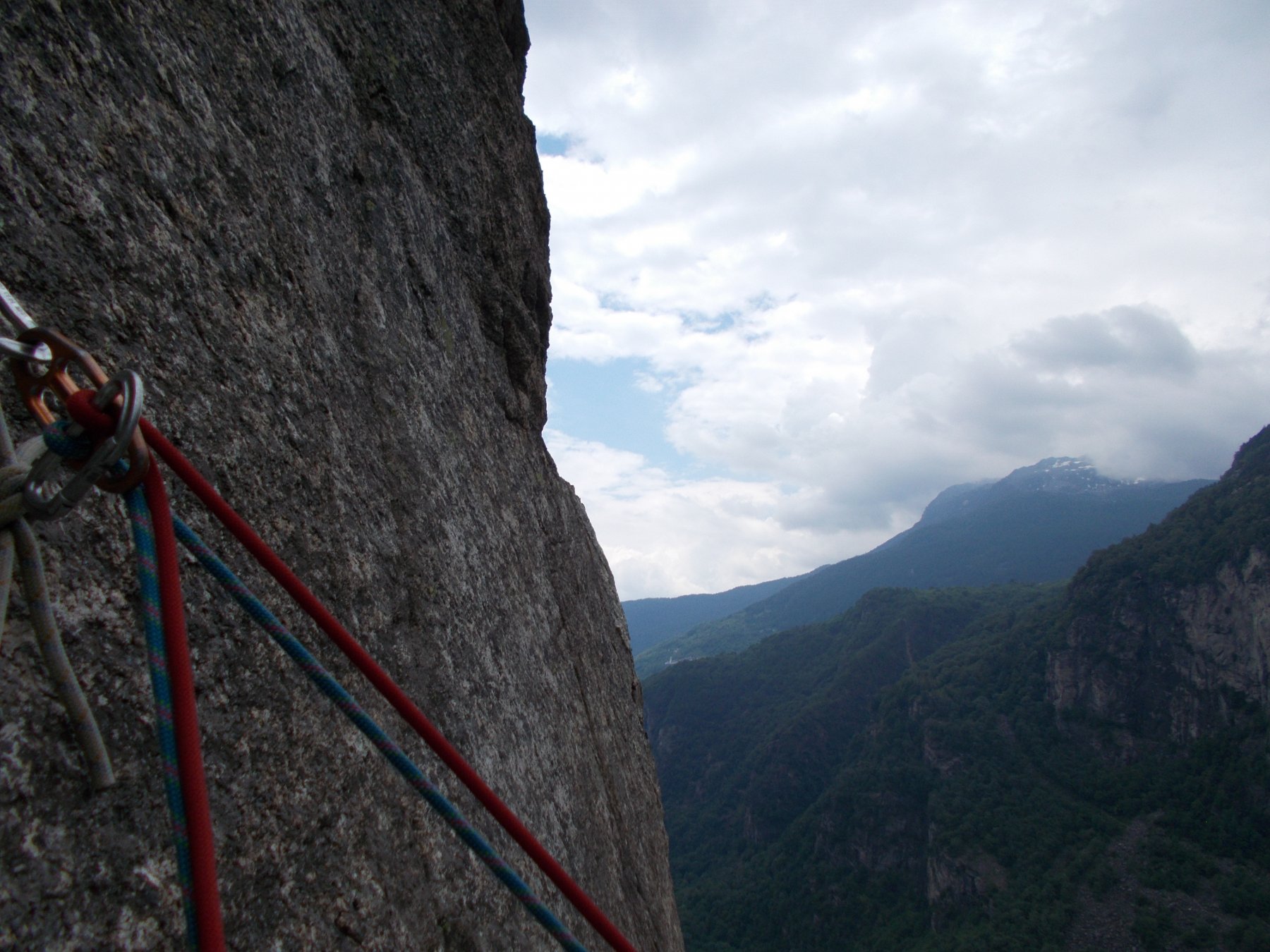 Qui finisce lo spigolo: possibilità di scendere lungo gli ultimi 3 tiri della via in doppia, poi per sentiero, oppure calate su Intossicazione alcolica che termina sulla stessa sosta.