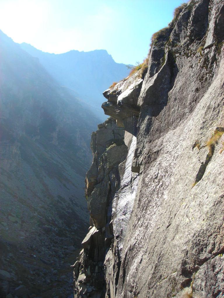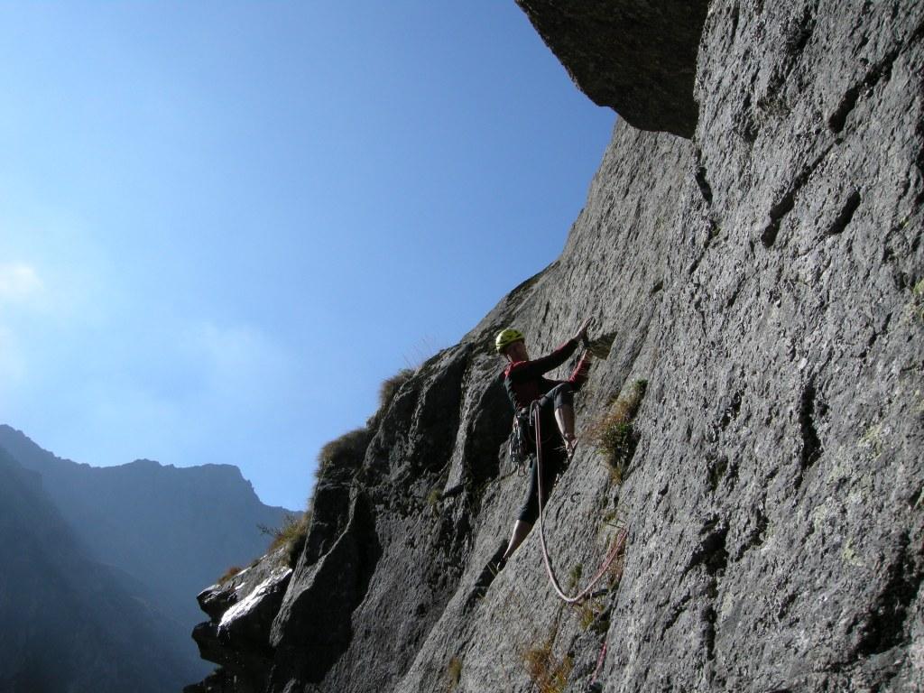L2: dalla sosta andare a sinistra con traverso esposto 5b fino ad un diedrino poco definito che si segue facilmente fino alla S2 (di “Alchimia”)