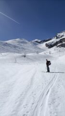 Partiti con sci ai piedi dal posteggio di Palanfrè un po’ dopo le nove, gran caldo che però si attenua nel vallone grazie ad un bel vento teso. Neve continua su tutto il percorso che è ben tracciato fino alla cima. Discesa divertente su neve trasformata nella parte alta, in basso la neve si fa più pesante e bagnata rendendo la sciata più faticosa.