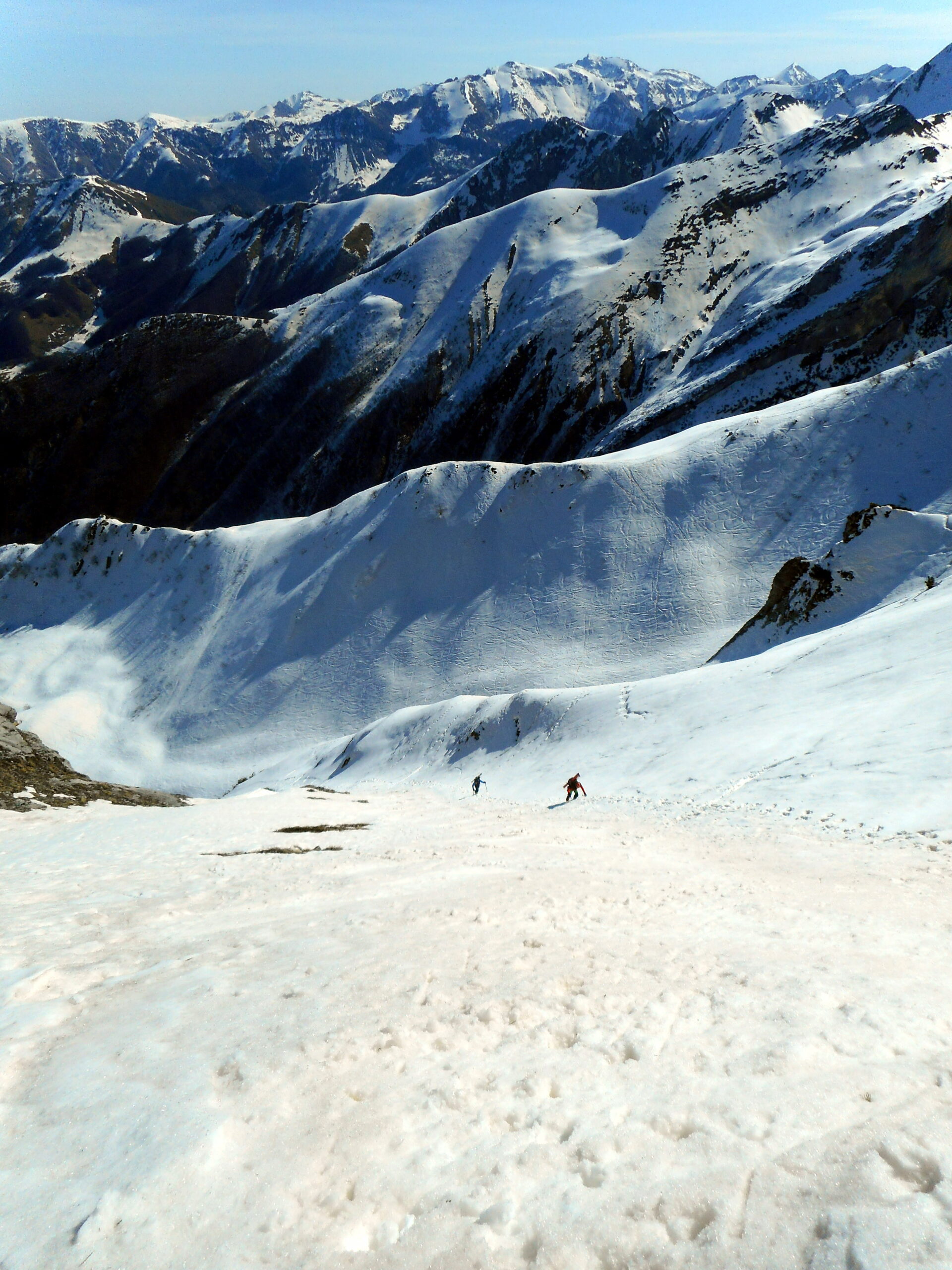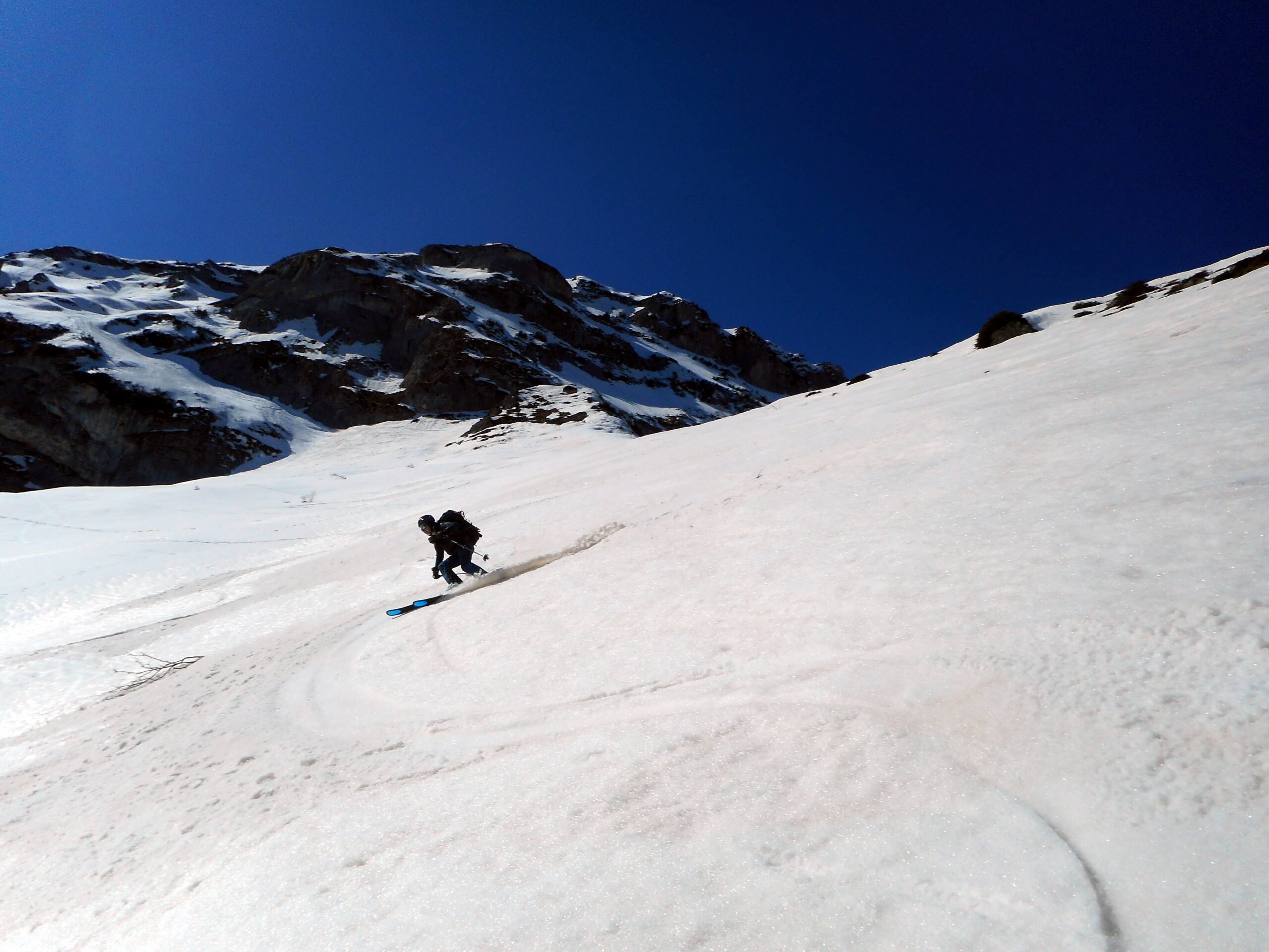 La parte alta è ormai agli sgoccioli ma oggi si è ancora lasciata sciare. Strettoia in ombra stretta e su neve duretta ma è breve, la cengia basale su neve crostosa sincera, il resto un bel primaverile che rende!