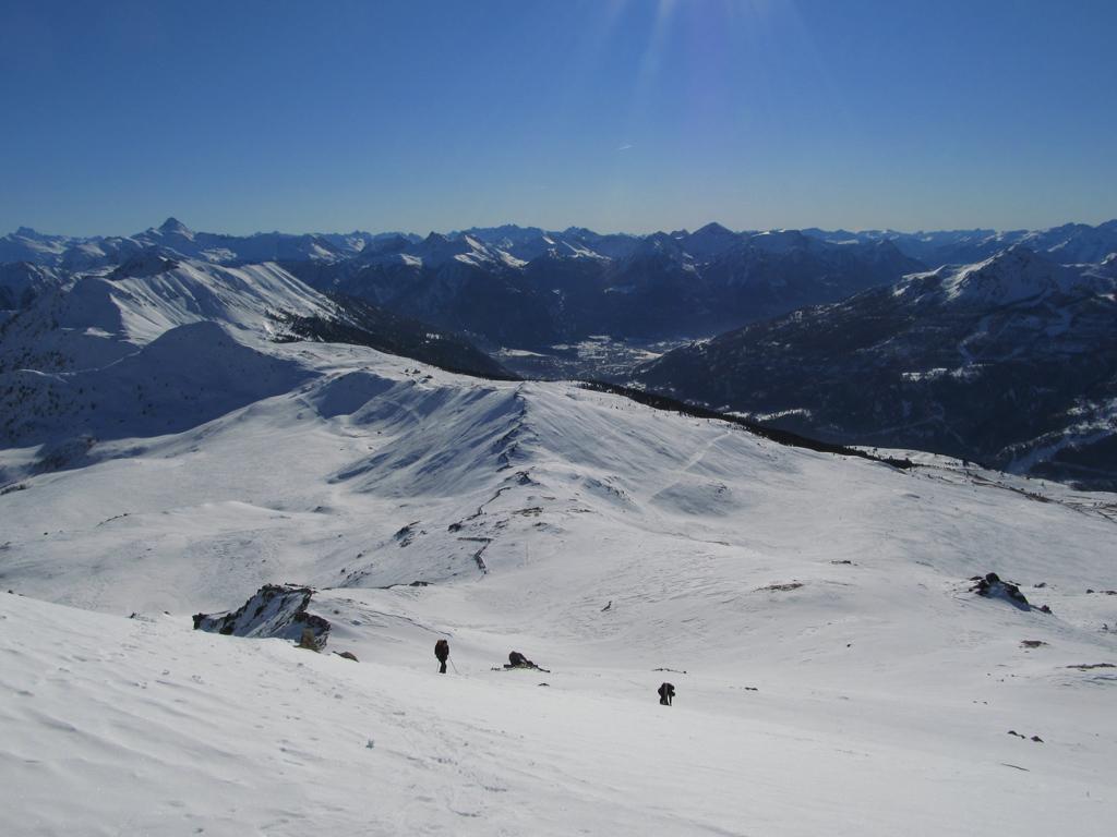 Per la discesa si può ripercorrere la via di salita, oppure una volta sceso il pendio terminale, si può piegare a sinistra, direzione Est, andando a raggiungere la marcata dorsale che si sviluppa fino al Col du Granon. Da qui per i dolci pendii si scende andando a ritrovare il percorso di salita all’altezza della strada del Granon a 2250 m, e da qui per la via di salita.