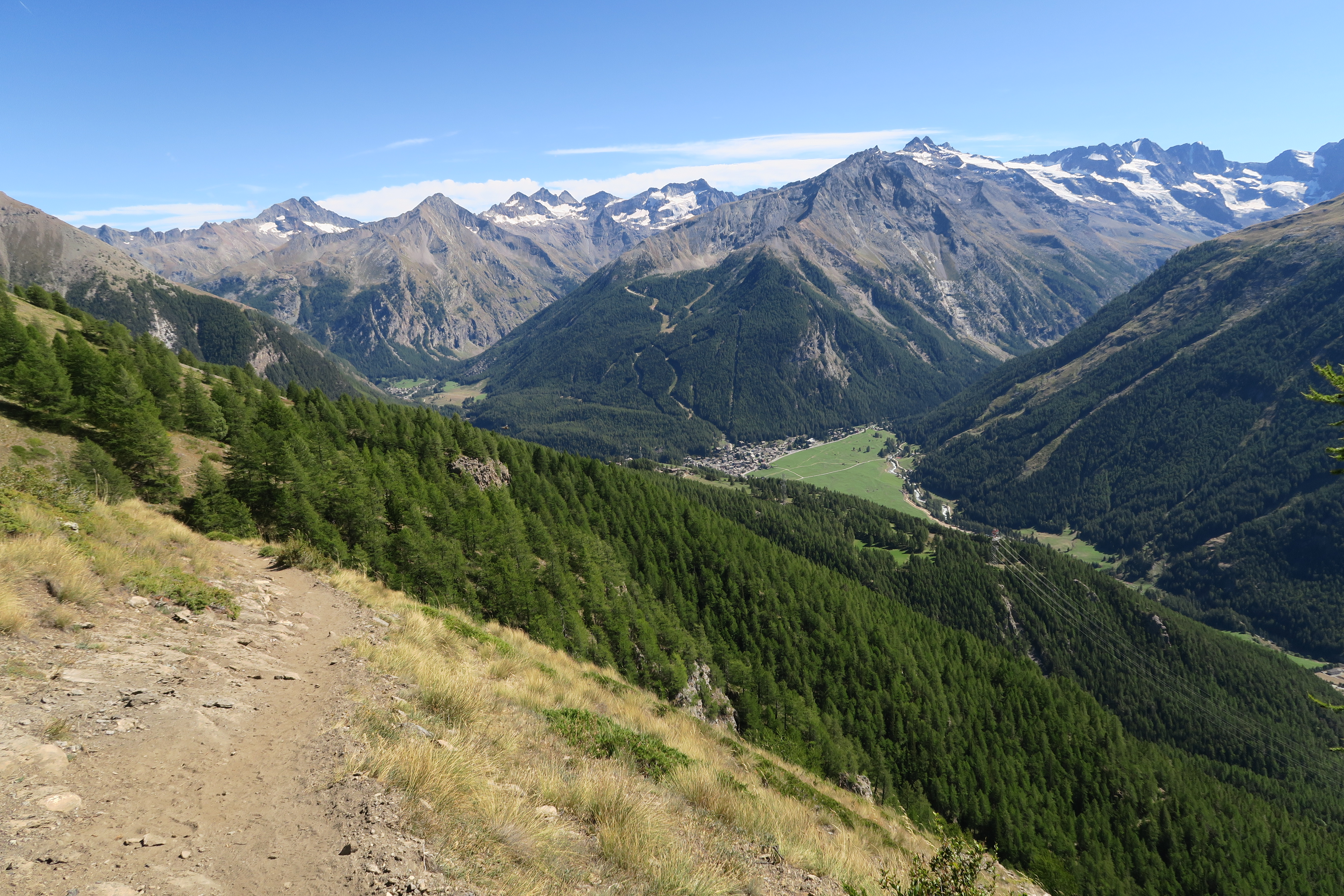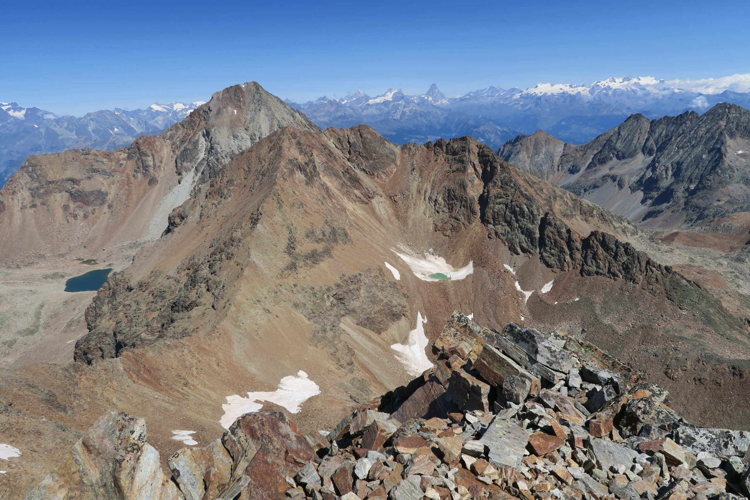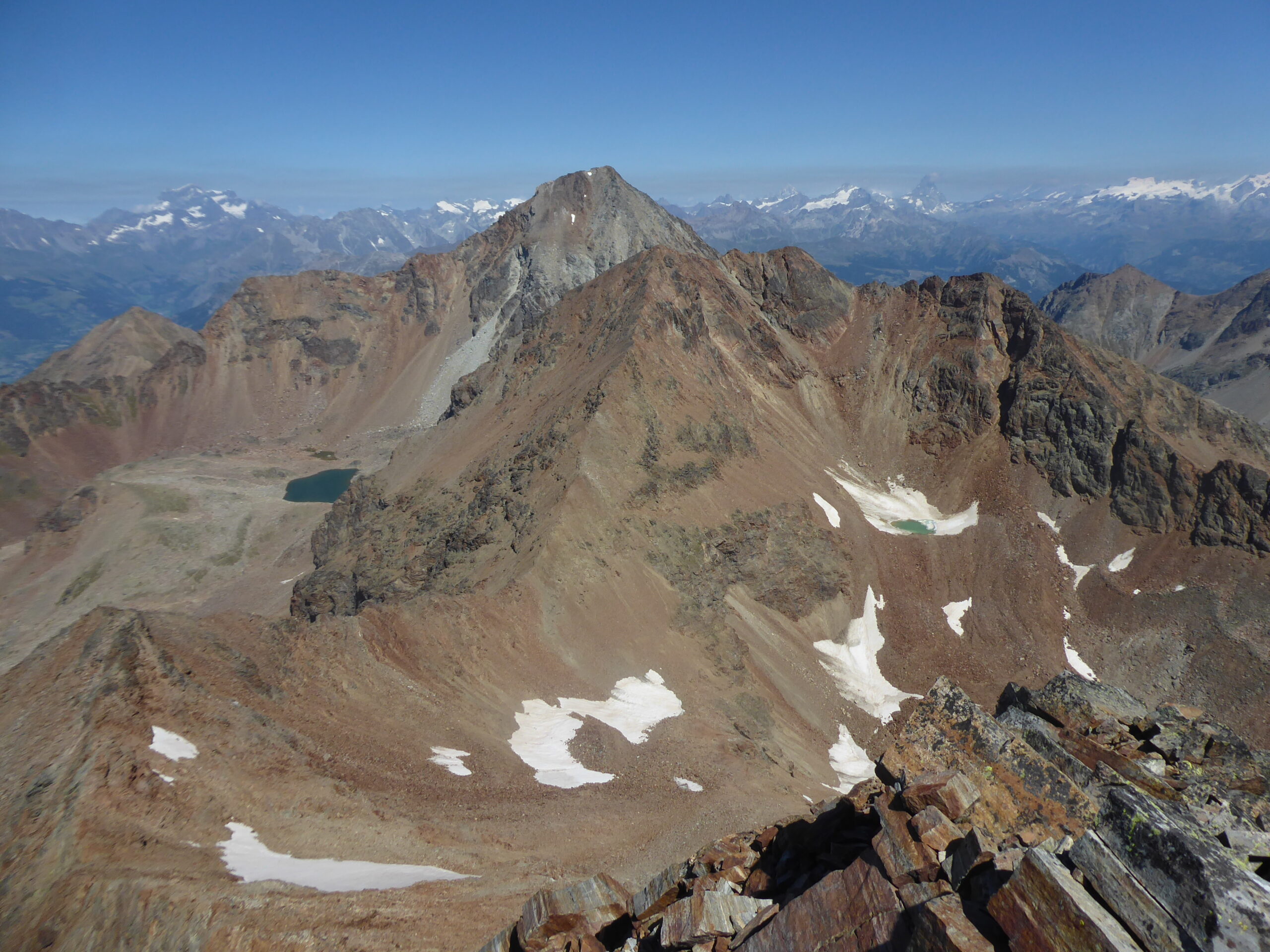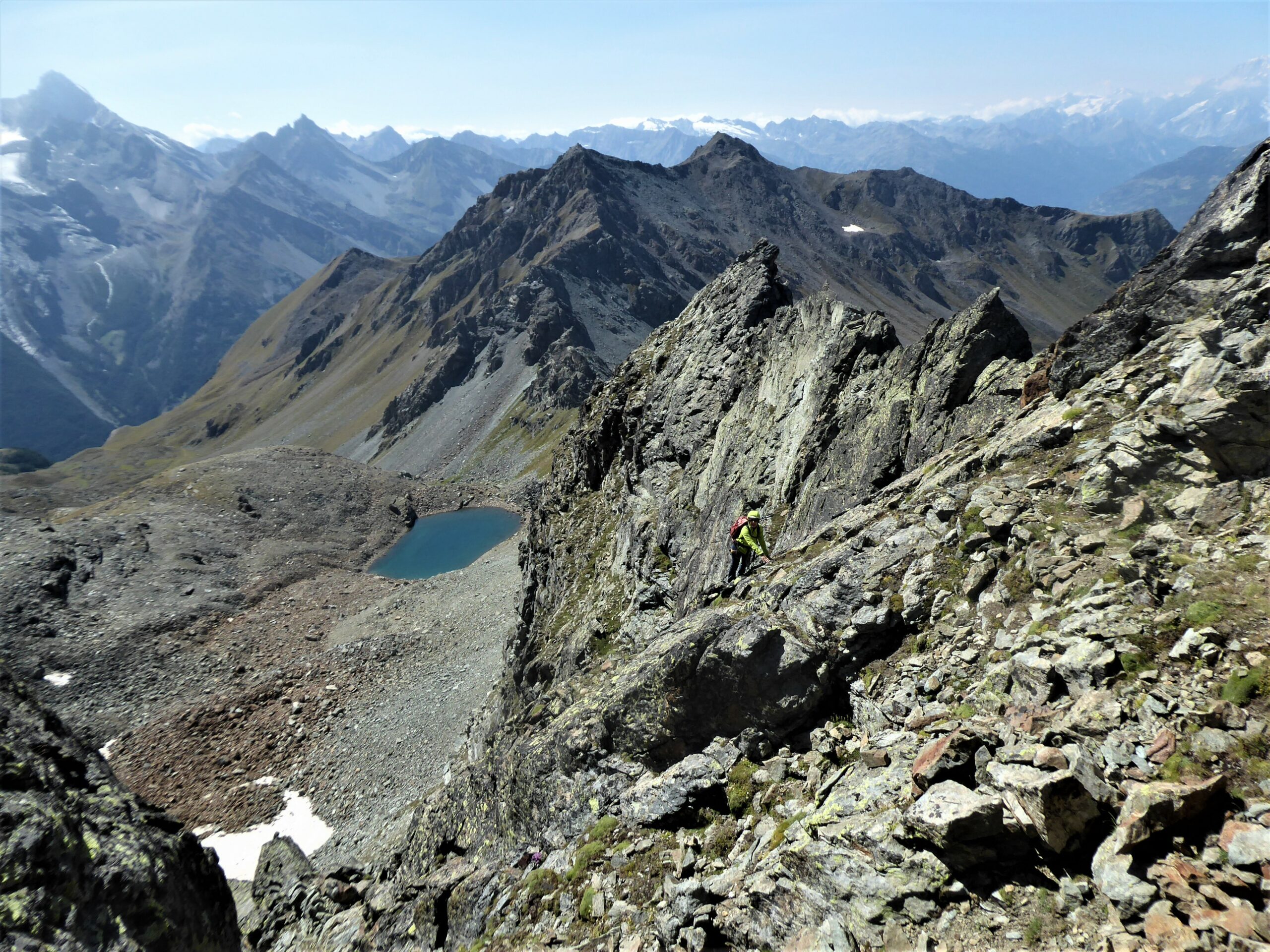 Versante nord, si scende senza percorso obbligatorio con qualche passo di I° sino a quando la pendenza diminuisce e per cresta facile (passi di I) si raggiunge la vetta del mont Valaisan (3296) (grosso ometto). Da qui si gira a sinistra SW e traversando su sfasciumi ci si porta sul pendio sempre di sfasciumi che scende direttamente al lago Garin. Da qui si trova il sentiero che riporta a Gimillan chiudendo così un bel anello.