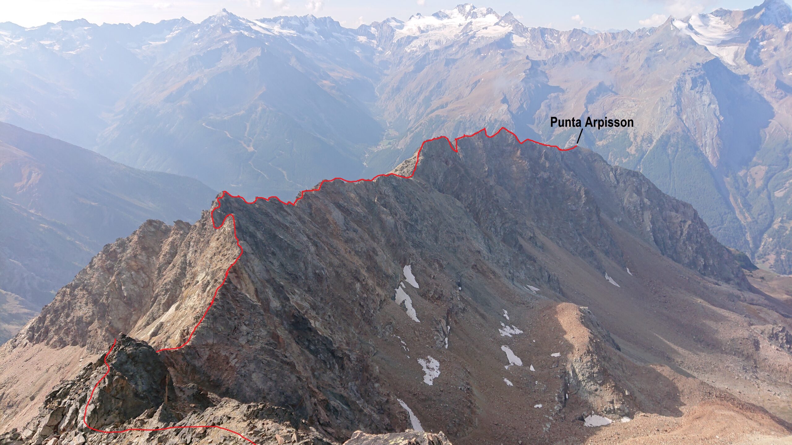 Da Gimillan prendere sentiero per la punta Tsaplana (2677), ci sono varie alternative per arrivarci, una volta raggiunta la vetta dove è posta una madonnina, si prosegue lungo la ripida dorsale su vaghe tracce sino alla vetta della punta Arpisson (2978) dove inizia la cresta da percorrere.Prima parte molto facile sino al col Pila SW (3028), poi si incontrano i primi passaggi di I-II° e dopo un tratto di cresta detritica si raggiunge la prima punta Coppi SW (3215), si traversa la Coppi centrale (3220) e si raggiunge la Coppi NE (3231) con divertenti passaggi (II°). Si continua sempre in cresta per raggiungere la torre di Arpisson (3231), che è formata da una serie di 7 torrioncini che si traversano in cresta (I-II°, passi di III°). Dopo la cresta diventa più affilata ed esposta, e sempre dopo vari saliscendi si raggiunge la punta Lavà (3214). Si prosegue sempre con difficoltà di I-II° per raggiungere la punta Fleurie (3260). Si scende all’intaglio della Garin (possibilità di scendere nel vallone di Crot Fleurie a riprendere il sentiero alle alpi Grauson vecchie) Si inizia ora il tratto di salita alla Garin (3451), superando ancora qualche gendarme, stando in cresta difficoltà sul II°, stando leggermente sulla destra si sale più facilmente. Senza ulteriori difficoltà si raggiunge la vetta.