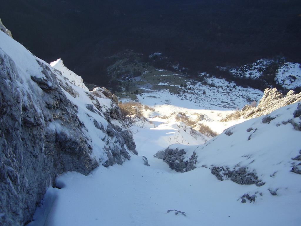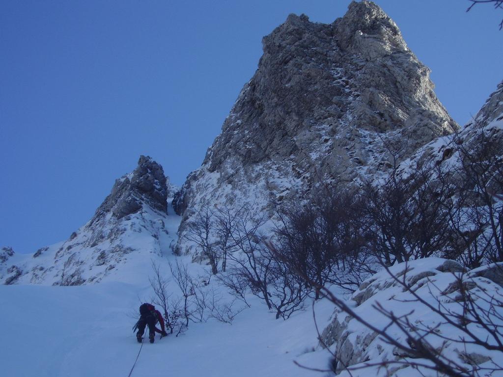 N.B. La via inizialmente presentava soste a spit o chiodi, ma per la quantità di neve accumulata quest’anno e il ghiaccio sulle pareti, abbiamo trovato solamente il primo spit all’attacco, e una sosta a metà canalino in alto (sostituito il cordino). Abbiamo lasciato in loco tre soste attrezzate (anche per eventuale doppia), non tutte buone.