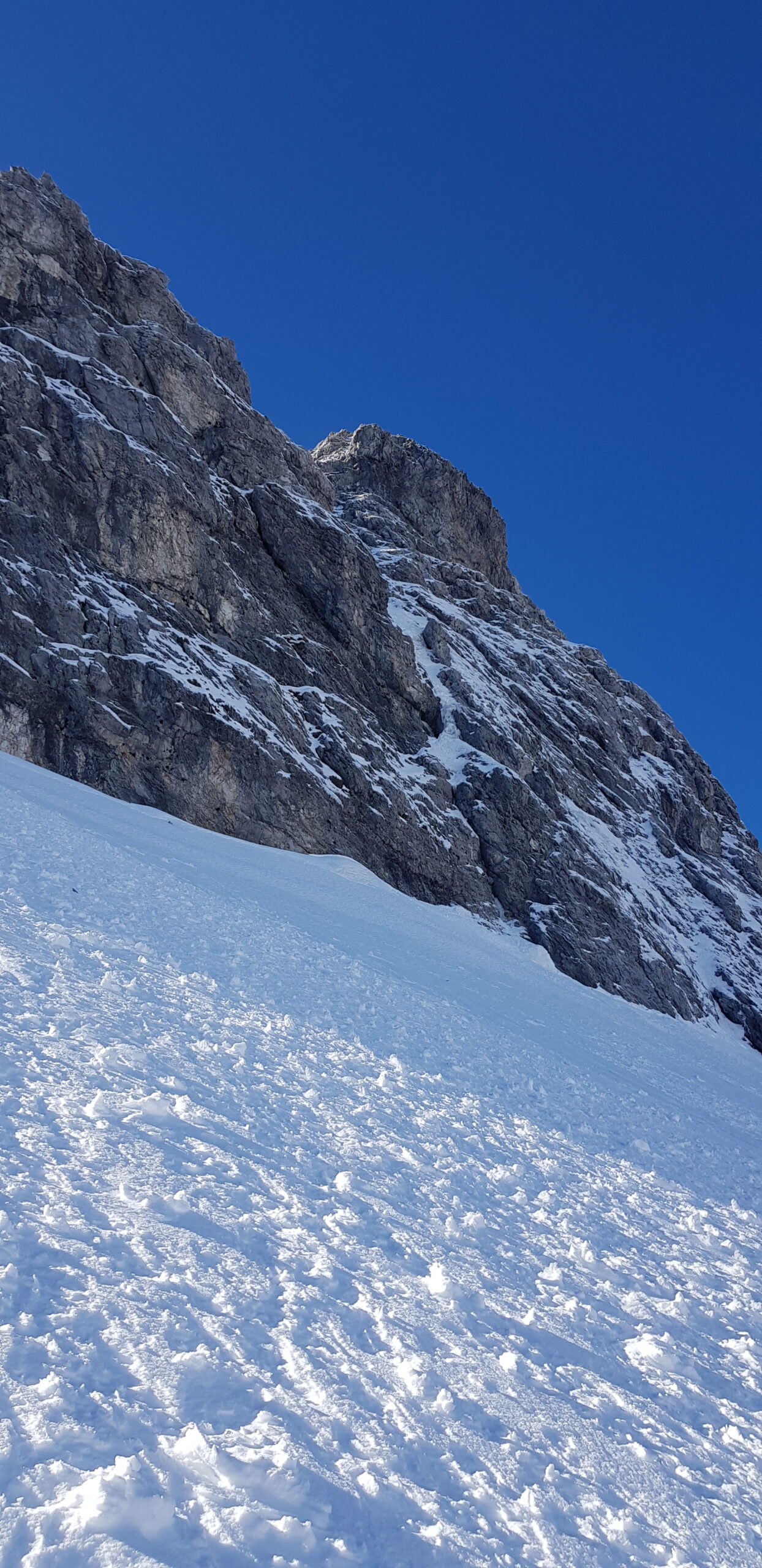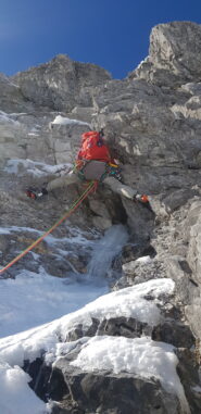 L1: Alla data della nostra ripetizione si era formata una colata all’interno del piccolo diedro basale. Questa era effimera ed è stata demolita dal nostro passaggio, infatti la seconda cordata ha dovuto fare ulteriori agganci a secco. Dopo una placca di neve ben trasformata abbiamo trovato una bella candela verticale e super lavorata dal vento. La si supera con passi atletici che conducono ad un canale incassato molto estetico che termina a destra in una piccola insenatura dove si attrezza sosta con friend e chiodi. Oltre 60 metri, M5/85°/AI4