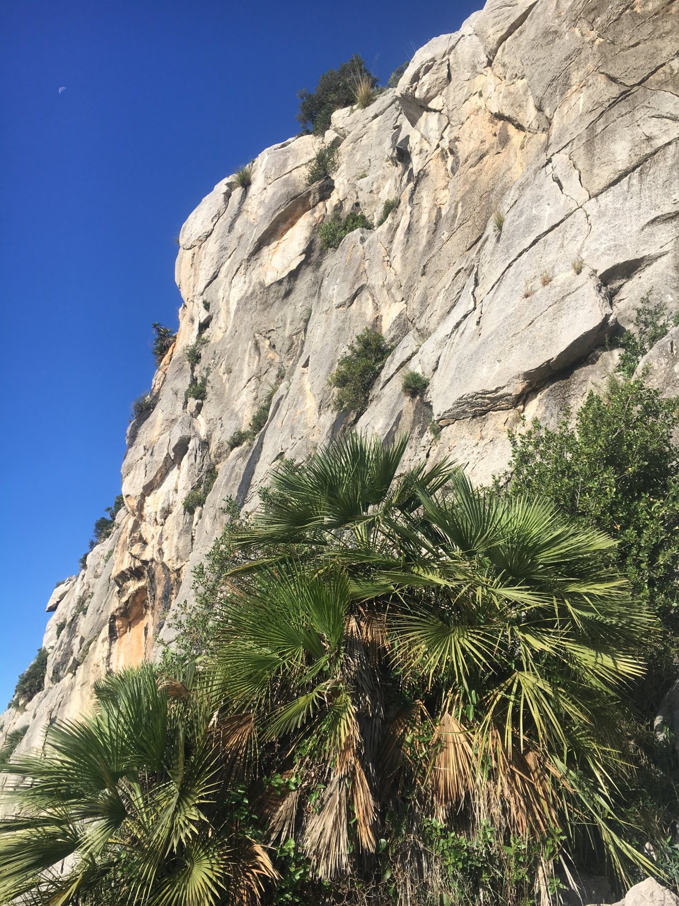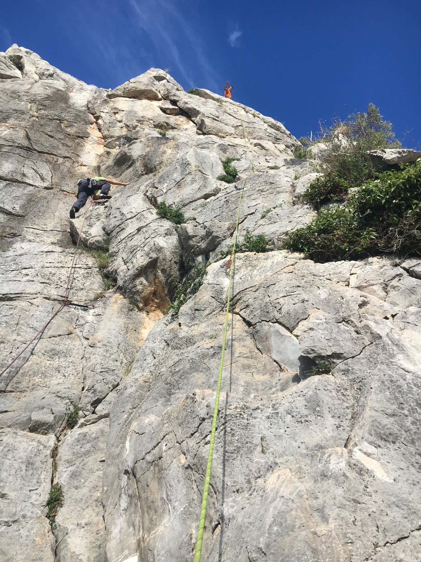 La base della parete è ricca di vegetazione, roccia calcarea ottima ma un pò consumata in alcuni appigli.