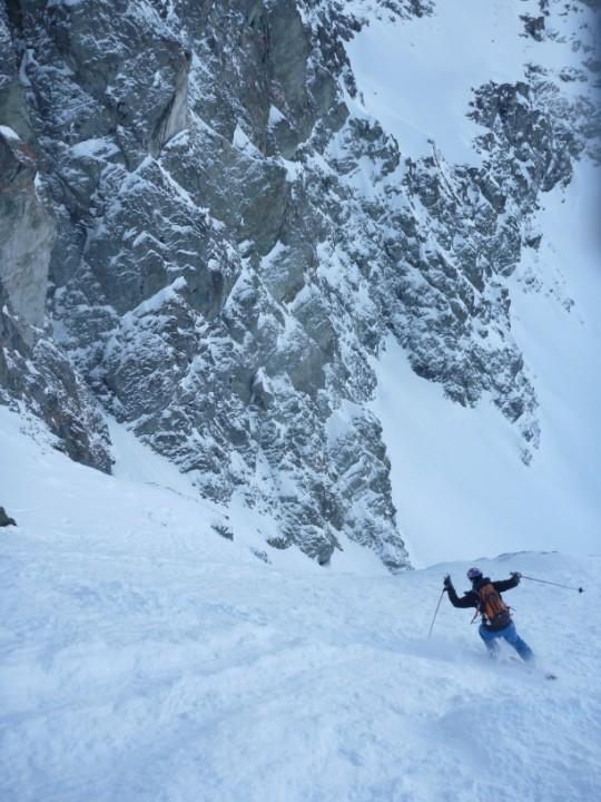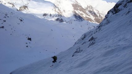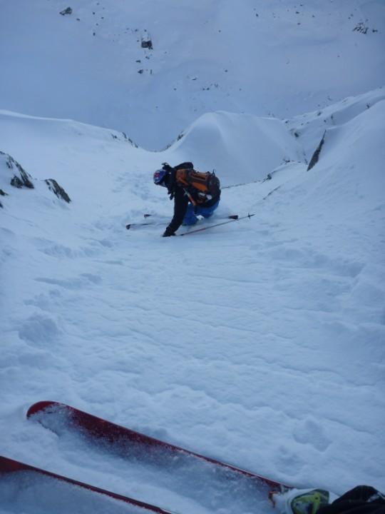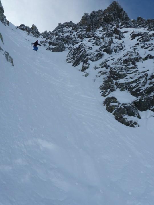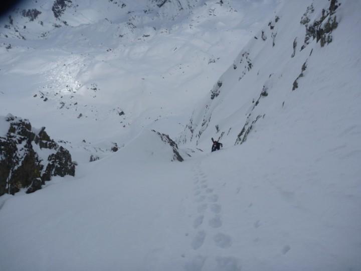 Salita la rampa già in ottima neve arriviamo al traverso che da accesso al canale,tutto stabile,neve buona e si passerà ski ai piedi in discesa,BENE ! La rampa sospesa adesso diventa canale ed inizia a vedersi il passaggio di misto,passaggio che però si aggira da destra (salendo) e che in discesa non presenterà nessun problema;il morale da prima buono è ora ottimo e l’ultimo terzo di canale vola tra pensieri stupendi.