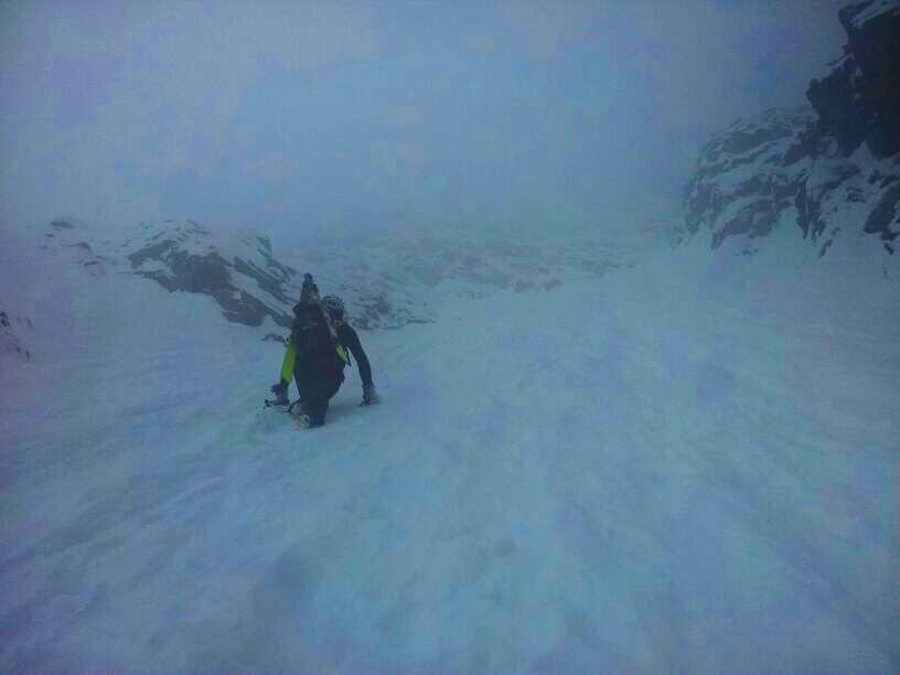 Partiamo con tempo maffissimo e speriamo si possa aprire. Fin che possiamo seguiamo alcune tracce di discesa che arrivano dal 2Dita poi raggiungiamo la conoide della Gastaldi, dove notiamo un fondo di valanga abbastanza grande. Luke mi dice: arriviamo fino al roccione e poi vediamo com’è..