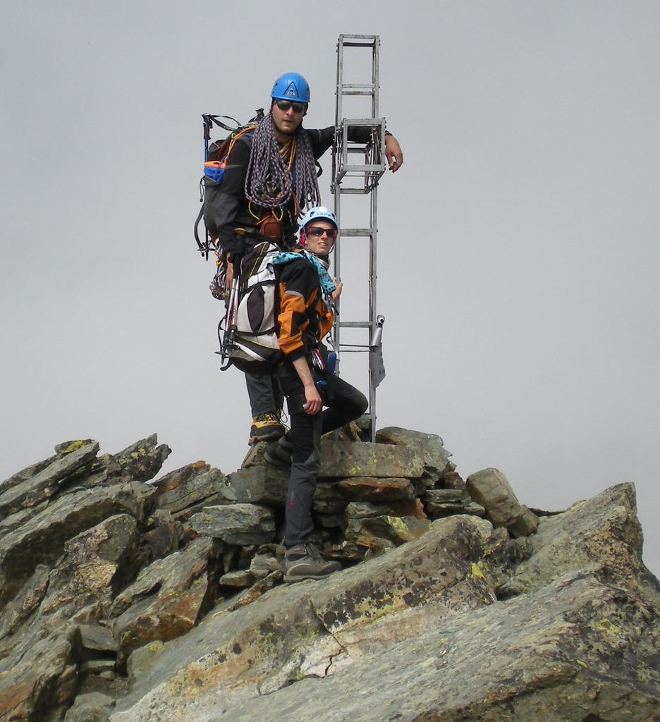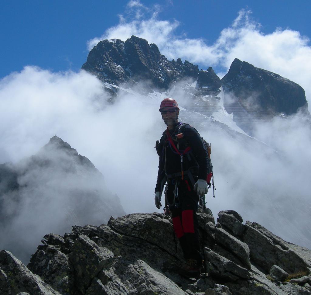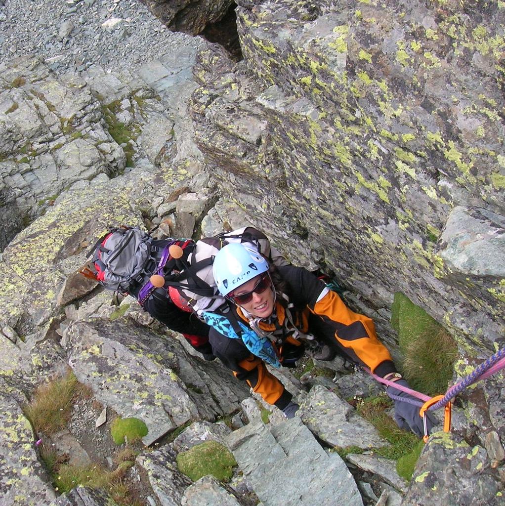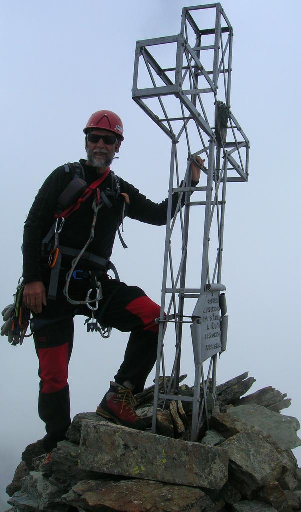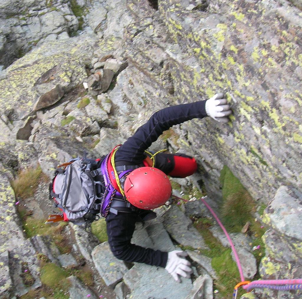 Saliti dal Pian del Re fino al Passo Giacoletti (ben attrezzato),si scavalca il passo, si attravera su placche (presenti catene, utili se le pietre fossero bagnate),si scende fino al lago e da qui si risale un po’ verso il diedro di attacco (indicazione freccia gialla), segnato con cerchio bianco.Fatti due tiri fino allo spigolo della cresta,in seguito altri due tiri,(presenti spit in loco per soste e anelli per fare le doppie in discesa),il dopo fino in vetta è facile e ci siamo slegati.Giunti in vetta poco dopo è giunta anche la nebbia.In discesa per sveltirci abbiamo fatto tre doppie.Ed è così che ho trascorso un altra piacevole domenica con Renzo e Chiara