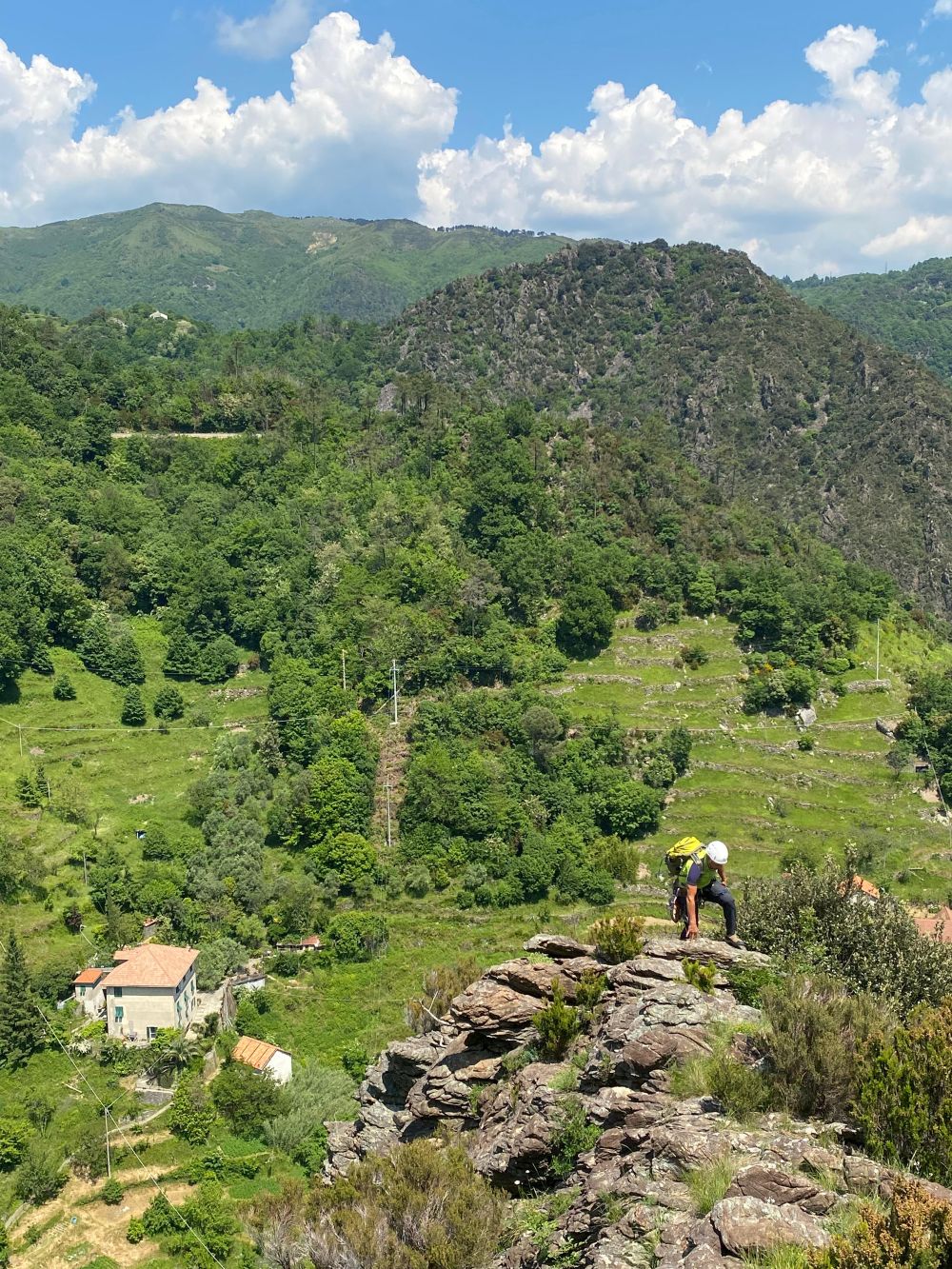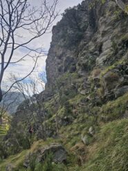 Dall’albero di sosta, trasferirsi in piano verso sinistra (faccia a monte) per circa 20 m sino a raggiungere la gengiva dell’evidente spalla rocciosa. Con bella arrampicata di III e VI grado si guadagna la sommità della spalla. Alla fine del tratto roccioso (circa 25 metri) è presente una sosta (2 placchette collegate con spezzone + anello di calata) funzionale per discesa in doppia o ritirata. Meglio proseguire per altri 25 m su pietraia sino a raggiungere un albero con cordone verde e maglia rapida.