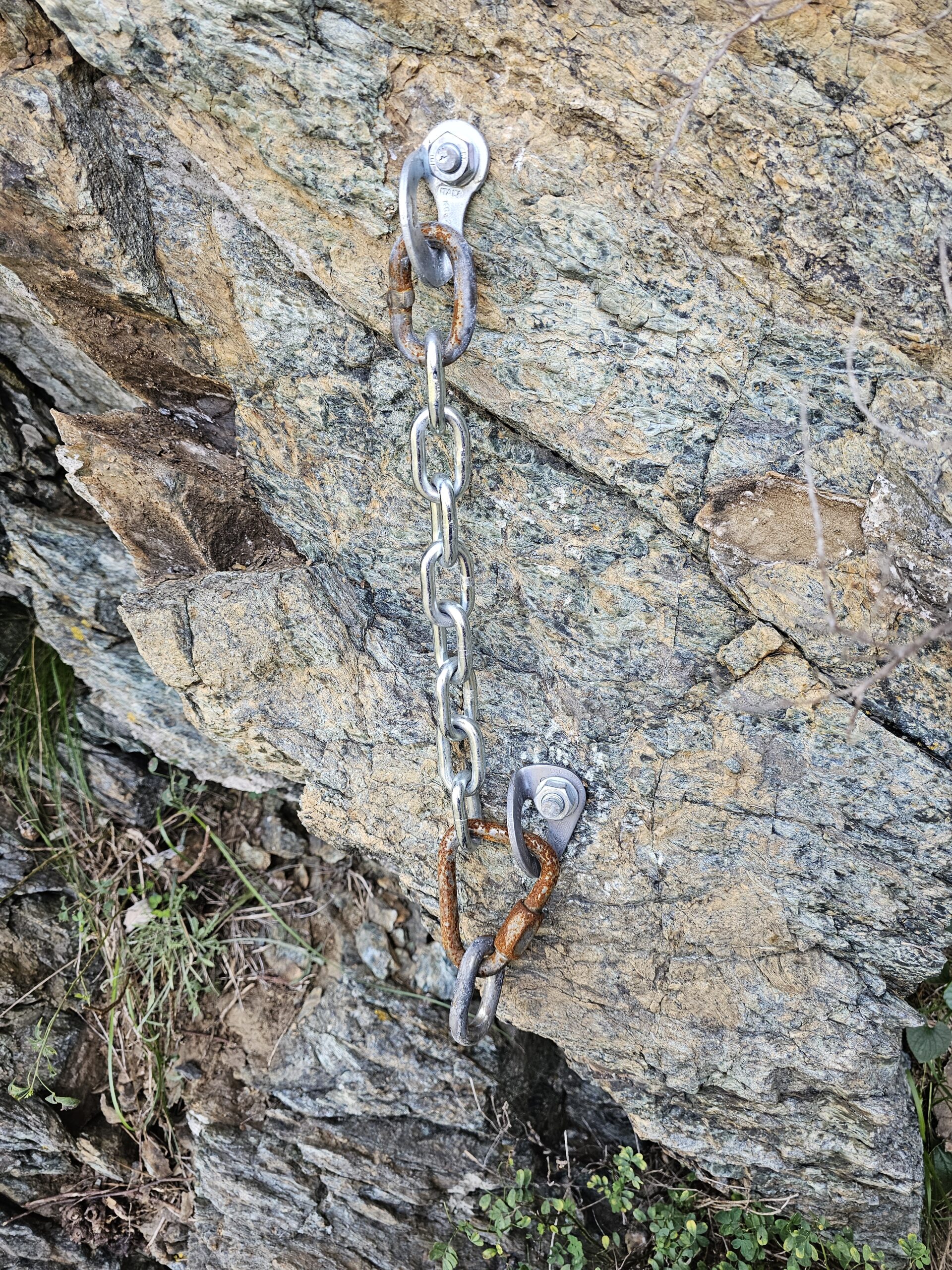 Nonostante l’attrezzamento con tasselli a espansione la via deve essere considerata terreno di avventura per la necessità di orientarsi e muoversi in ambiente di montagna e di posizionare protezioni veloci e ancoraggi naturali.