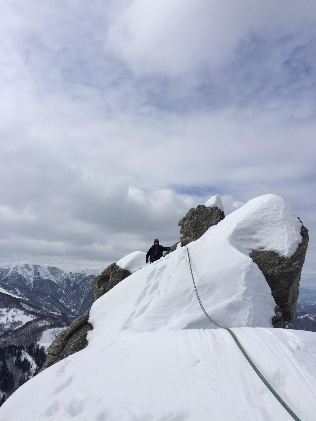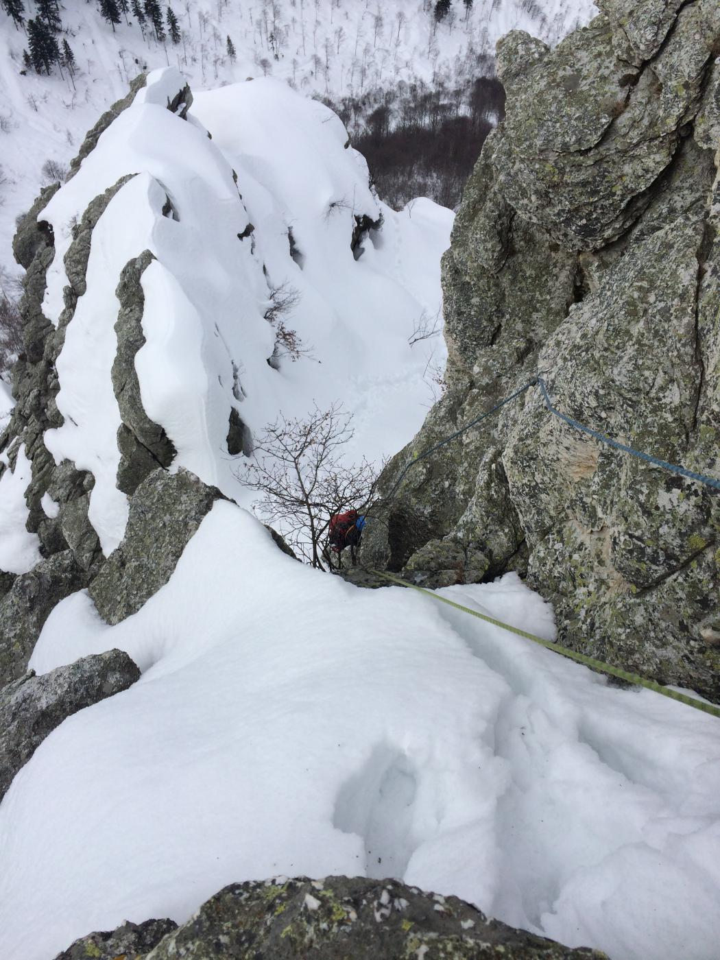 - L8 – 60-70 m. (4+ in partenza), poi (3°,2°) senza percorso obbligato, in cresta. Sosta su fettuccia.