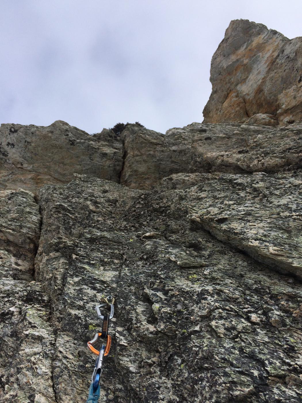 - L1 – 30 m. Dopo un chiodo, il primo spit è piuttosto alto, a 12 m da terra, segnalato da una fettuccia di nylon. Attaccare un muretto grigiastro con fessure, in direzione di una prima clessidra, a circa 3 metri da terra, seminascosta dietro ad un arbusto (4, 4+). Poi il 1° spit e successivamente un blocco incastrato con cordone, 5+. Poi nut piccolissimo e quindi friend n. 4 in bella fessura verso sinistra. Poi un secondo spti. Uscita a sinistra, 5+, ancora in fessura, con altra pietra incastrata con cordone. Sosta comoda, su 2 spit.