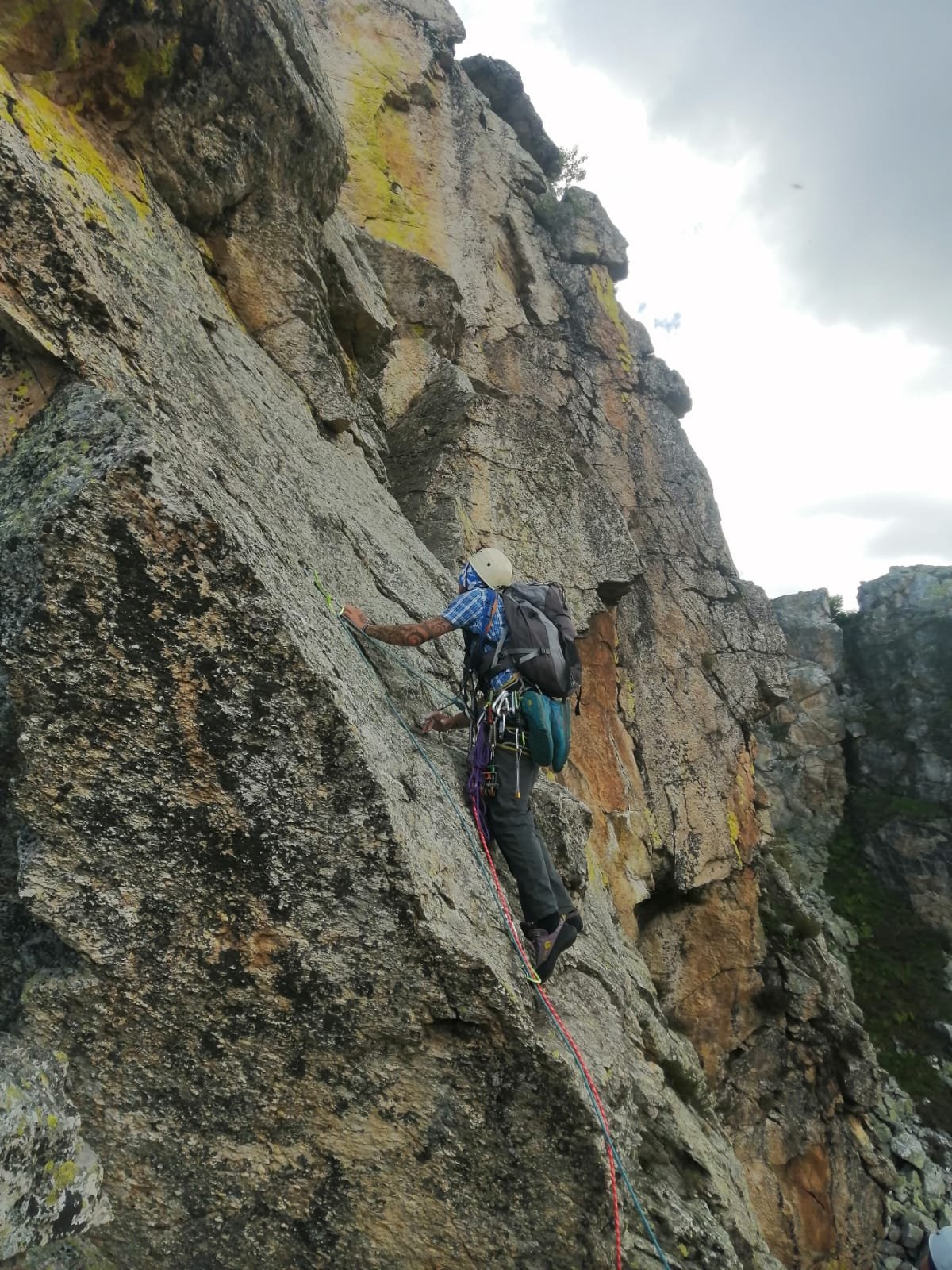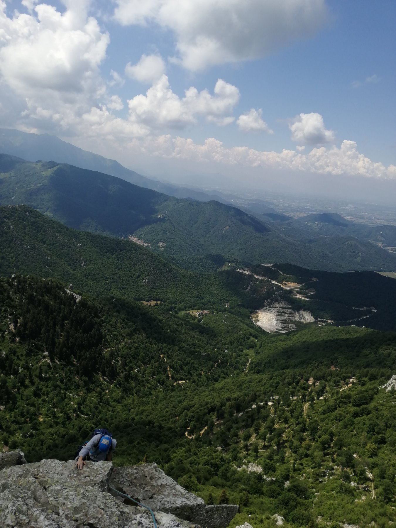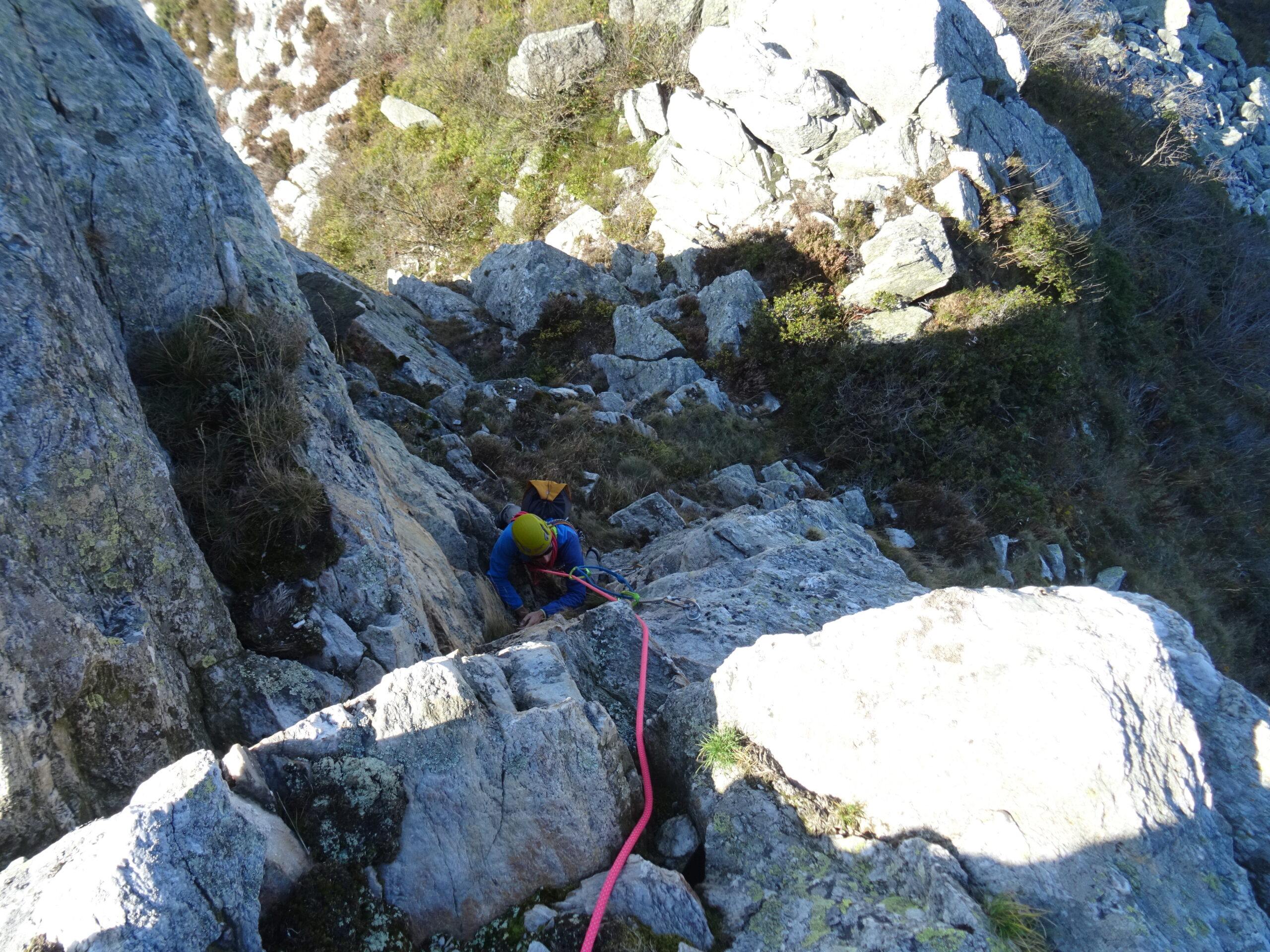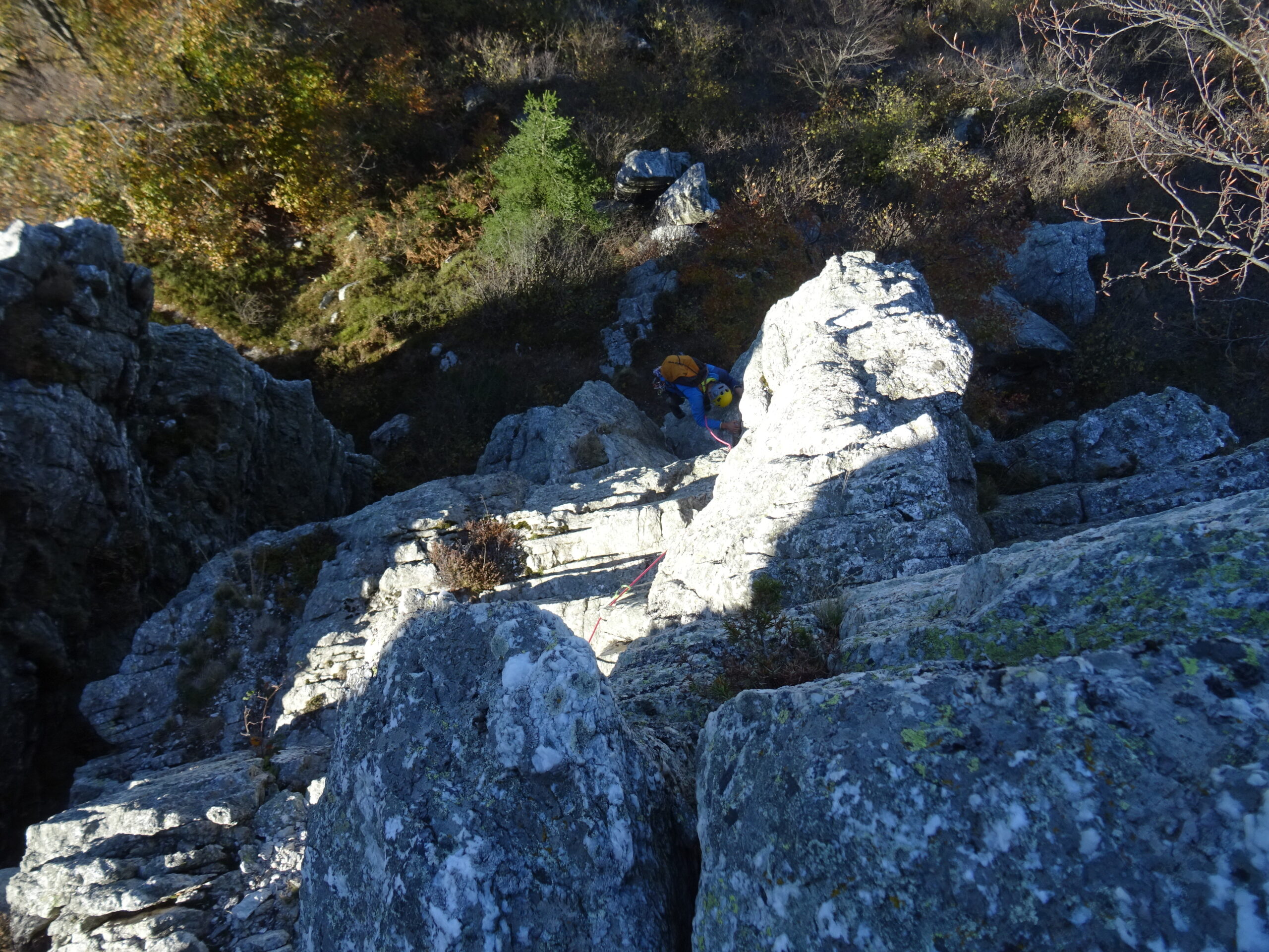 - L9 – Scendere una decina di m. sulla destra del filo di cresta. 20 m. bella placca dapprima appoggiata, (5+,5, 4+) 4 spit. Poi muretto giallo, 5°, 1 spit. Sosta su 2 spit con anello. ATTENZIONE: la doppia per scendere non conviene farla qui, meglio proseguire con L10.