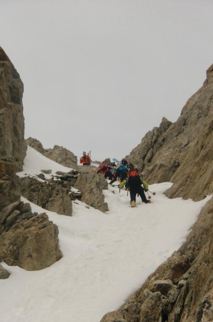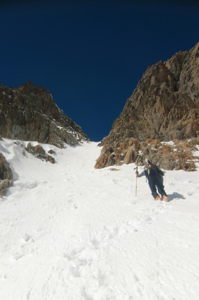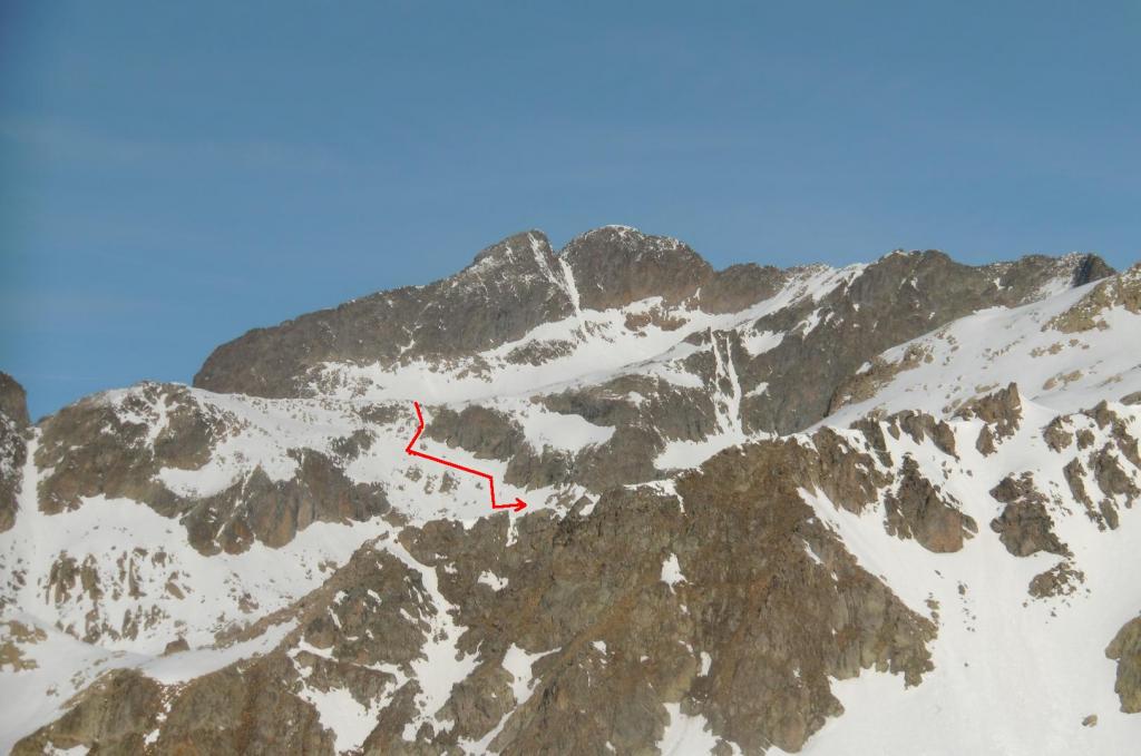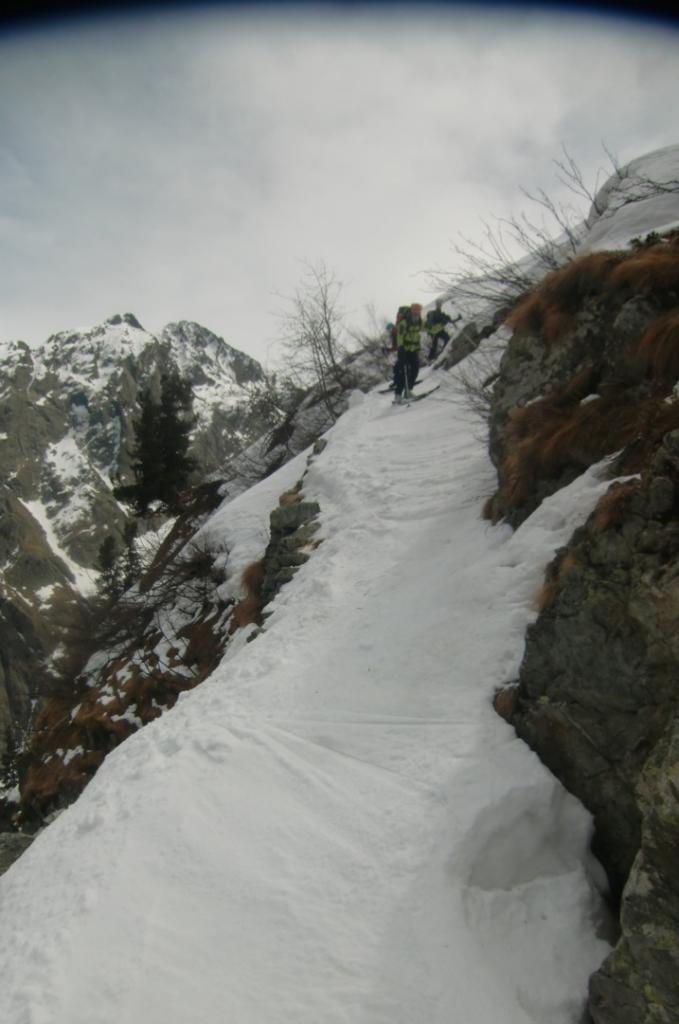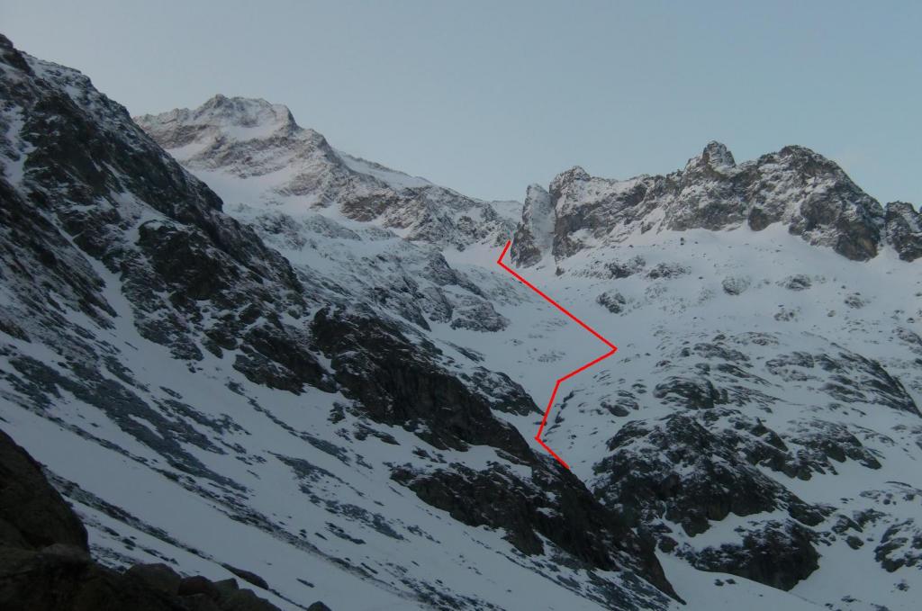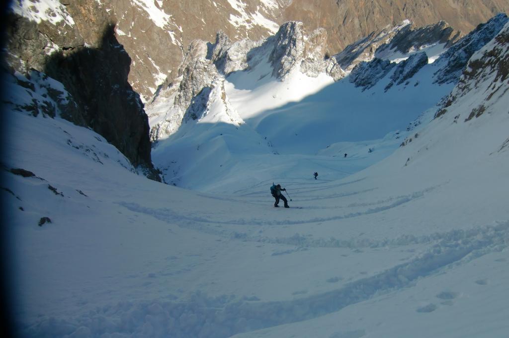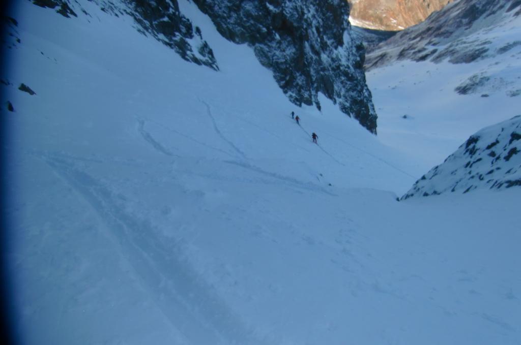 Dal fondo del canale scendere verso il Lac Long, questo tratto non avendolo percorso in salita, non risulta esse intuitivo poichè si sviluppa tutto su salti di roccia e in caso di scarsa visibilità sarebbe molto problematico e pericoloso.
