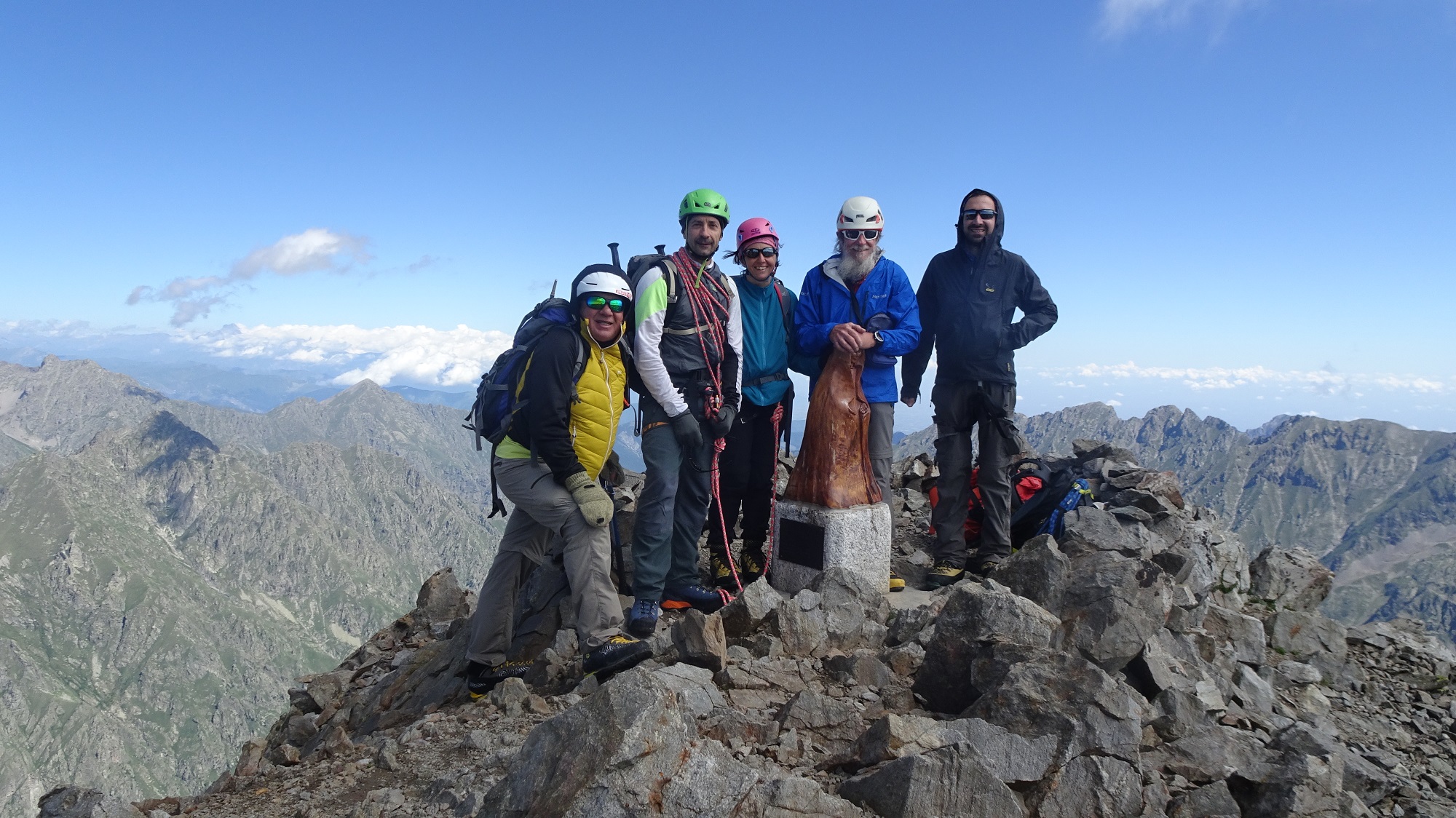 E’ il mio sesto Gelas ma la prima volta senza sci. Gita impegnativa su terreno molto insidioso. Scesi dalla Forcella Roccati abbiamo risalito il nevaio su neve molto dura con picca e ramponi. Il primo nevaio è evitabile su terreno friabile sulla destra. Al momento nella parte più stretta c’è ancora un breve nevaio da affrontare con picca e ramponi, al mattino neve dura. Arrivati al colle St. Robert si possono lasciare i ramponi. Da qui alla vetta si seguono vaghi ometti e radi bolli blu facendo attenzione a non sbagliare percorso. Il tratto più pericoloso è sicuramente arrivare al colle St. Robert, dove non staccare pietre è impossibile. Casco consigliato . Infinito il tragitto dalla vetta all’auto. Con la figlia Sara, Andrea, Bruno, Ettore e i due Roberto.
