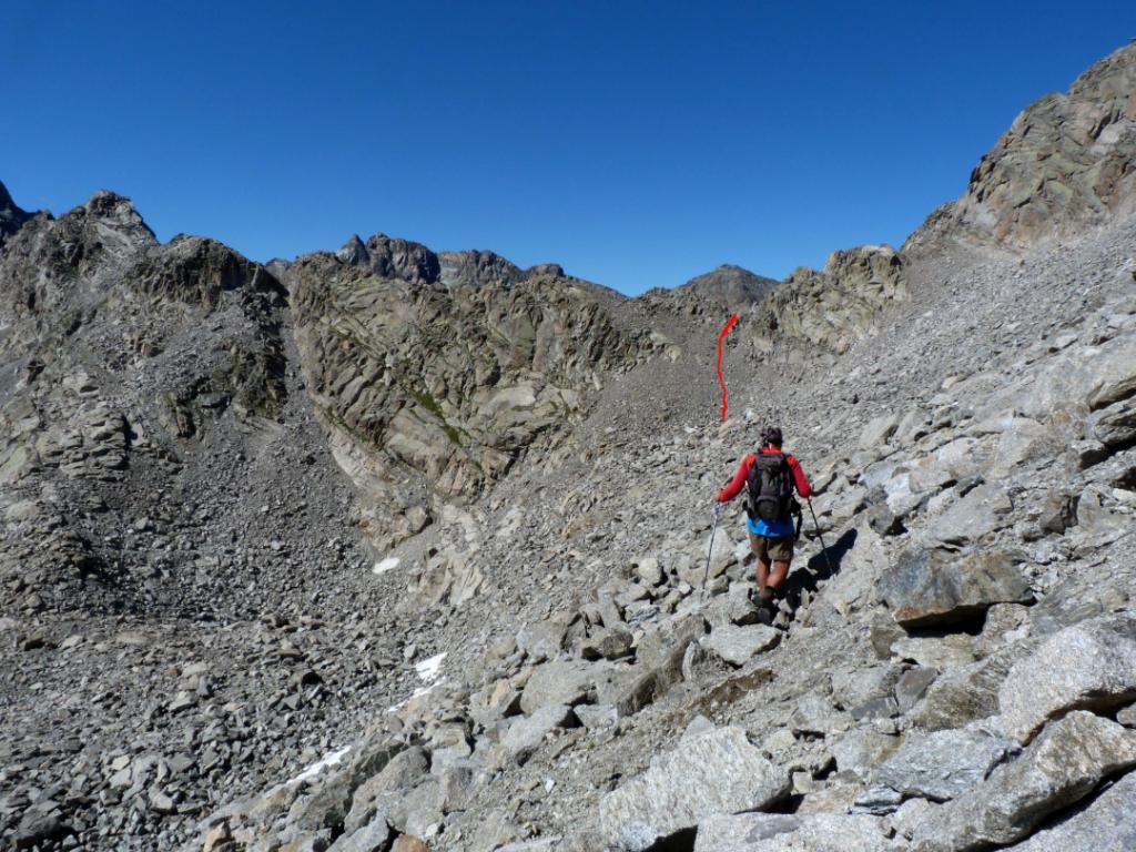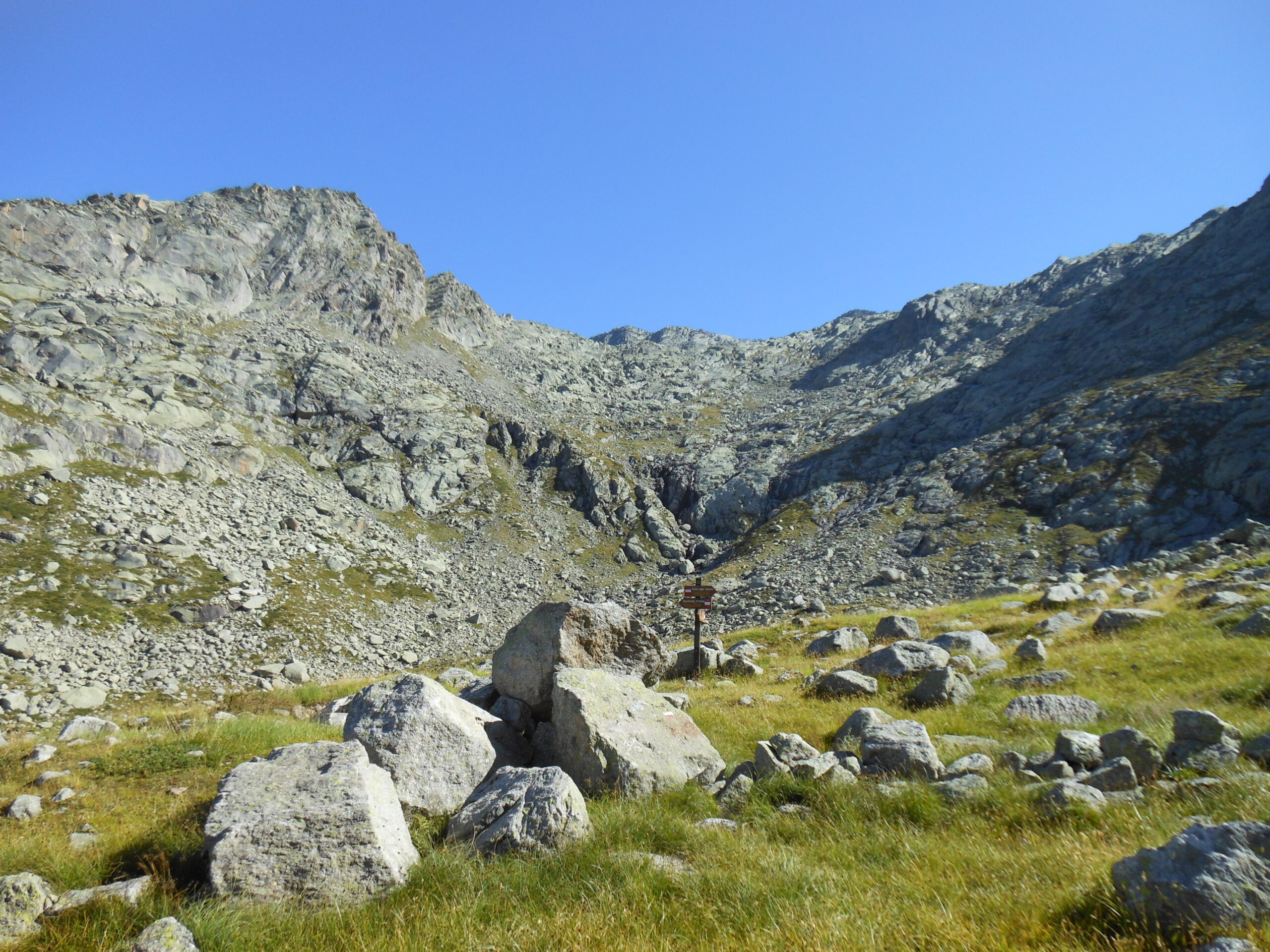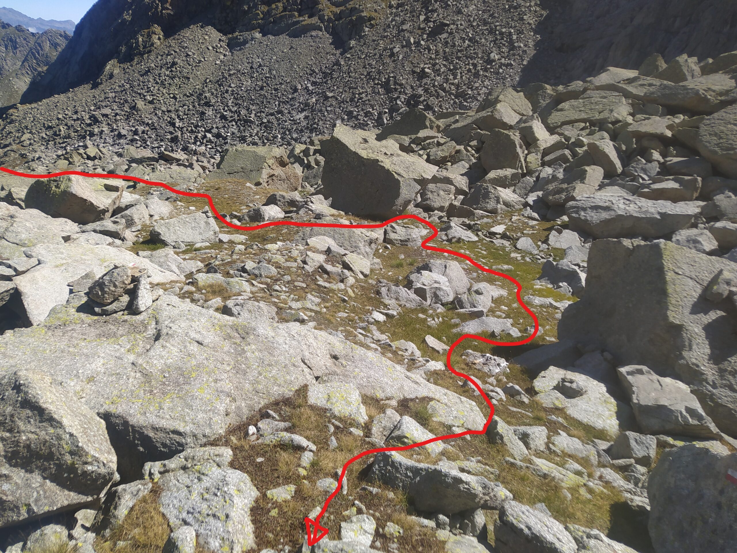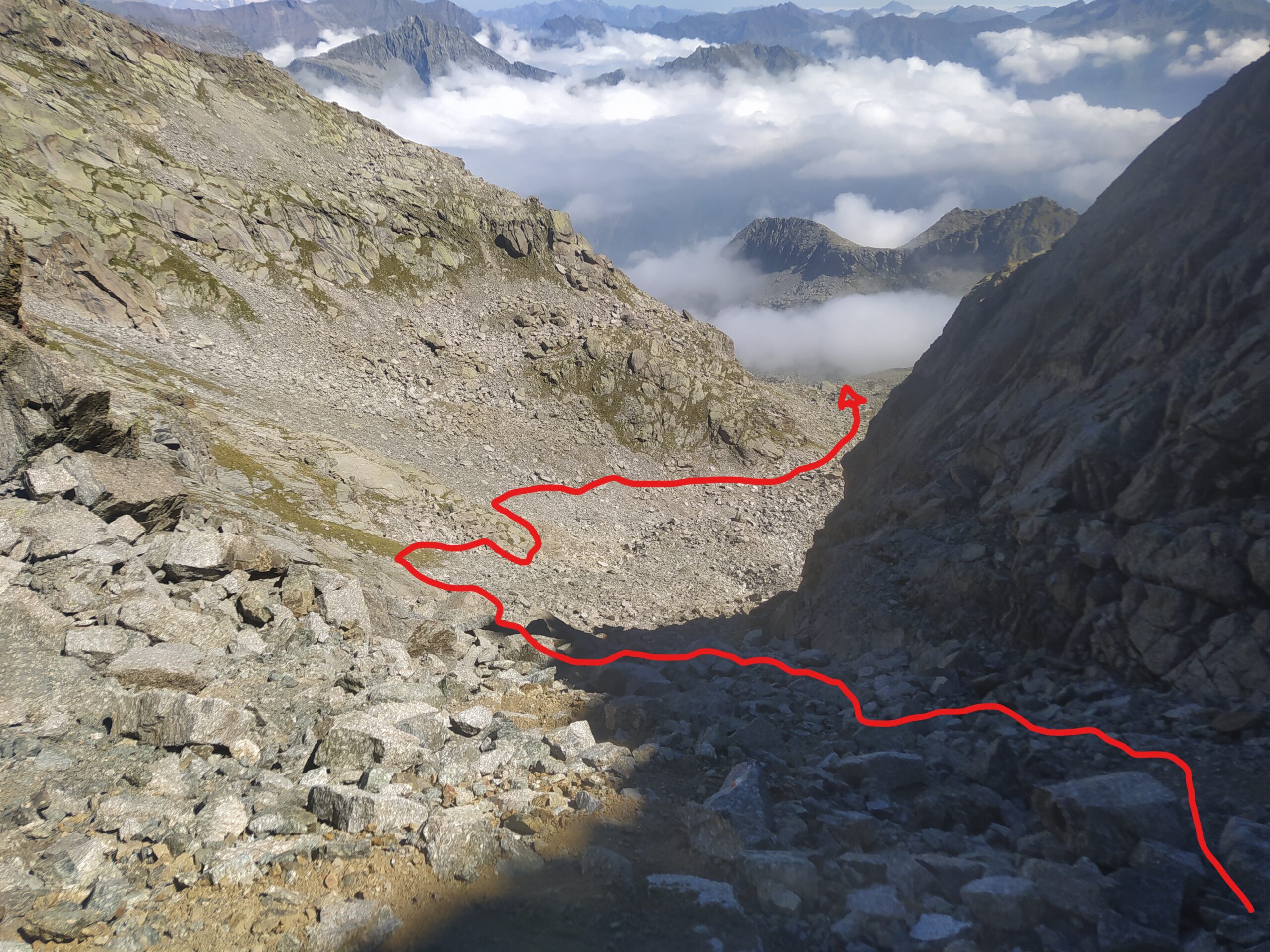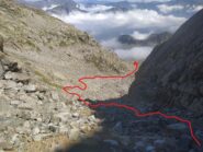 Qui si hanno due opzioni: o seguire la traccia nei detriti al centro del canalone (neve anche inizio stagione) piuttosto ripida e faticosa, oppure mantenersi più a destra salendo per balze di erba e terra costeggiando alcune paretine per poi arrivare ad una zona di grossi massi accatastati (non sempre stabili) dai quali si traversa a sinistra per entrare nel canale a poche decine di metri dal Passo del Lago Gelato 2949 m.