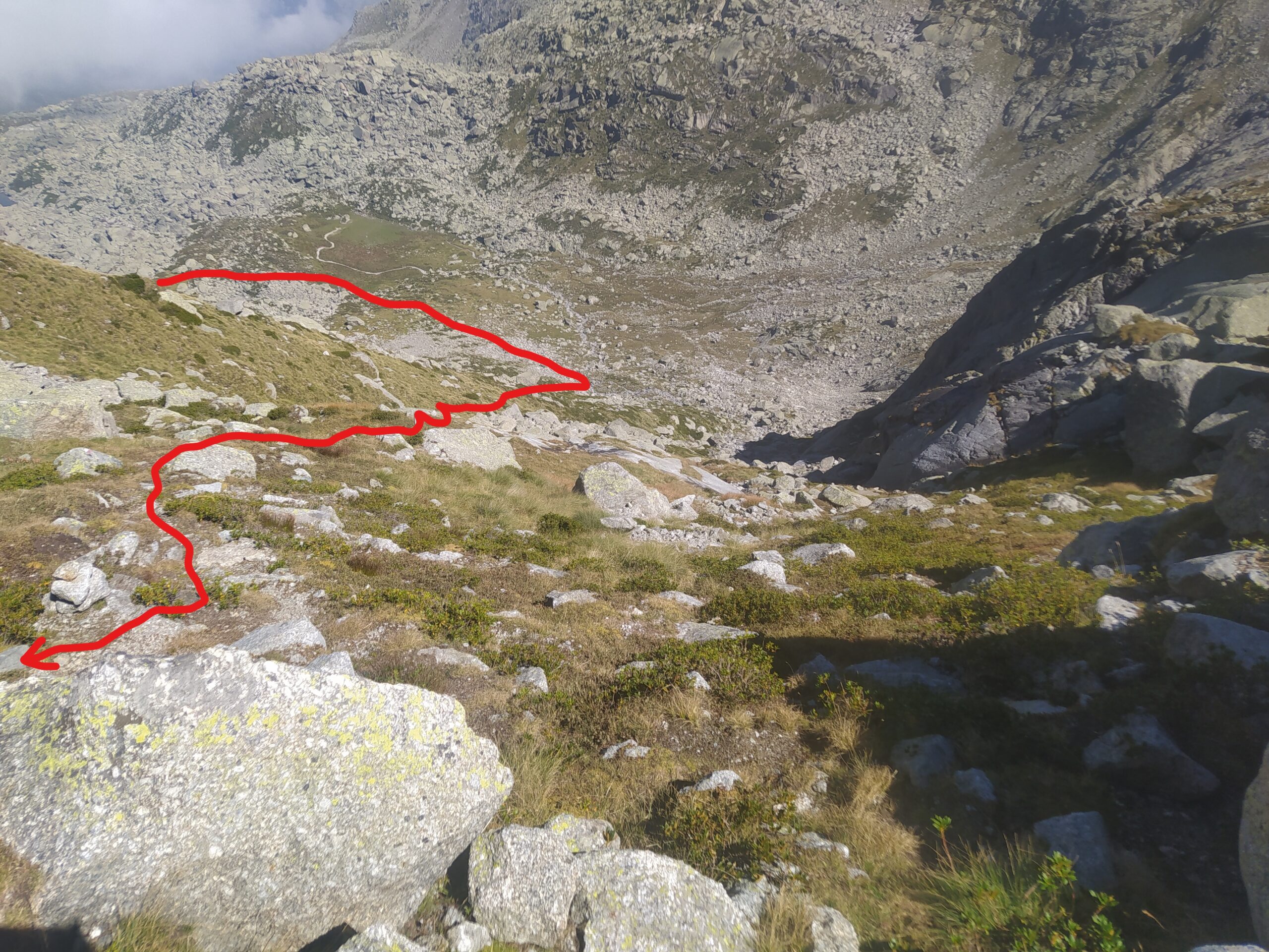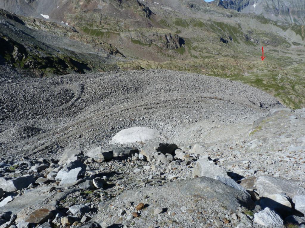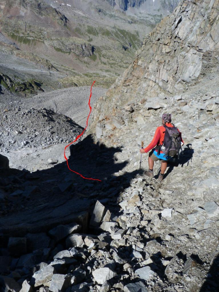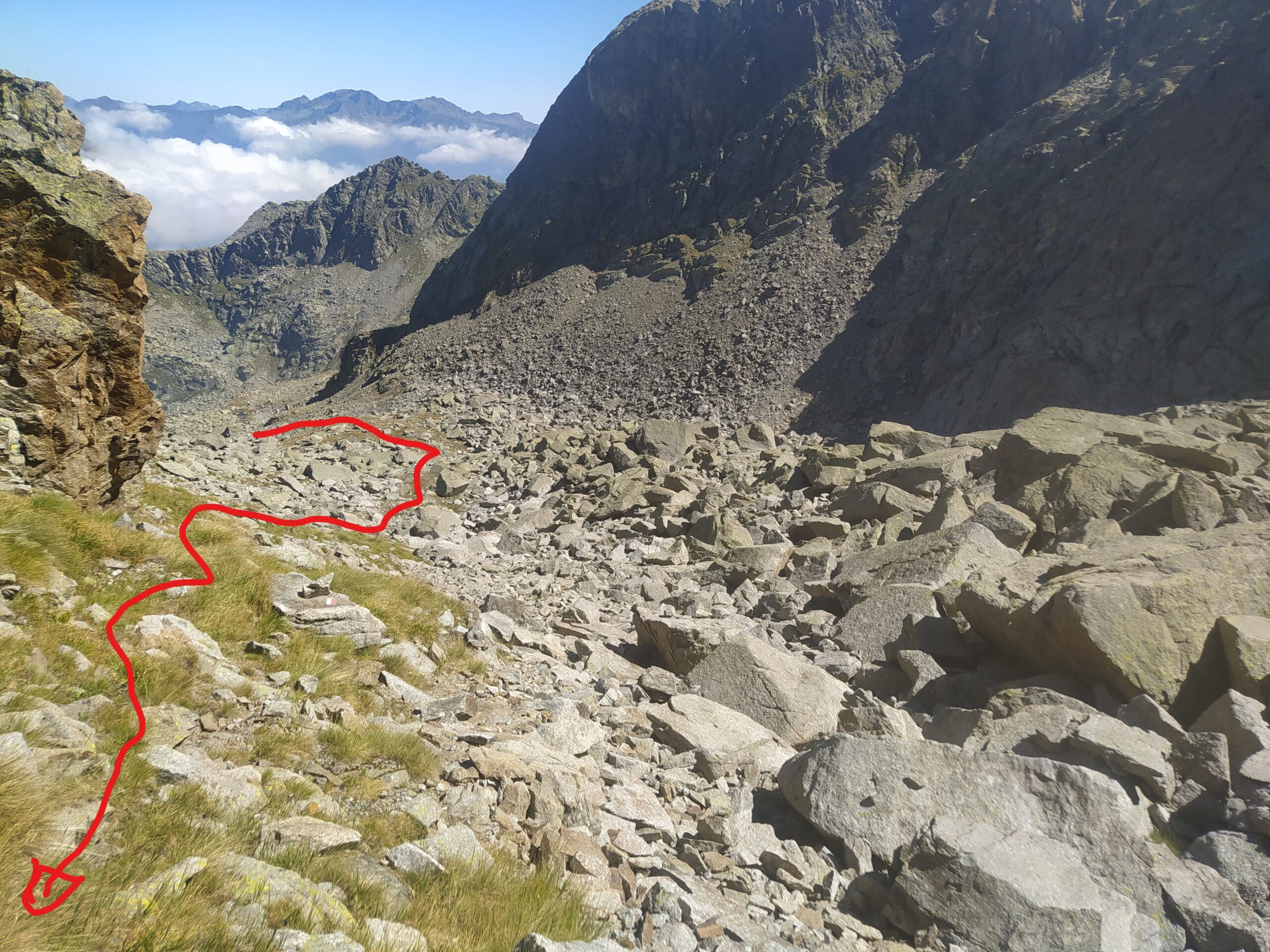 Qui si hanno due opzioni: o seguire la traccia nei detriti al centro del canalone (neve anche inizio stagione) piuttosto ripida e faticosa, oppure mantenersi più a destra salendo per balze di erba e terra costeggiando alcune paretine per poi arrivare ad una zona di grossi massi accatastati (non sempre stabili) dai quali si traversa a sinistra per entrare nel canale a poche decine di metri dal Passo del Lago Gelato 2949 m.