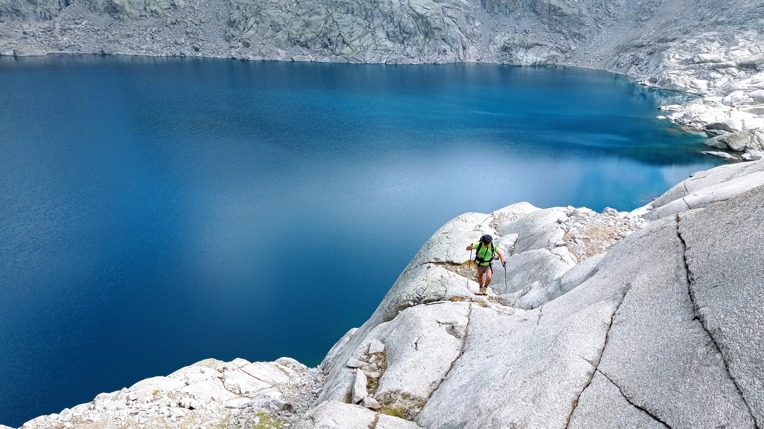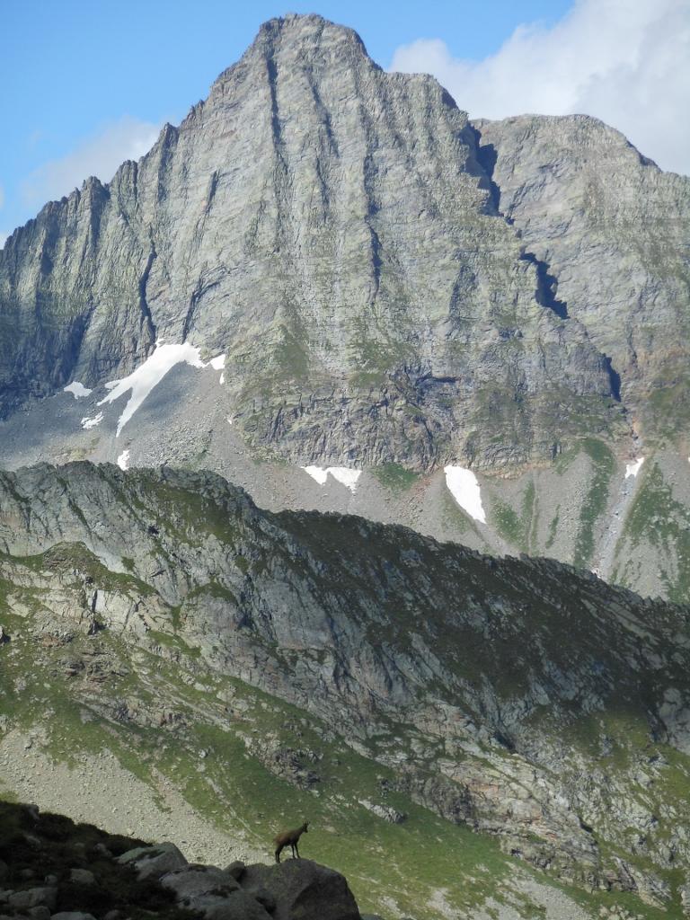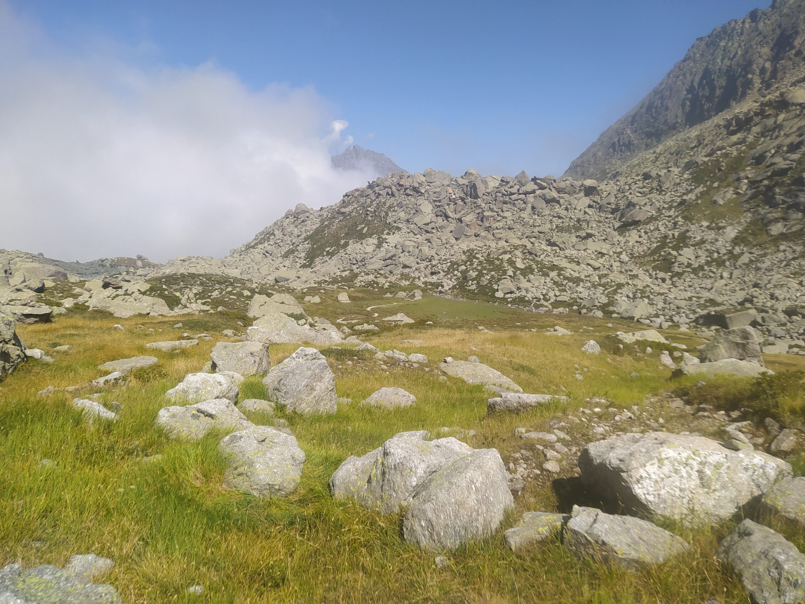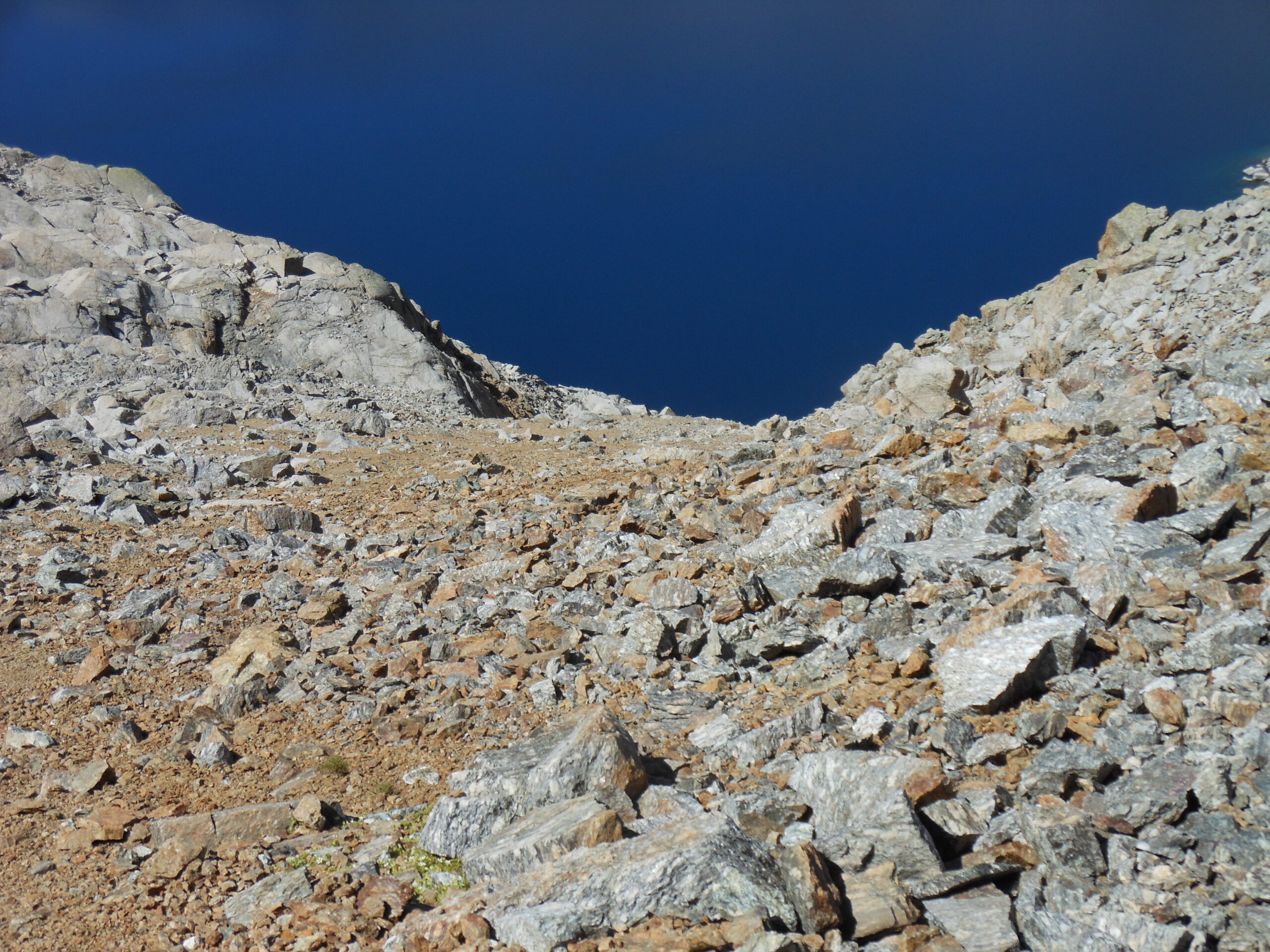 Qui si hanno due opzioni: o seguire la traccia nei detriti al centro del canalone (neve anche inizio stagione) piuttosto ripida e faticosa, oppure mantenersi più a destra salendo per balze di erba e terra costeggiando alcune paretine per poi arrivare ad una zona di grossi massi accatastati (non sempre stabili) dai quali si traversa a sinistra per entrare nel canale a poche decine di metri dal Passo del Lago Gelato 2949 m.