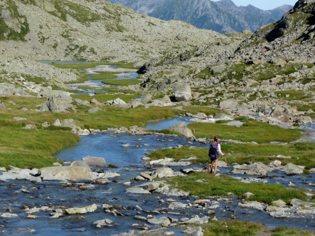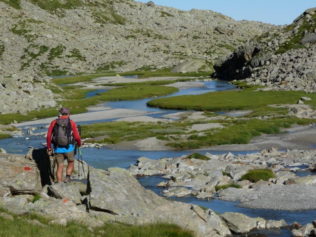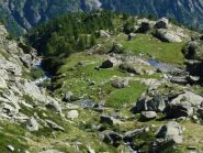 Allo sbocco della valletta si attraversa il ruscello in una zona di pietraia che dà accesso alla parte superiore del vallone che conduce al Passo del Lago Gelato. Si percorre un bel ripiano erboso con dei grossi massi, quindi si raggiunge la morena pietrosa che va aggirata a destra su terreno prevalentemente erboso; si segue quindi una traccia più marcata che conduce nella conca (nevai) alla base del ripido canalino per il Passo del Lago Gelato. (di qui ancora 250m al passo).