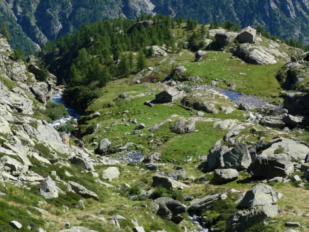 Si supera la Grangia Bettassa 1712 m, il rudere di Sunnò 1838 m e poi sbucati su un dosso erboso con alcuni ruderi, si continua verso sud rientrando brevemente nel bosco e infine raggiungendo il pianoro con la Casa di Caccia Vittoria e poco oltre con le Grange Vasinetto 2017 m.