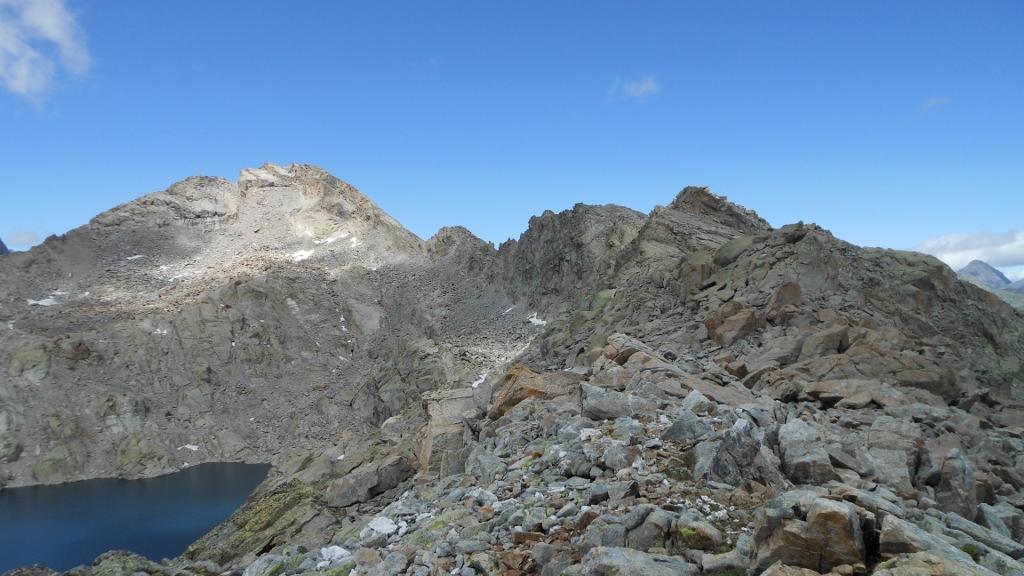 Si scende sull’altro versante dove si scorge il lago di Motta. cercando di non perdere troppa quota ci si sposta su pietraia verso il colle di Motta anche qui si distingue per il fatto che è un colle abbastanza marcato (vedi foto).