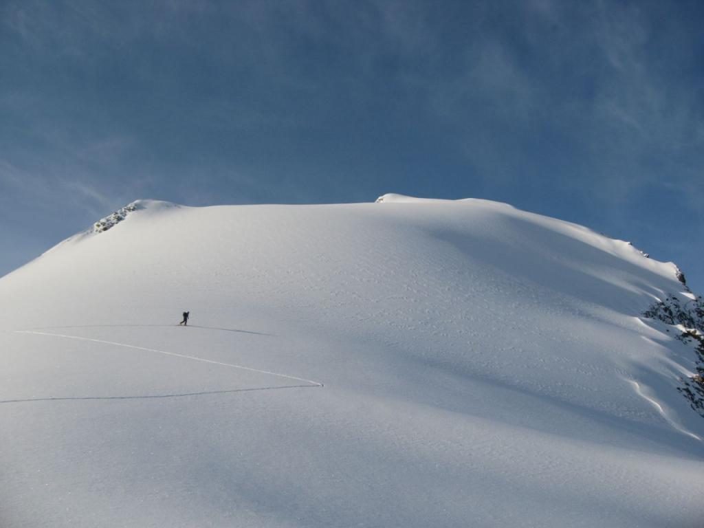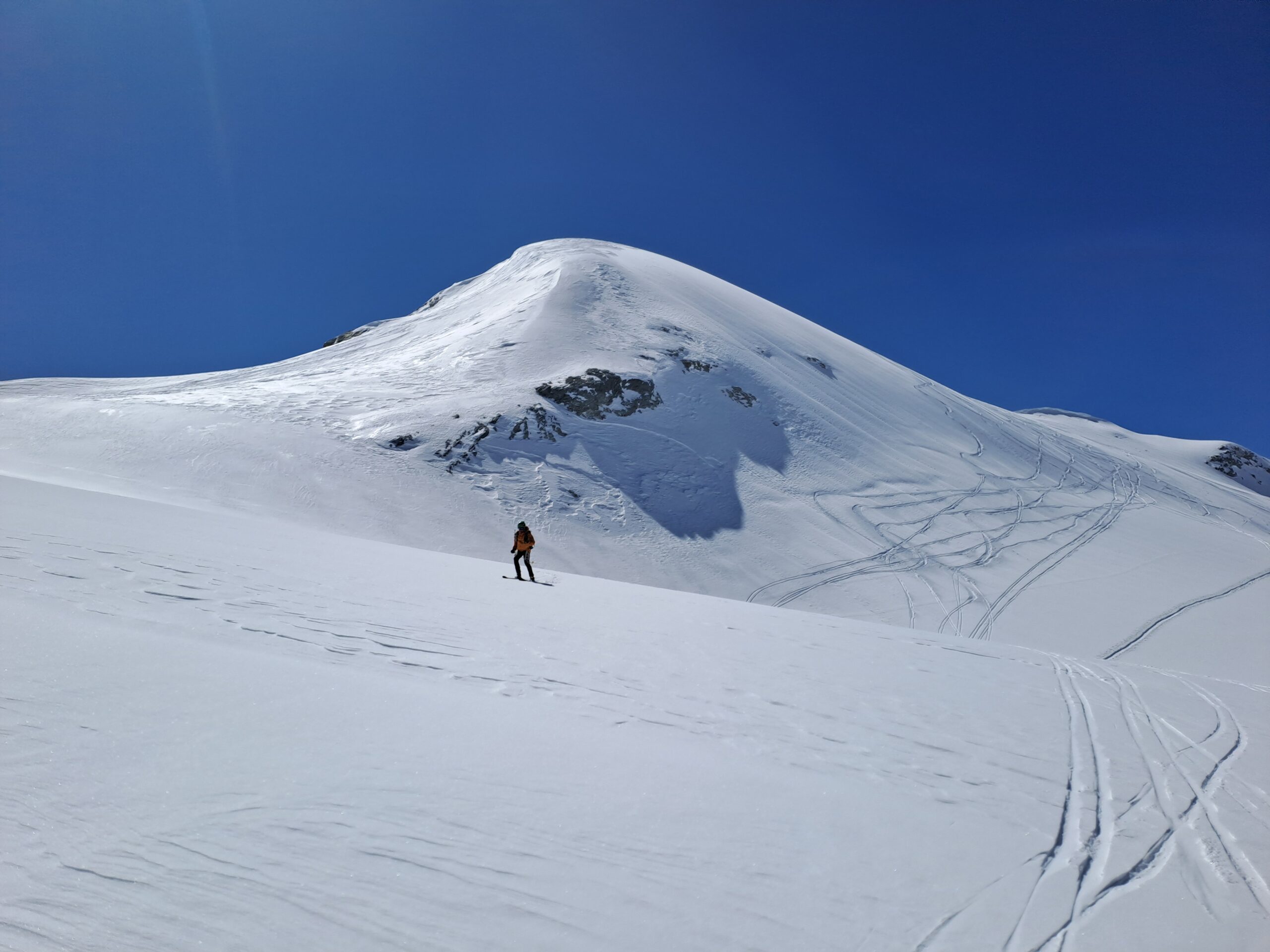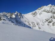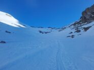 Rimesse le pelli si salgono i morbidi pendii verso il Col d’Oren, giunti al piano glaciale sotto il colle si poggia verso sinistra sin sotto il ripido pendio di 120 m, che si sale con attenzione, da sinistra verso destra, fino alla spalla 3351 della Becca d’Oren O (Epaule Albert Morin).
