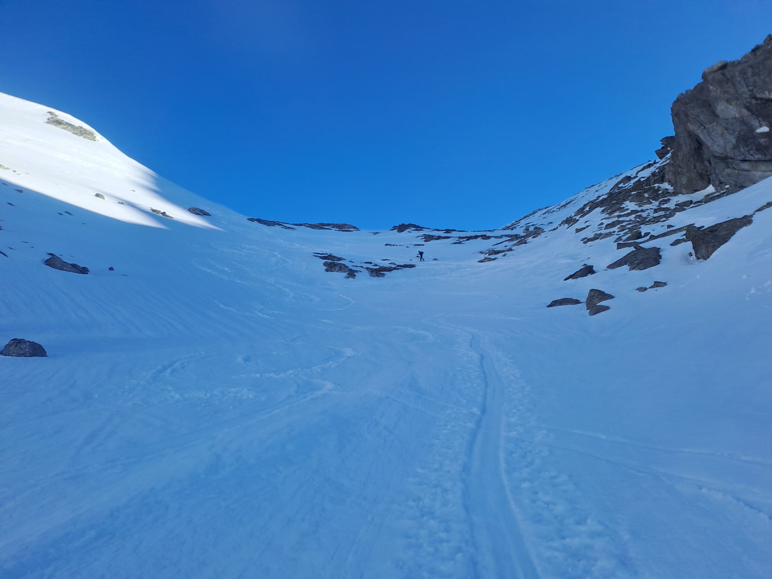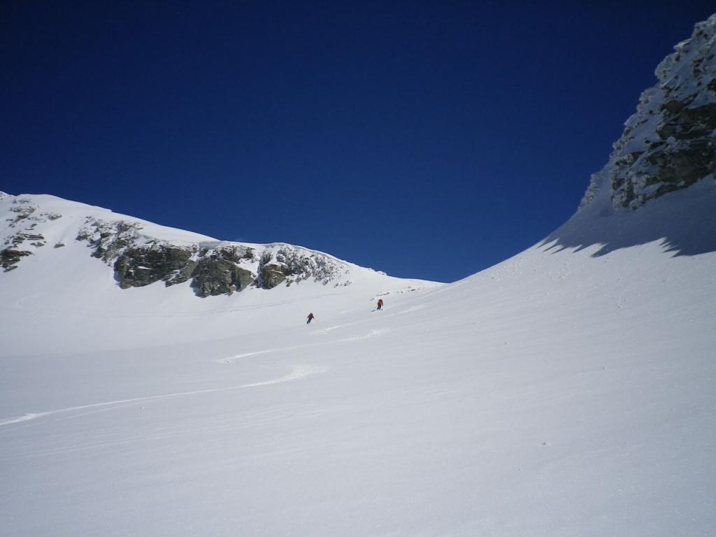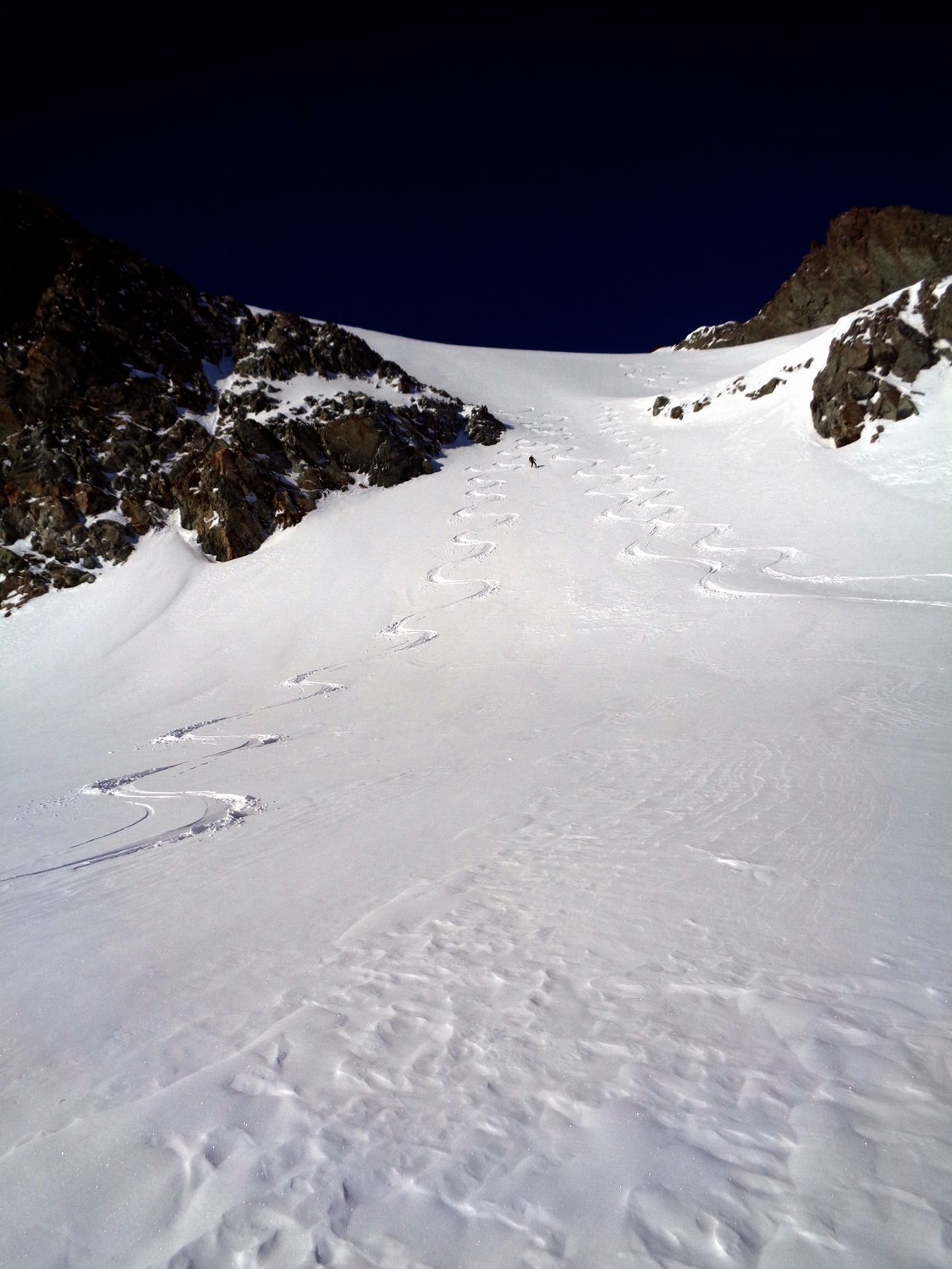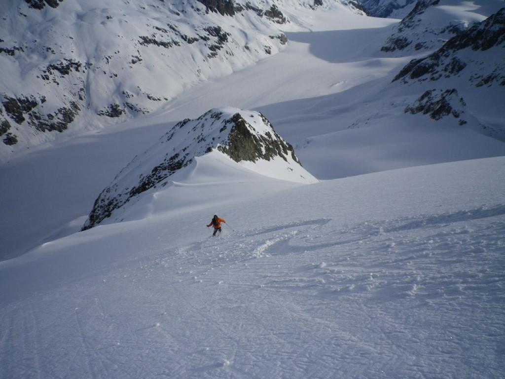 Si scende sul versante Valpelline un primo pendio molto ripido (tratto di sci ripido con primi metri a 50° che subito si smorzano, oppure con picca e ramponi). Si mette piede sul Glacier d’Oren Nord.