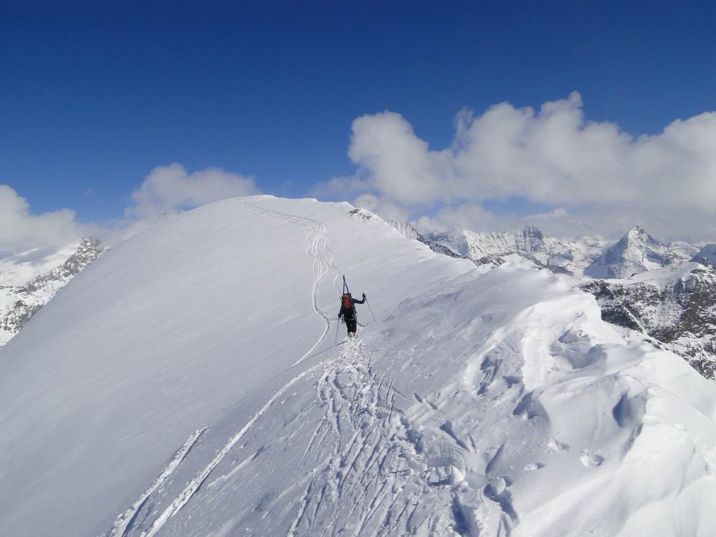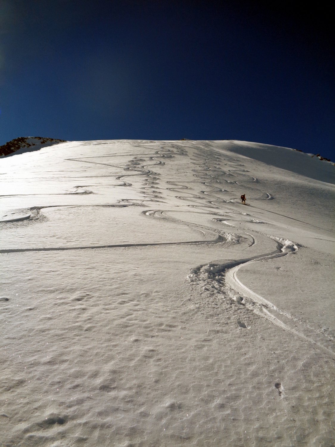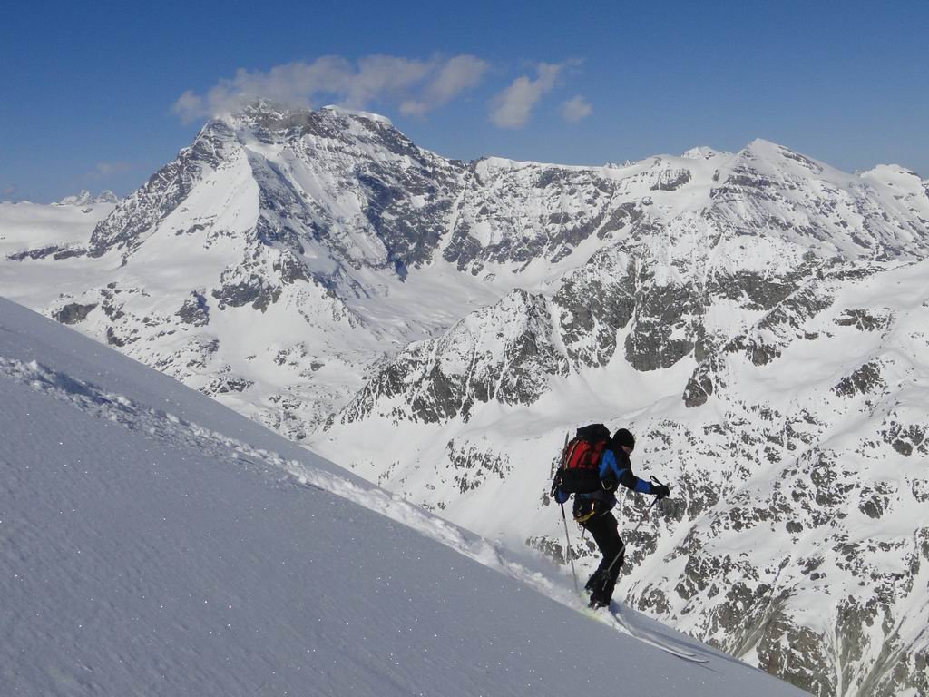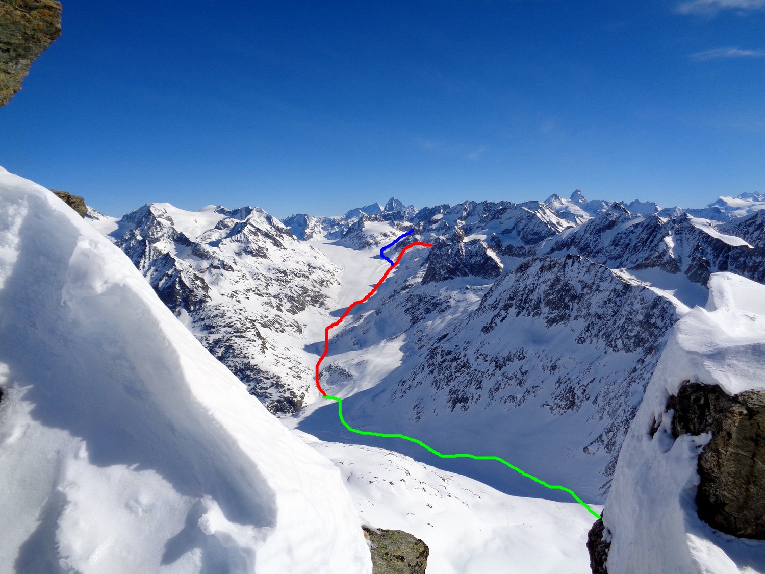 Si scende sul versante Valpelline un primo pendio molto ripido (tratto di sci ripido con primi metri a 50° che subito si smorzano, oppure con picca e ramponi). Si mette piede sul Glacier d’Oren Nord.