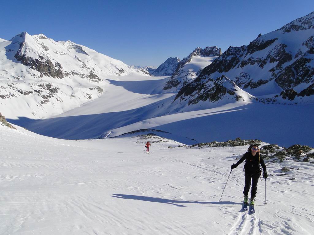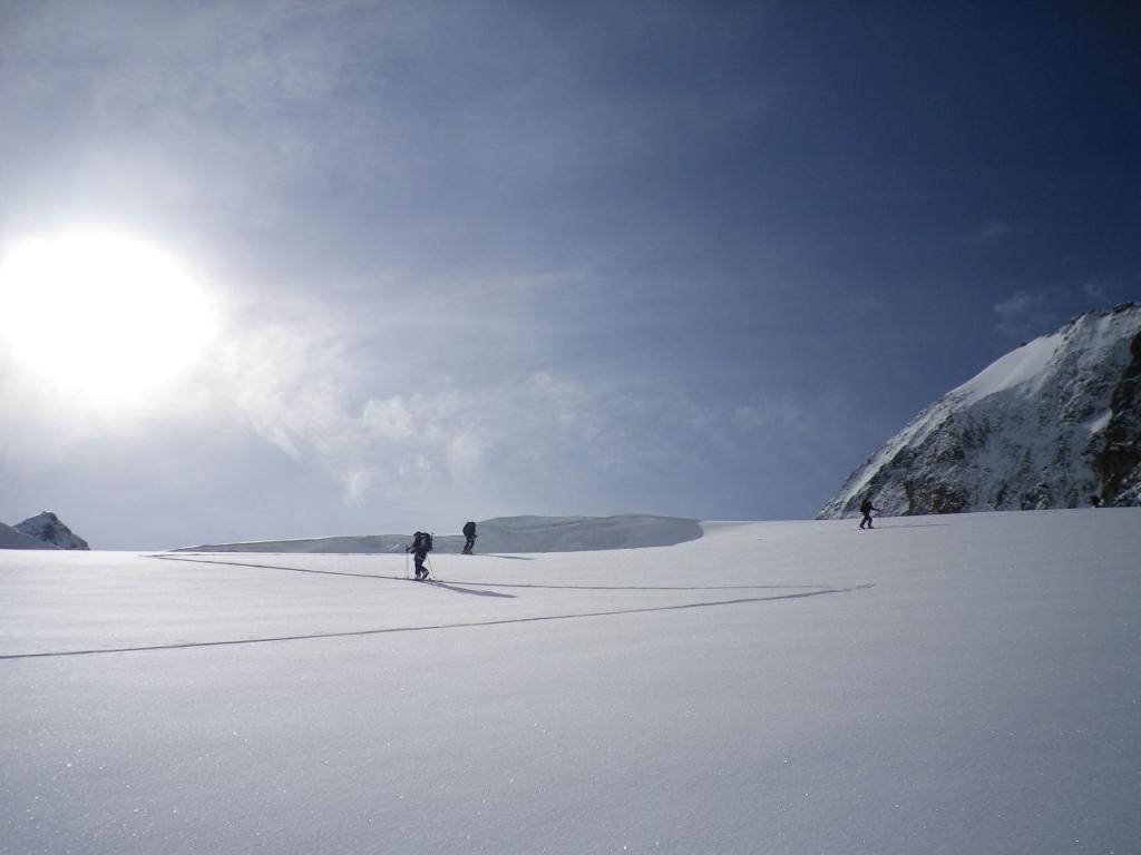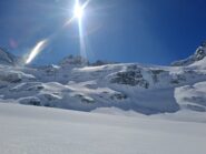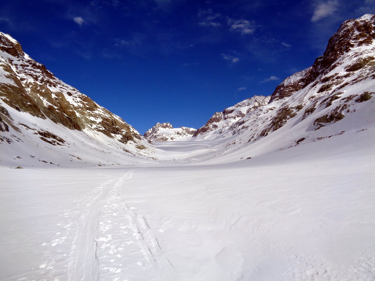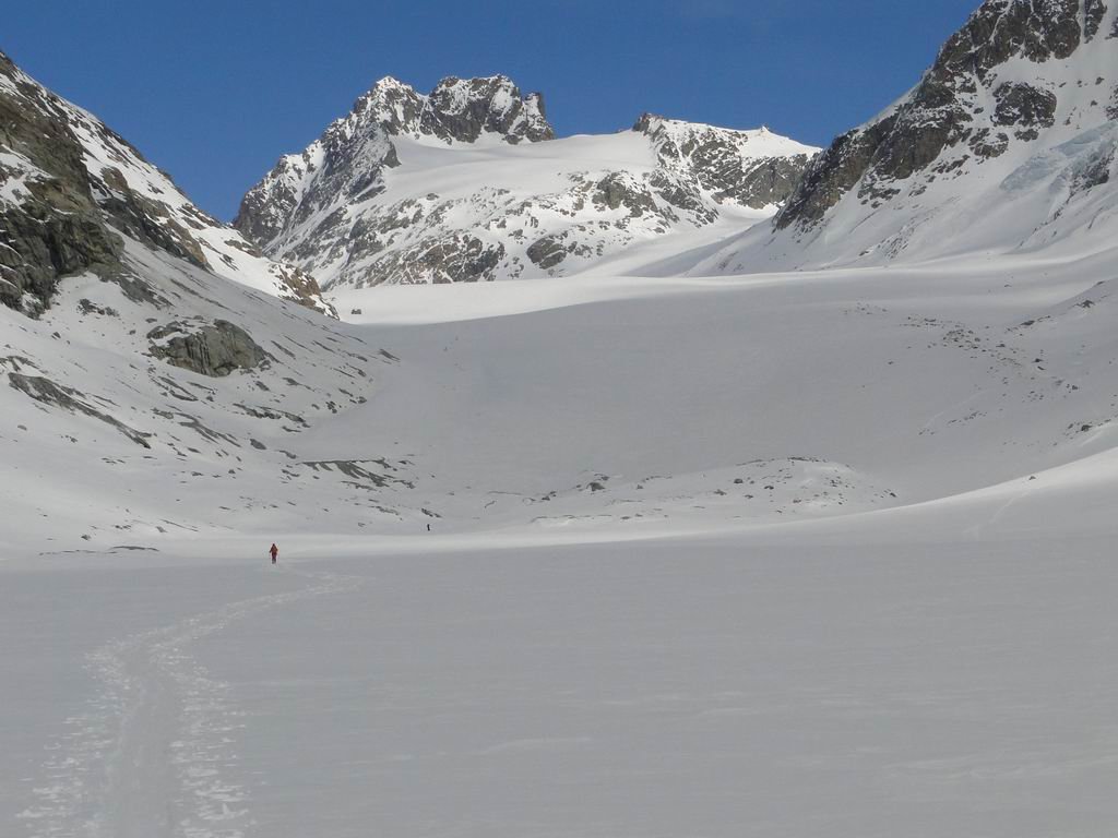 Dai ripiani si procede alti sul ghiacciaio di Otemma utilizzando una serie di rilievi morenici. Questo tratto è semplice ma richiede neve assolutamente sicura. Si mette piede sul ghiacciaio di Otemma a 2650-2700 m c.