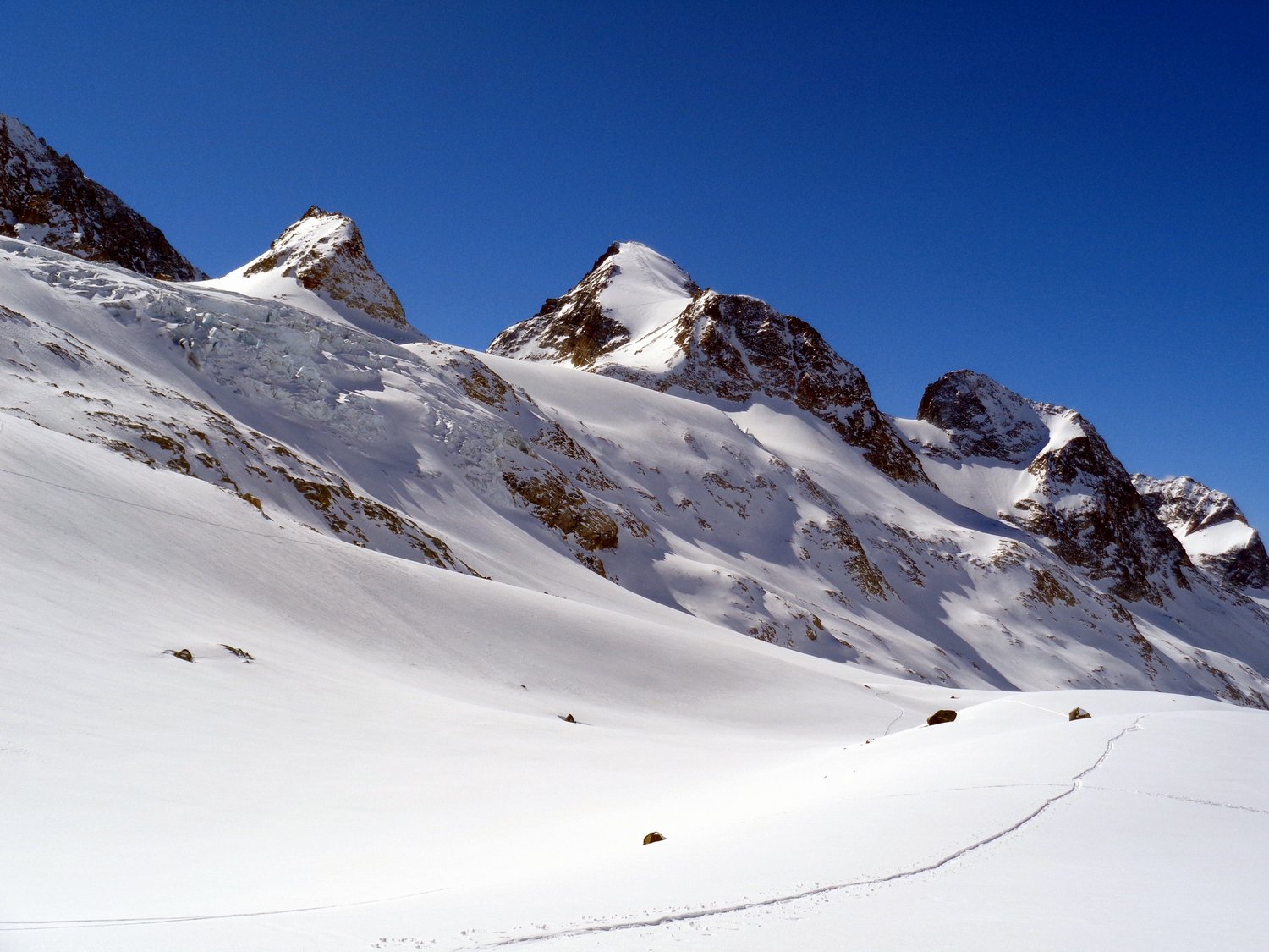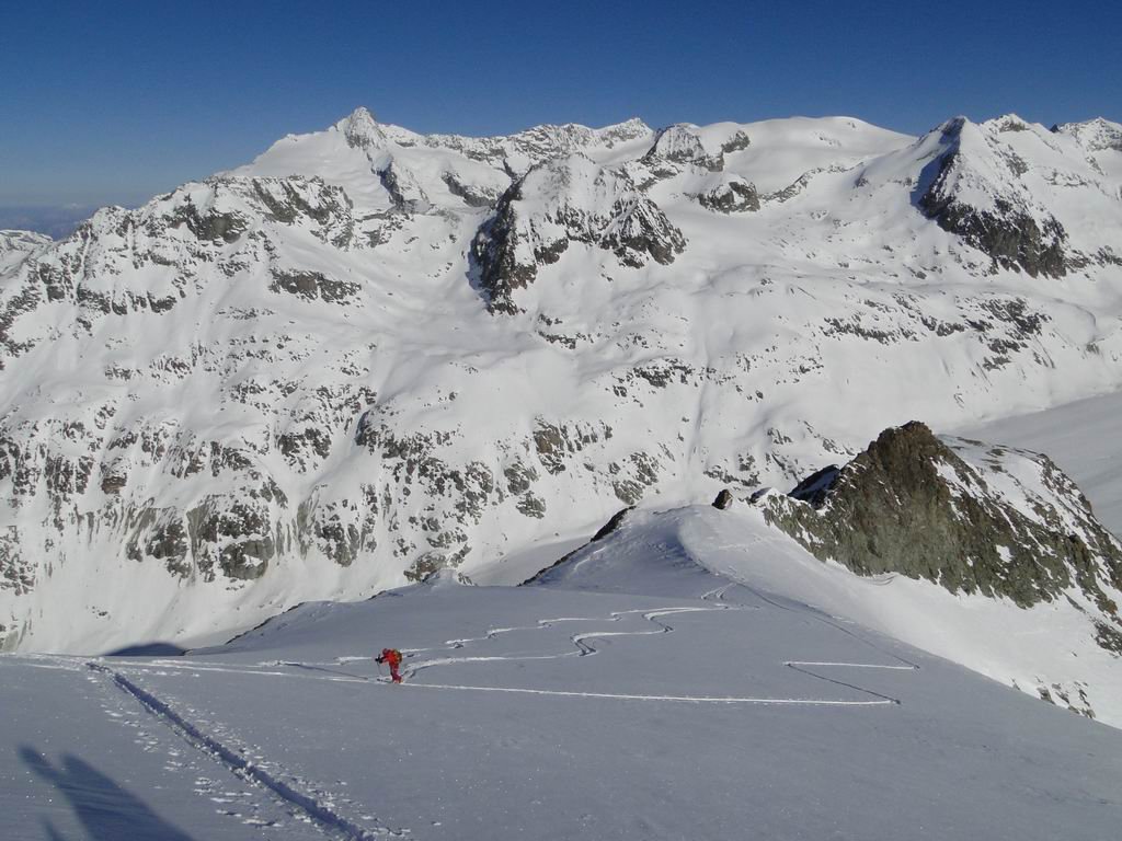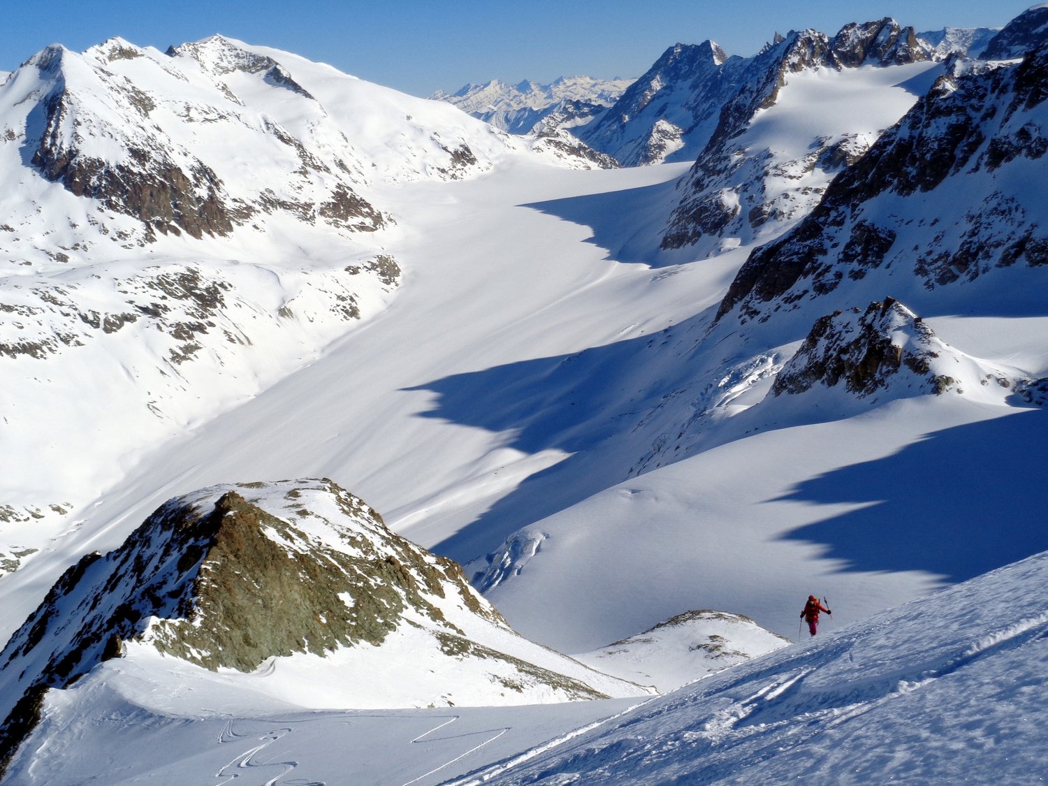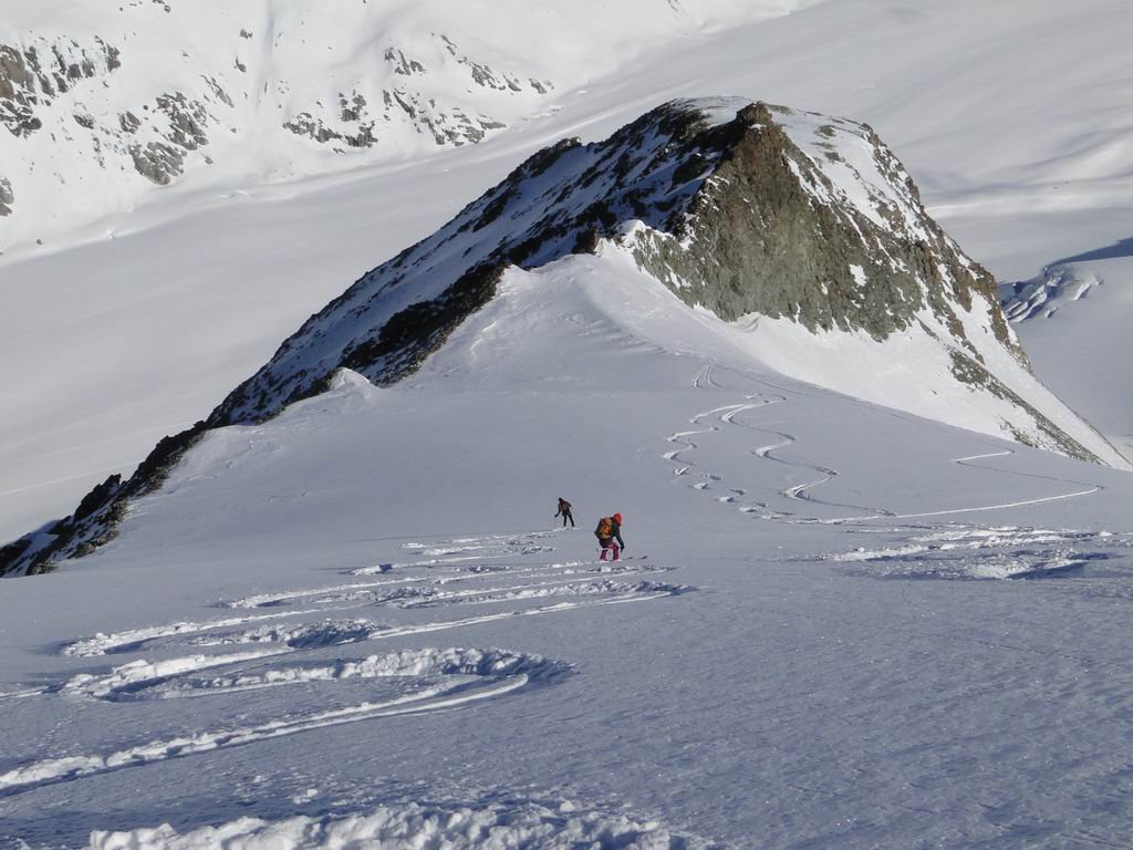 Salita al Mont Gelè lungo l’it. classico da Crete Seche. Si scende a 3200 lungo l’it. di salita, quindi si punta al Col de Crete Seche 3061 m. Si scende l’ omonimo ghiacciaio sul versante Svizzero, primo tratto ripido, pendio a 30°, si raggiunge il fondo del vallone fino ai ripiani a 2450 m.