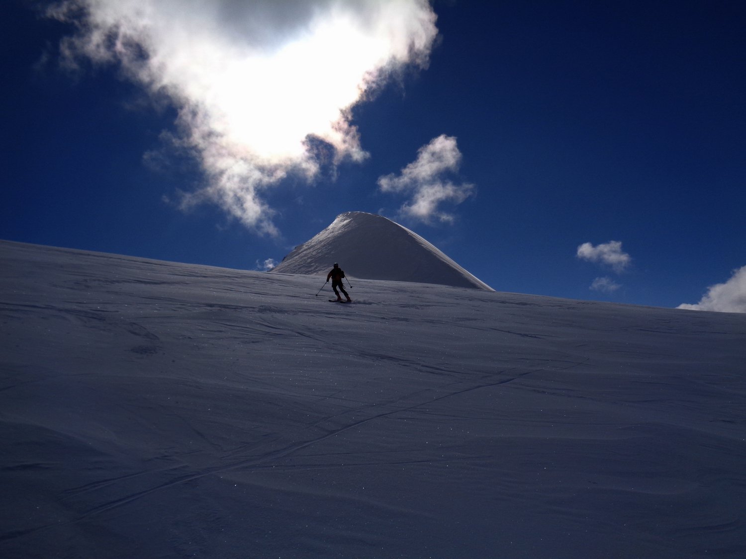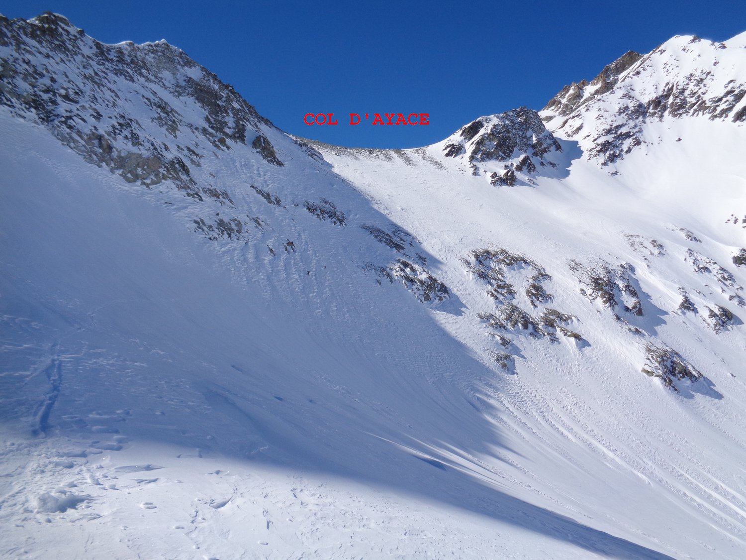 Dal bivacco si scende al colletto sottostante e si mette piede nel Glacier de l’Aouille, portandosi sotto il canale che scende dall’ evidente spalla dell’ Aouille Tseucca, si sale il canale o direttamente o sfruttando più comodi pendii sulla destra e salendo poi direttamente il tratto più ripido. Raggiunta la bella spalla nevosa si continua sullo splendido ed estetico pendio nord arrivando con gli sci in vetta.