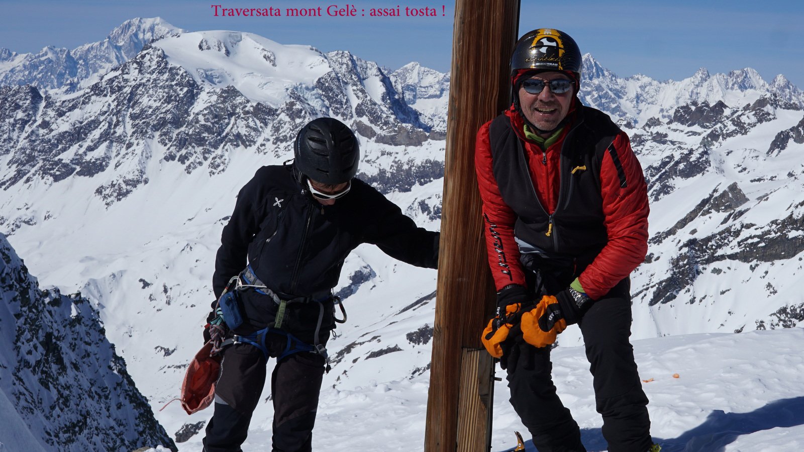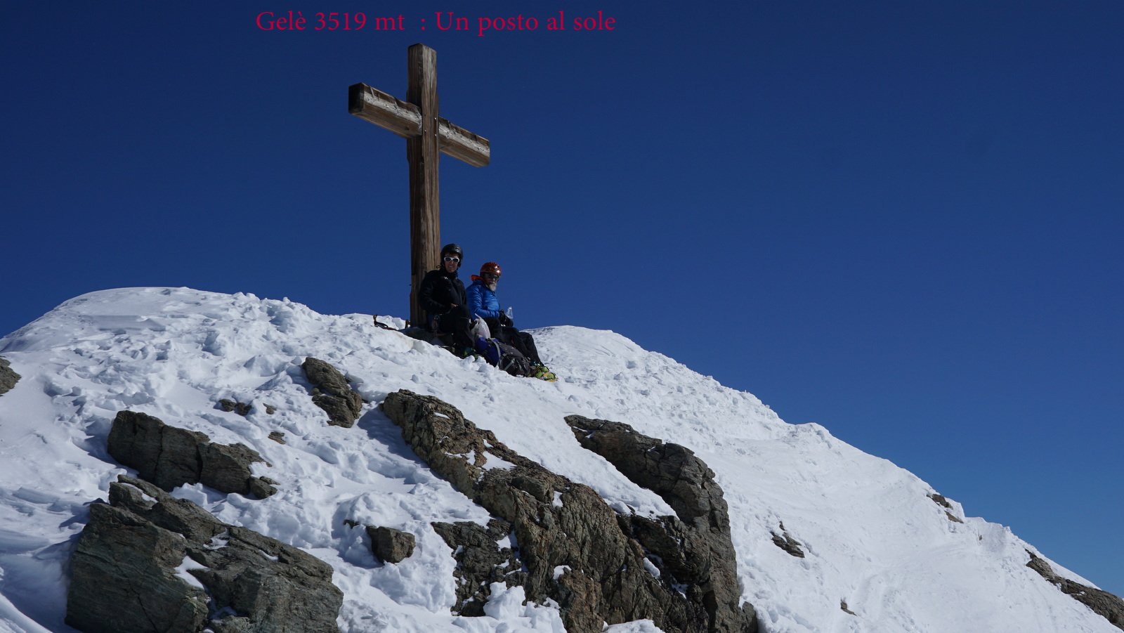 Oggi giovedì 24 abbiamo fatto il Gelè in traversata , salita abbastanza faticosa per il tipo di neve molto gelata e per il vento a tratti forte . Giornata comunque bellissima , fredda e limpida . Il panorama dalla vetta è stato eccezionale !