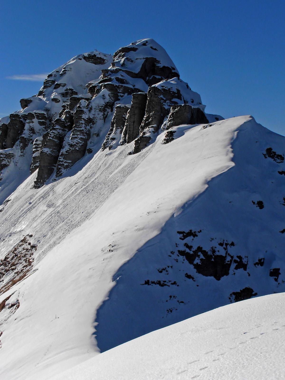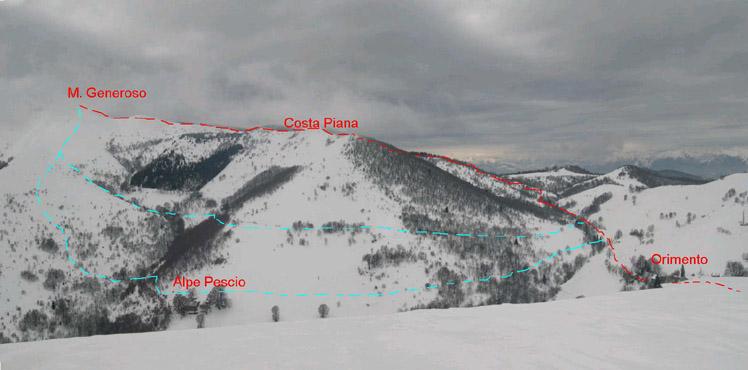 Discesa: scendere dalla cima direttamente per il bel pendio orientato a NE e giungere senza percorso obbligato all’Alpe Pesciò 1368m. , da dove bisogna traversare verso N – NW per riprendere l’itinerario di salita al ponticello in legno. Rimesse le pelli , una volta raggiunta la Bocchetta di Orimento , continuare a salire verso SE sino alla Punta della Croce o Monte Crocione 1491 m. all’arrivo dello skilift. Scendere i bei pendii orientati a N senza percorso obbligato sino alla punto di partenza.