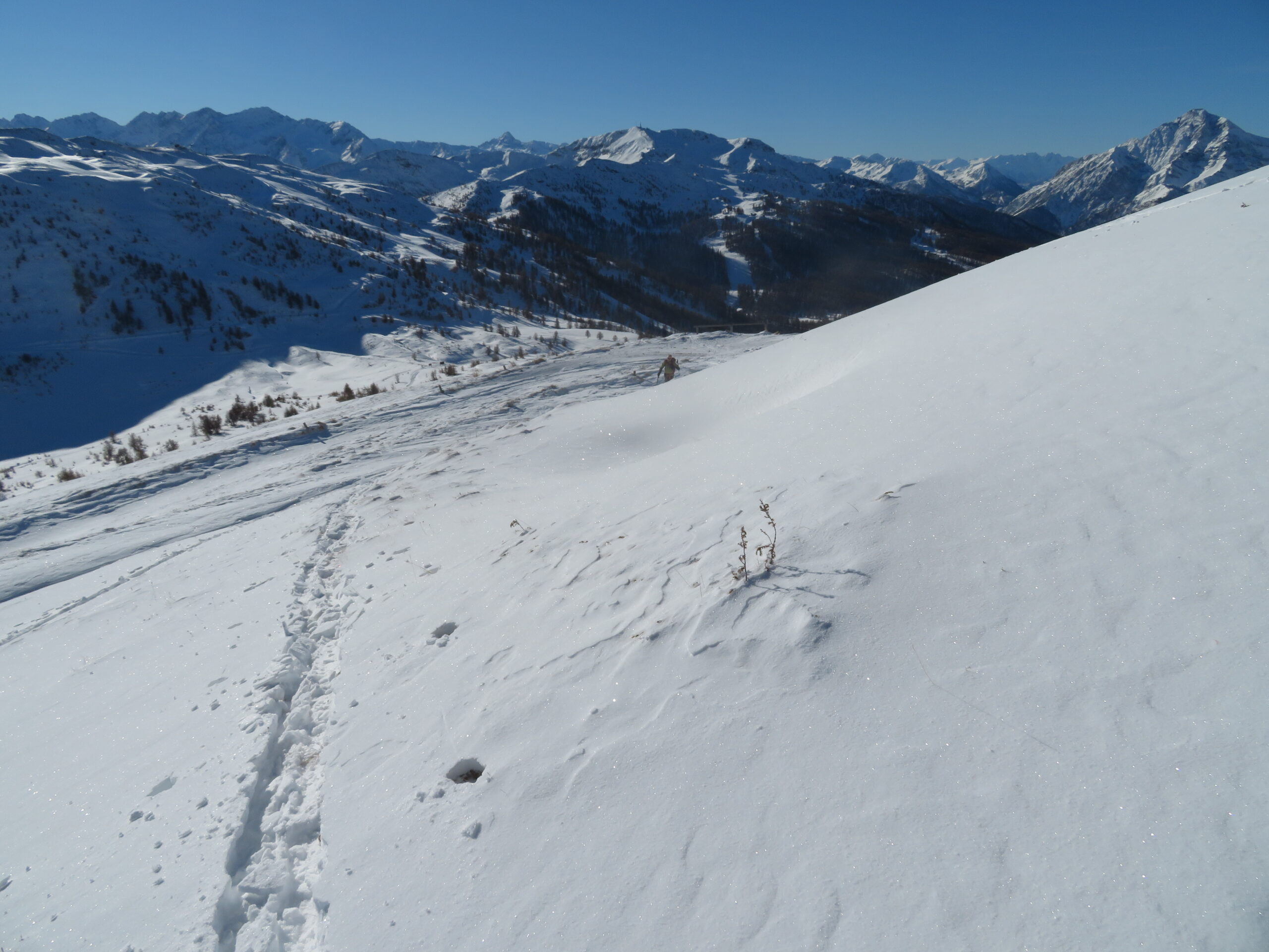 Neve ancora poco e senza fondo. Toccato molto. Partenza con gli sci dall’Istituto Zootecnico ma la spalla del Genevris è molto scoperta, ok in salita in discesa siamo stati verso Pragelato alternando crosta a sassi. Risaliti al Moncrons lungo la spalla. In discesa a patto di non scandalizzarsi per le grattate ci si poteva divertire lungo le vecchie piste fino a 100 metri dall’auto dove abbiamo ripreso la stradina innevata. Pensavo di trovare più gente dopo il lock down, invece una decina. Con Enri.