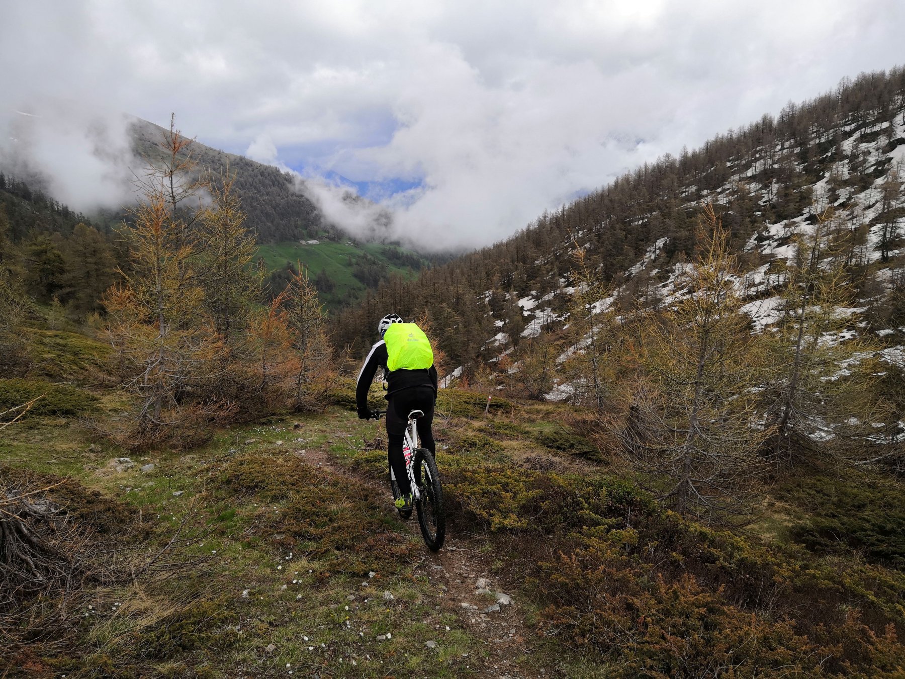 Scendiamo dunque tornando sulle nostre tracce, fino ad arrivare al bivi incontrato in salita dopo l’Alpe Giarasson. Ora anzichè andare in direzione dell’alpeggio proseguiamo dritti in discesa, un bel sentiero che alterna tratti ripidi a tratti più scorrevoli compie un lungo traverso per poi uscire su una strada sterrata. Tralasciamo la strada che va verso destra per continuare a sinistra su sentiero, con un paio di tornanti ci portiamo sul fondo del vallone dove scorre il Rio Pomerol. Seguiamo fedelmente il sentiero mantenendoci in direzione del Rif che raggiungiamo a quota 1803 m.