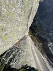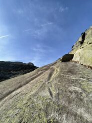 Via ottimamente spietata, necessari 12 rinvii. La presenza regolare di buone fessure lungo il diedro permette a coloro che intendono esercitarsi in questo campo di salire la via anche su friend e dadi.