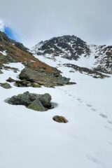 Metà del sentiero è pulito, mentre la neve nel canale di salita è costante dai circa 2300 mt. e solo nei punti più inclinati si sprofonda. Si può comunque aggirare rimanendo sulla sinistra il più possibile. Ci siamo fermati a sinistra del colle giusto per ammirare il vallone di Sea (completamente pulito da neve).