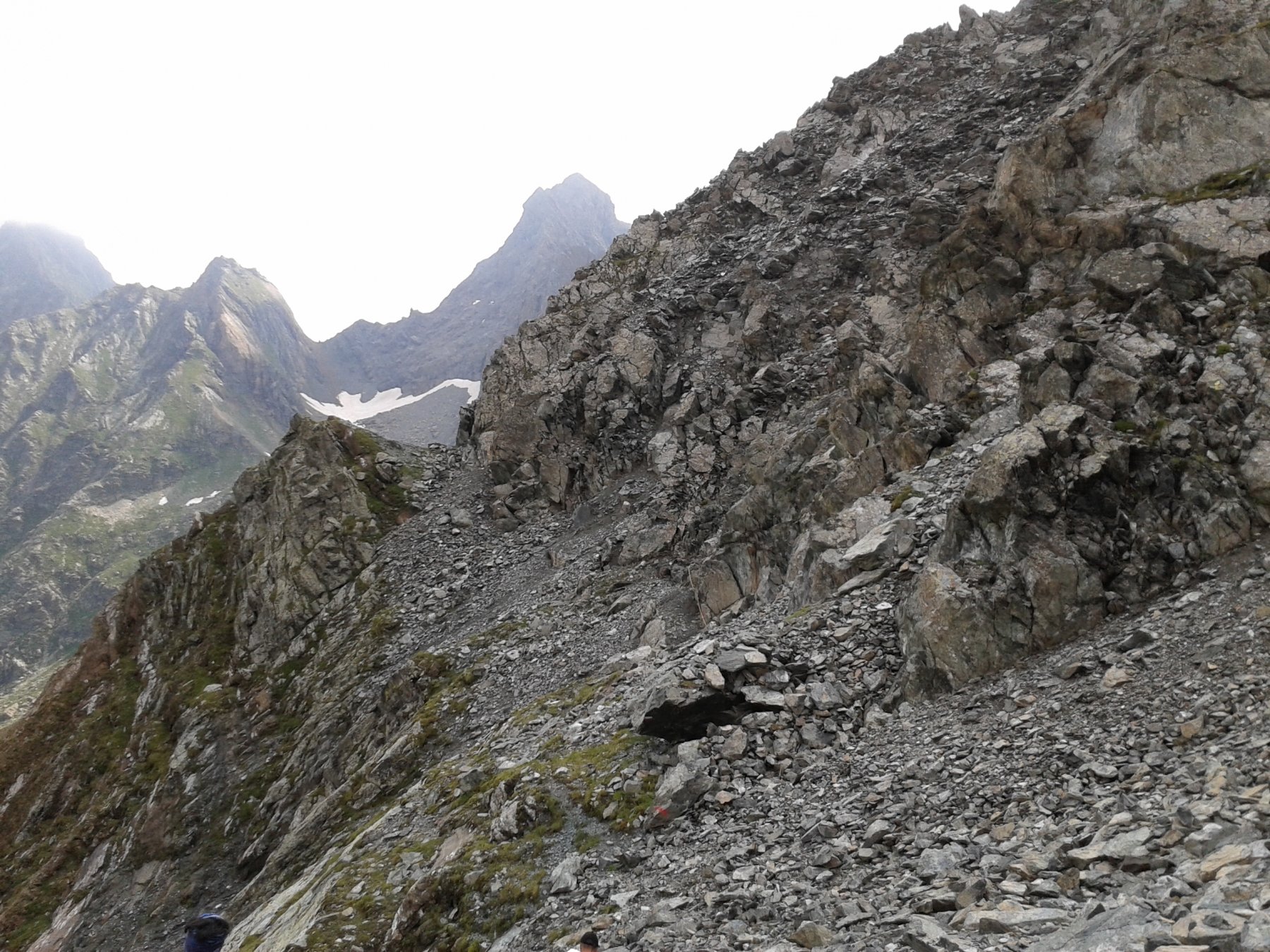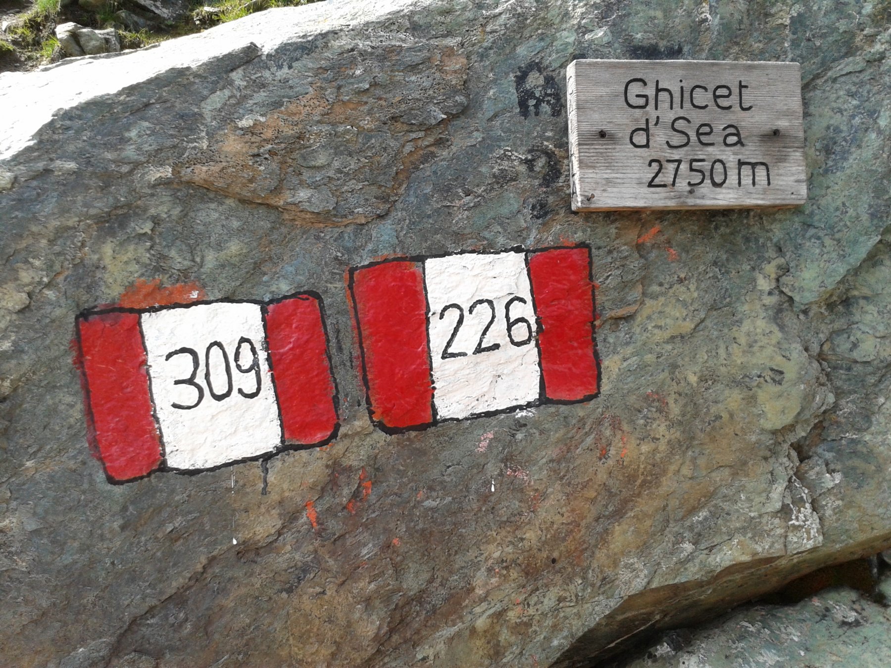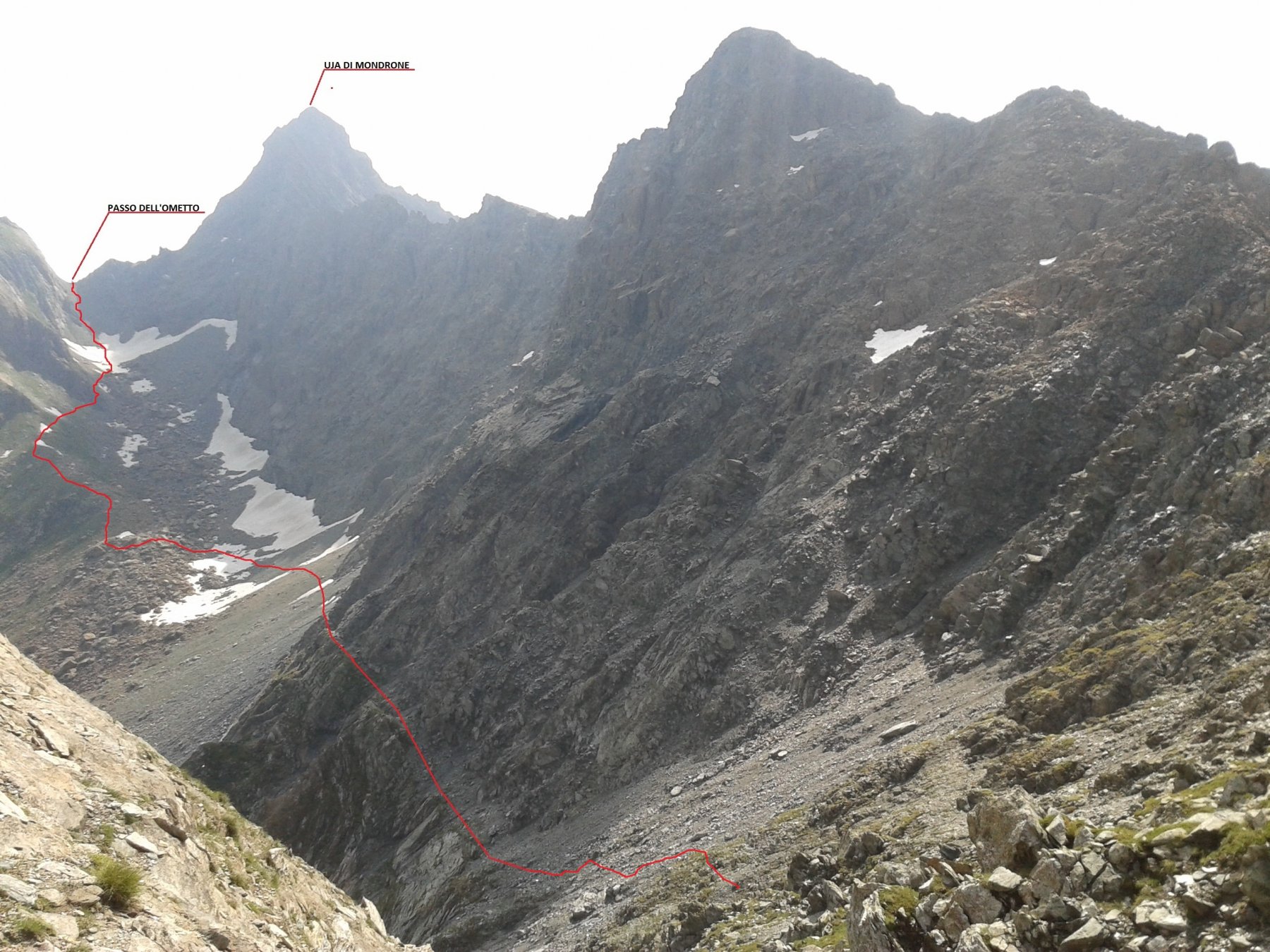 Dall’inizio del sentiero 226 vicino al rifugio Ciriè percorrere seguendo i segnavia bianco-rossi la traccia superando il Pian Ciamarella e ricercare al fondo un grosso masso erratico dove nei pressi il sentiero inizia a salire in dir.N-E e giungere fino al colle Ghicet di Sea, 2750 mt (2,5 ore~). Da qui scendere seguendo la traccia e i bolli bianco-rossi, ormai piuttosto rari, del segnavia n.309 in val di Sea e raggiungere l’evidente cengia che, alternando un percorso obliquo in discesa a brevi risalite e attraversando i numerosi canali e detriti morenici si raccorda al fondo del valloncello Ovest del passo dell’Ometto. Non abbassarsi troppo in questa fase ma cercare di mantenere una costante discesa obliqua al meglio in modo da avvicinarsi il più possibile in quota al fondo del valloncello evitando così fastidiose risalite. Risalire quindi con elementare arrampiacata dei grossi massi di raccordo dell’ erta scarpata erbosa ( alla ns. destra orografica e alla ns. sinistra guardando il passo dell’Ometto) e cercare poi la traccia dove riprendono i bolli segnavia del sentiero 309, ora proveniente dal fondo del vallone di Sea; proseguire sino all’attacco del ripido canalino Ovest e quindi guadagnare il dosso del passo (2614 mt, 5 ore 1/2~ dalla partenza). Scendere dal colle sul sentiero 233 e seguire i segnavia biancorossi che all’alpe Pian del Bosco diventa sentiero 233 GTA e proseguire fino all’abitato di Chialambertetto.