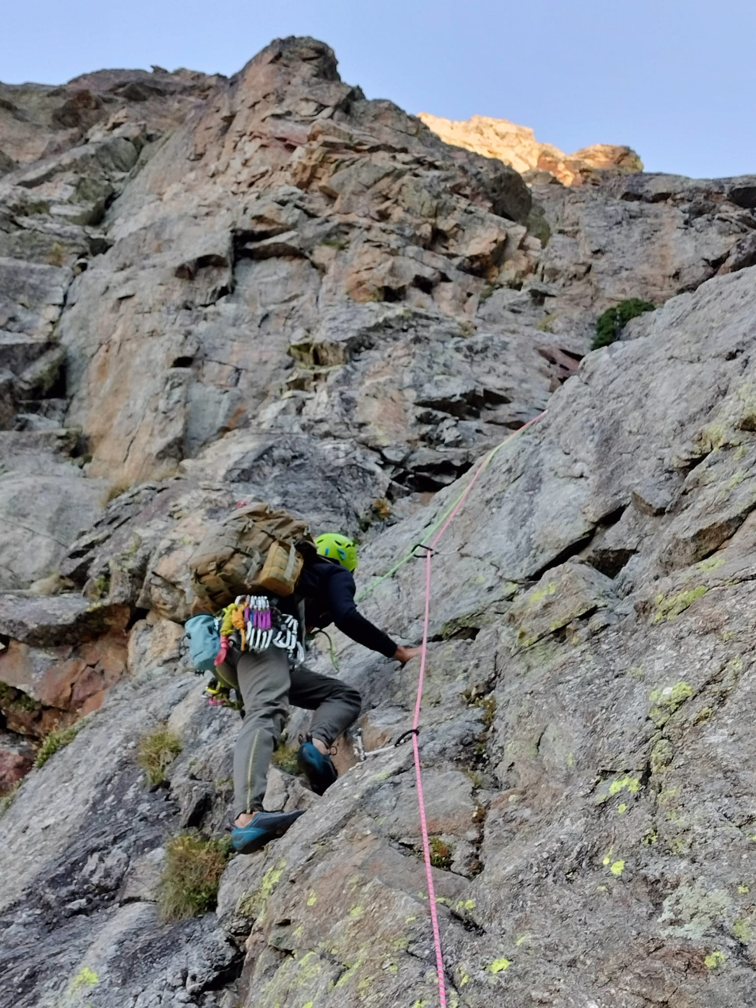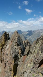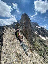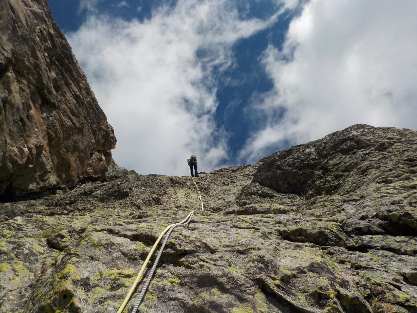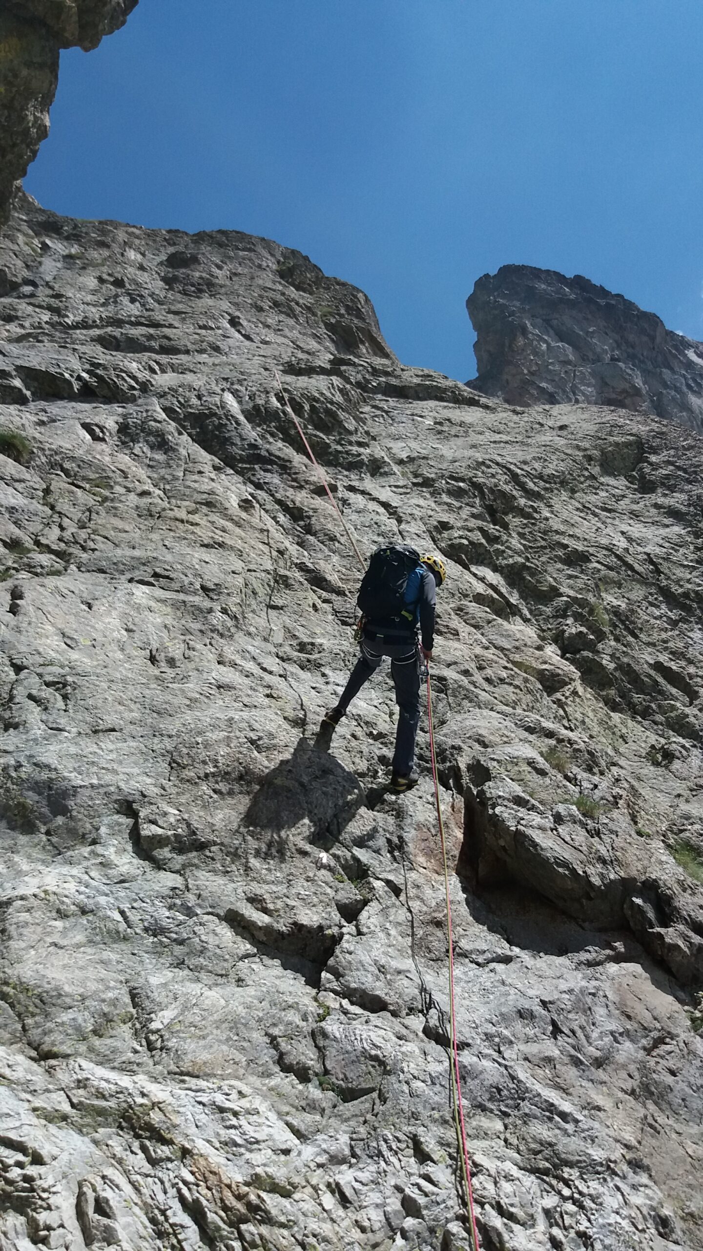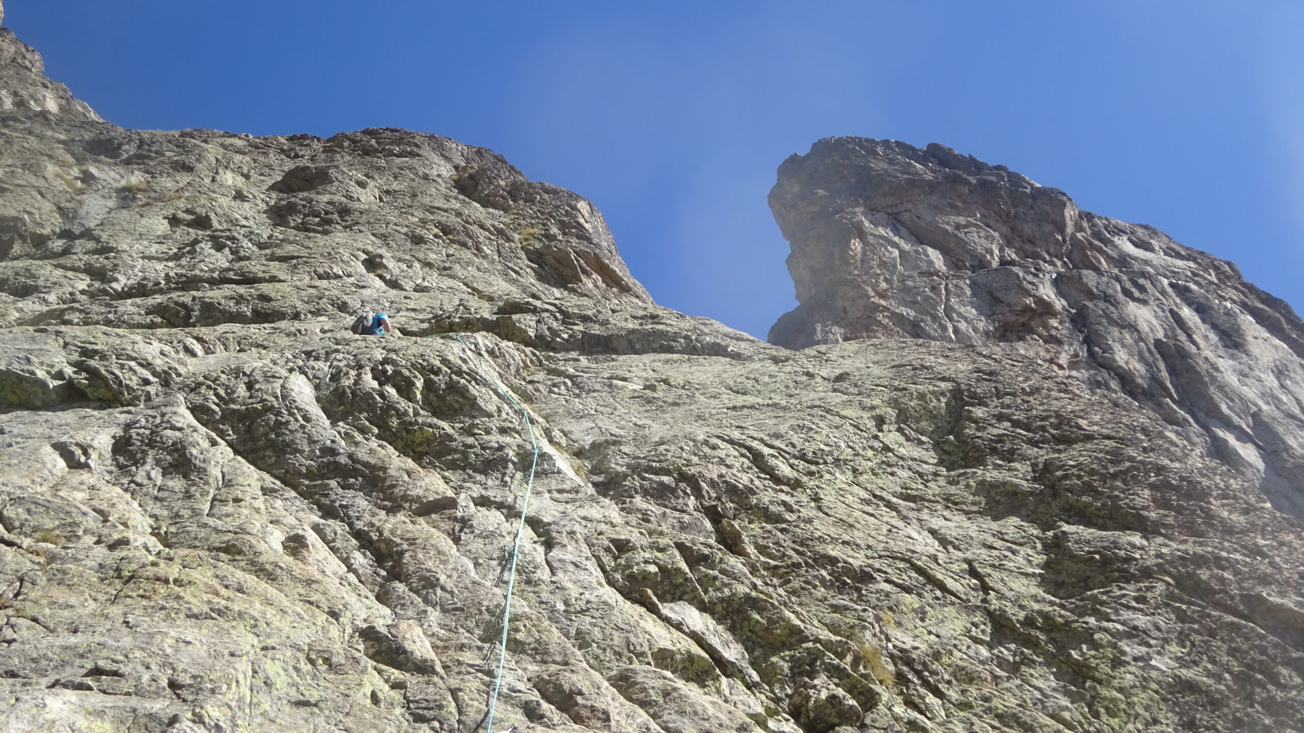 - Infine passaggio in vetta per cresta (II/II+), tiro poco attrezzato, attenzione: qualche roccia instabile