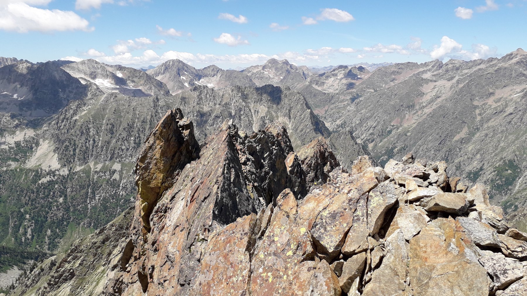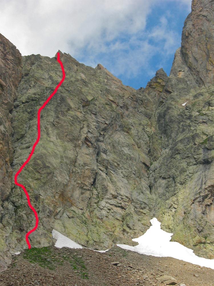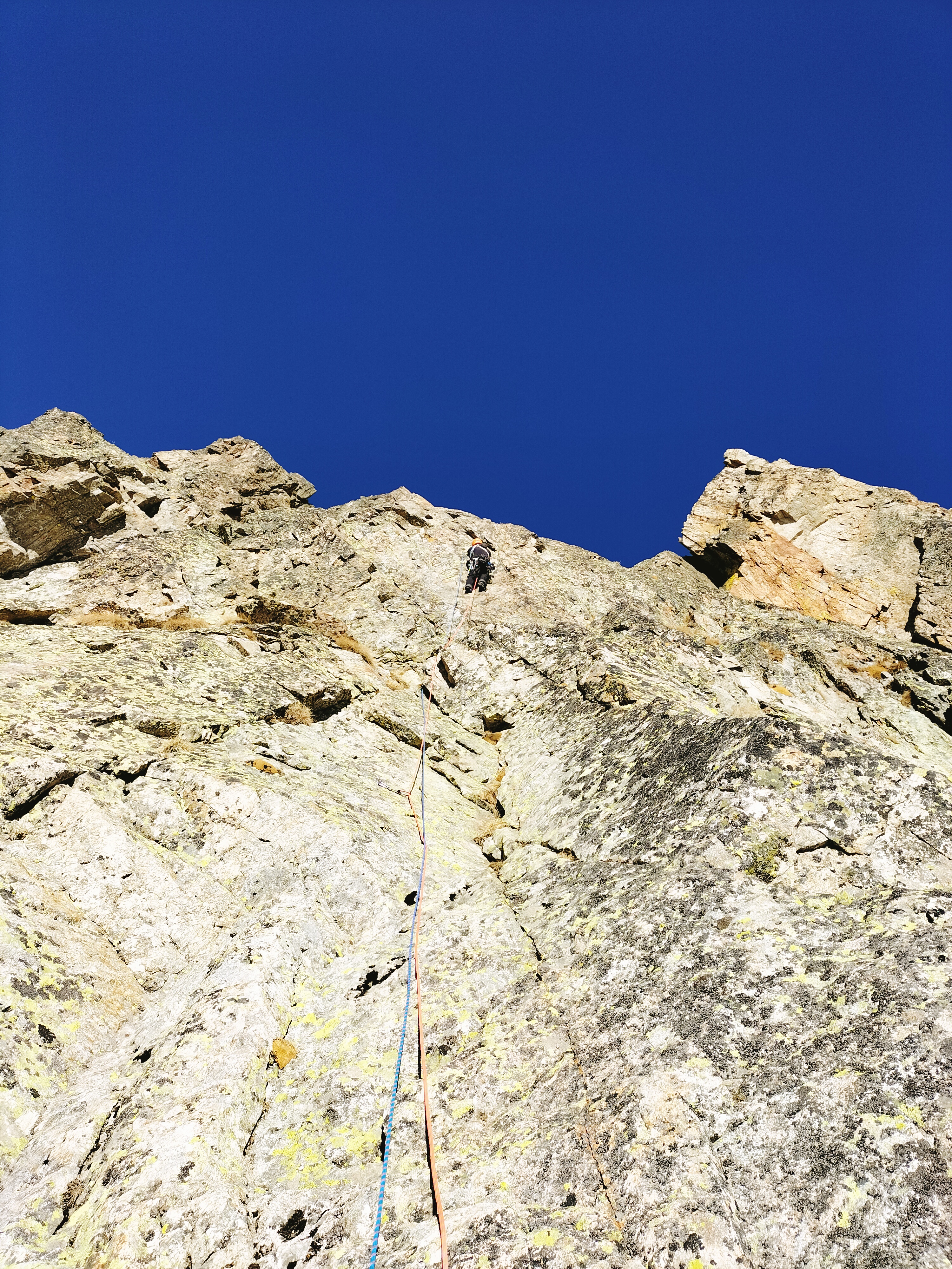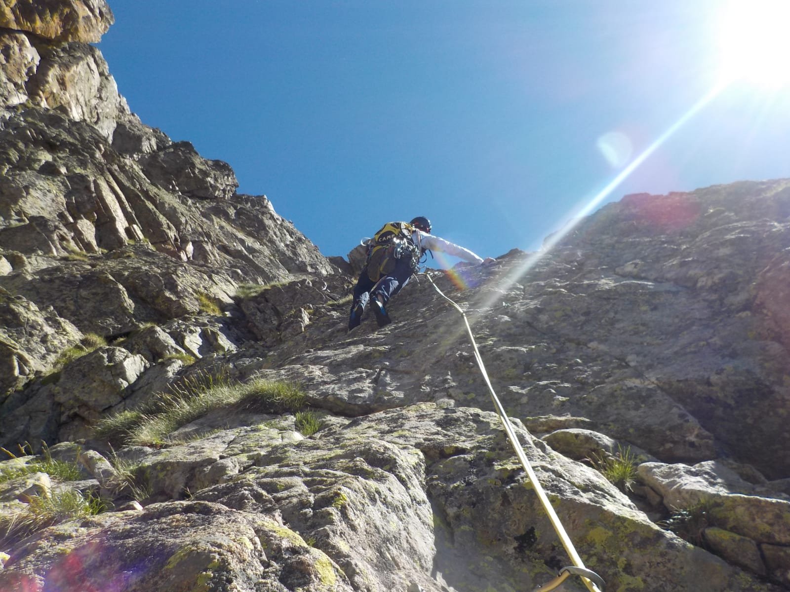 - Infine passaggio in vetta per cresta (II/II+), tiro poco attrezzato, attenzione: qualche roccia instabile