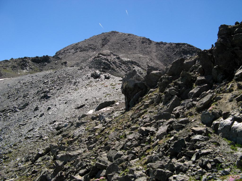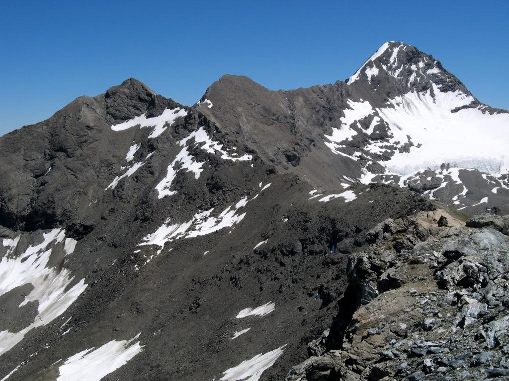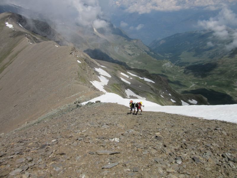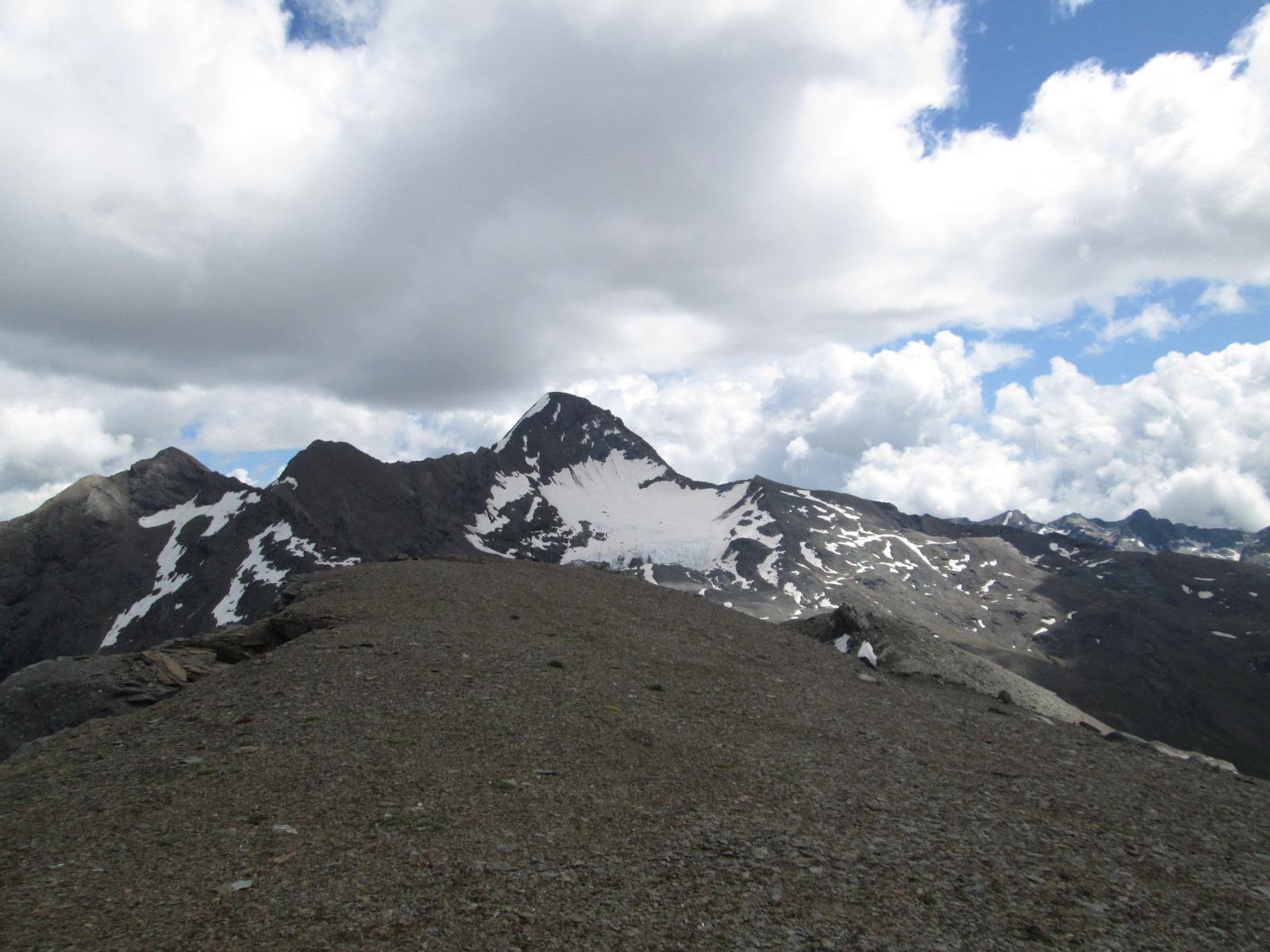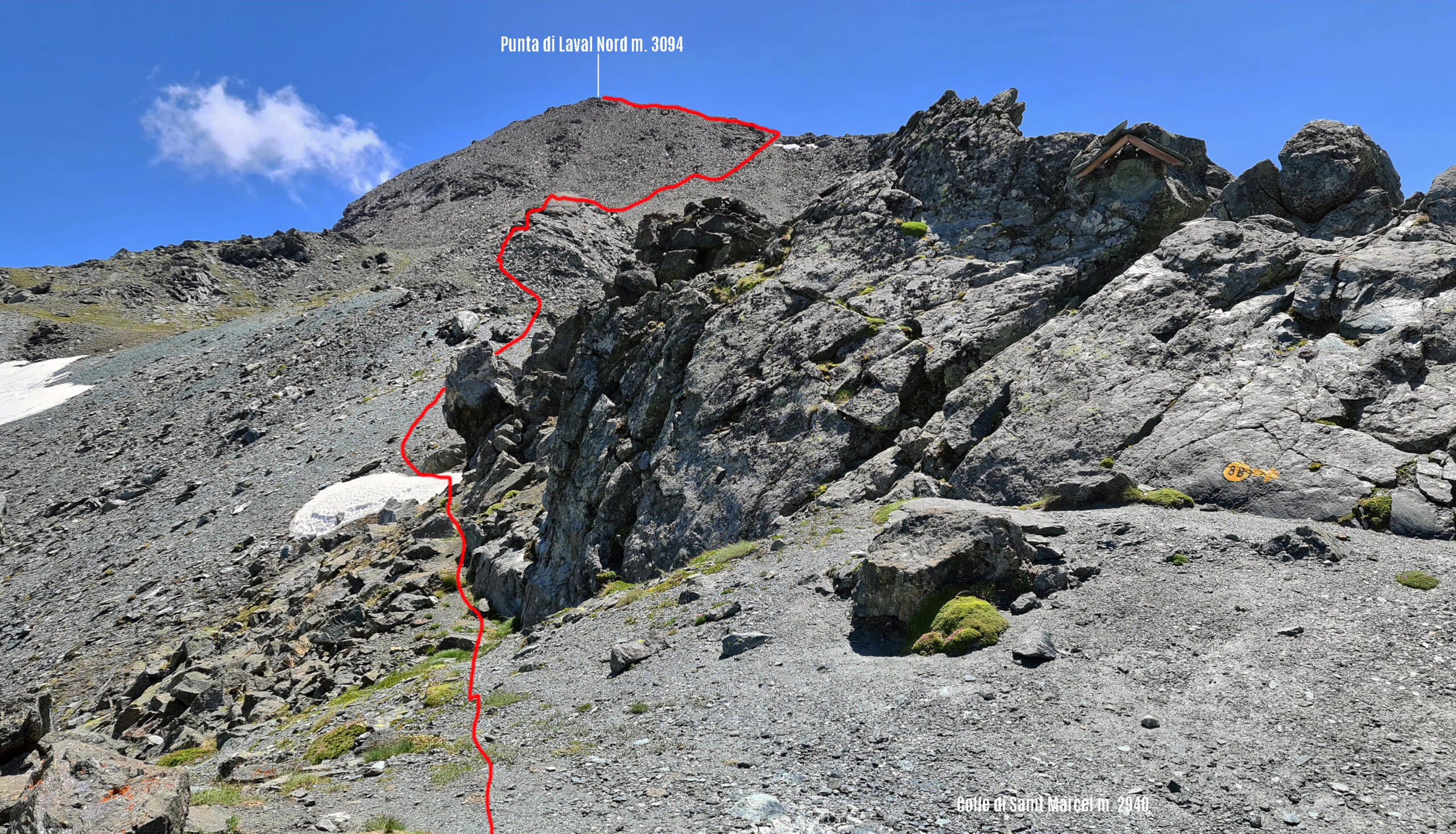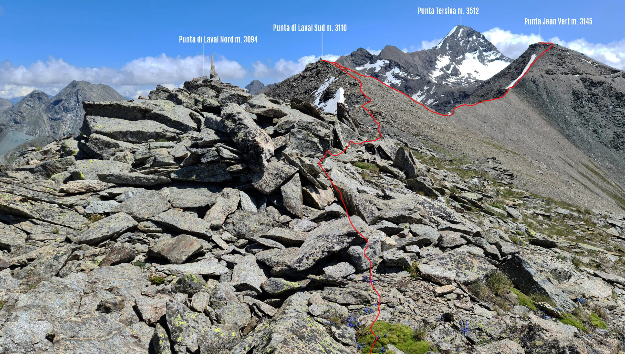 Da qui senza difficoltà seguendo il filo di cresta prima alla vetta 3091 m e in pochi minuti alla quota 3102 m. Dal colle puntare e superare verso sud la punta di Laval , raggiungere una sella ed affrontare l’ultimo pendio che porta alla piatta cima.
