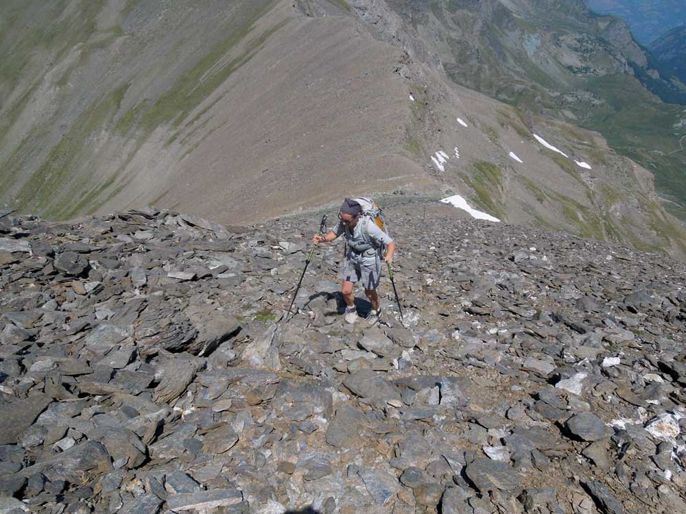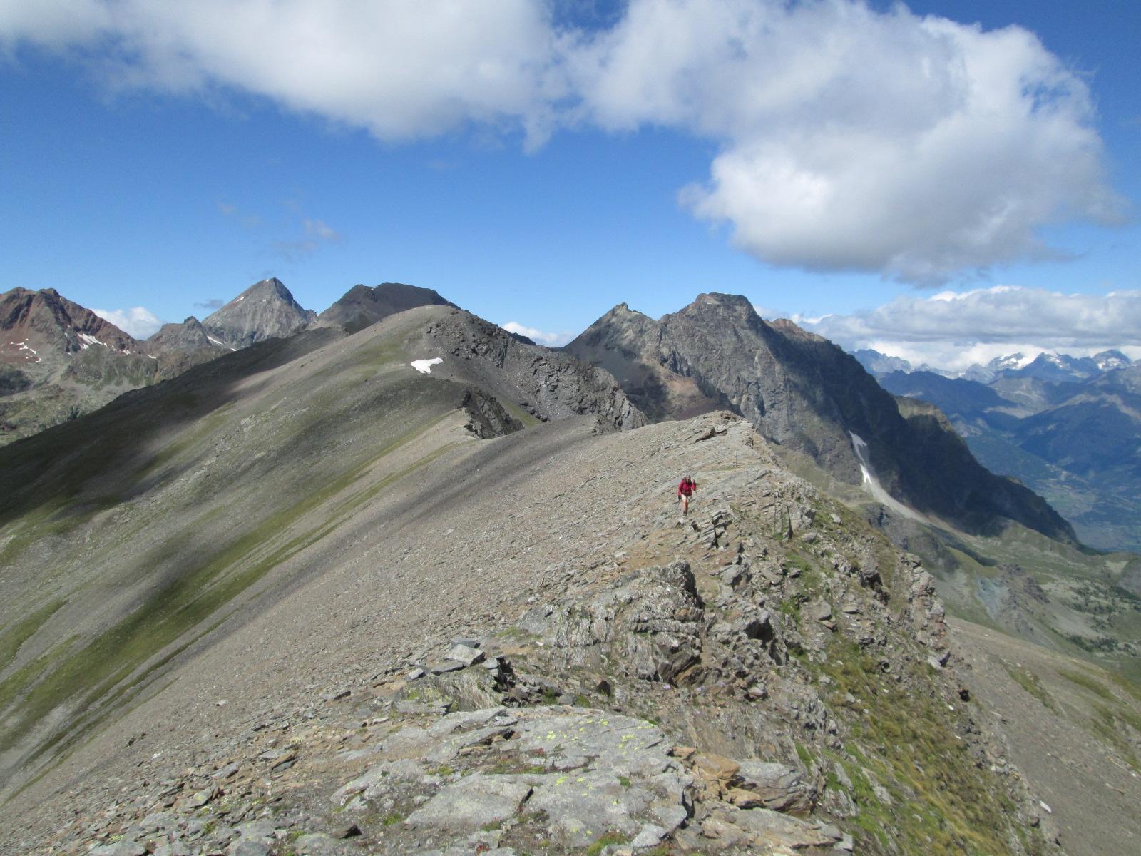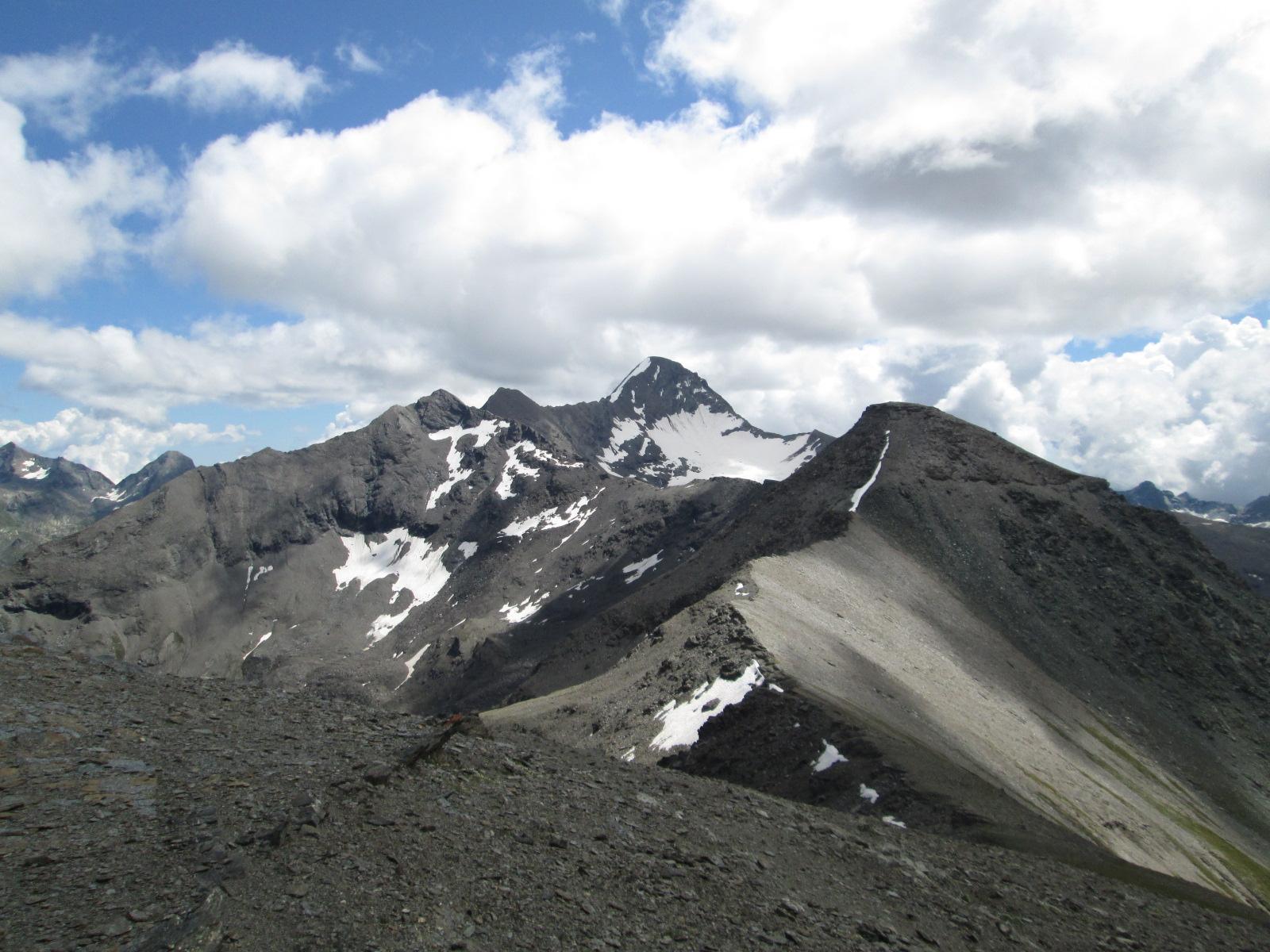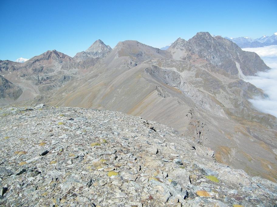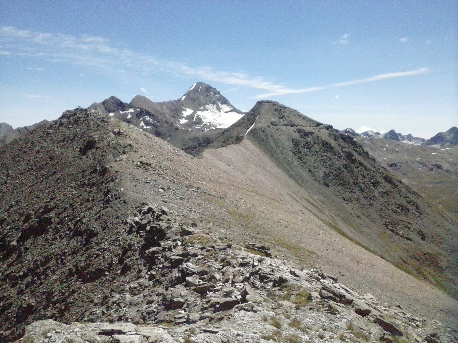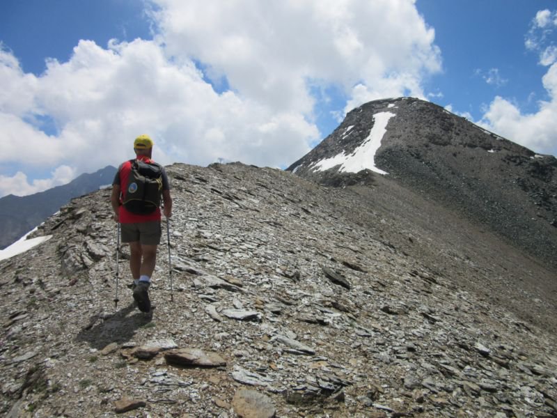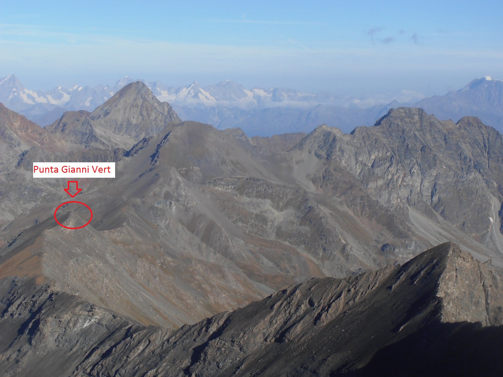 Da qui senza difficoltà seguendo il filo di cresta prima alla vetta 3091 m e in pochi minuti alla quota 3102 m. Dal colle puntare e superare verso sud la punta di Laval , raggiungere una sella ed affrontare l’ultimo pendio che porta alla piatta cima.