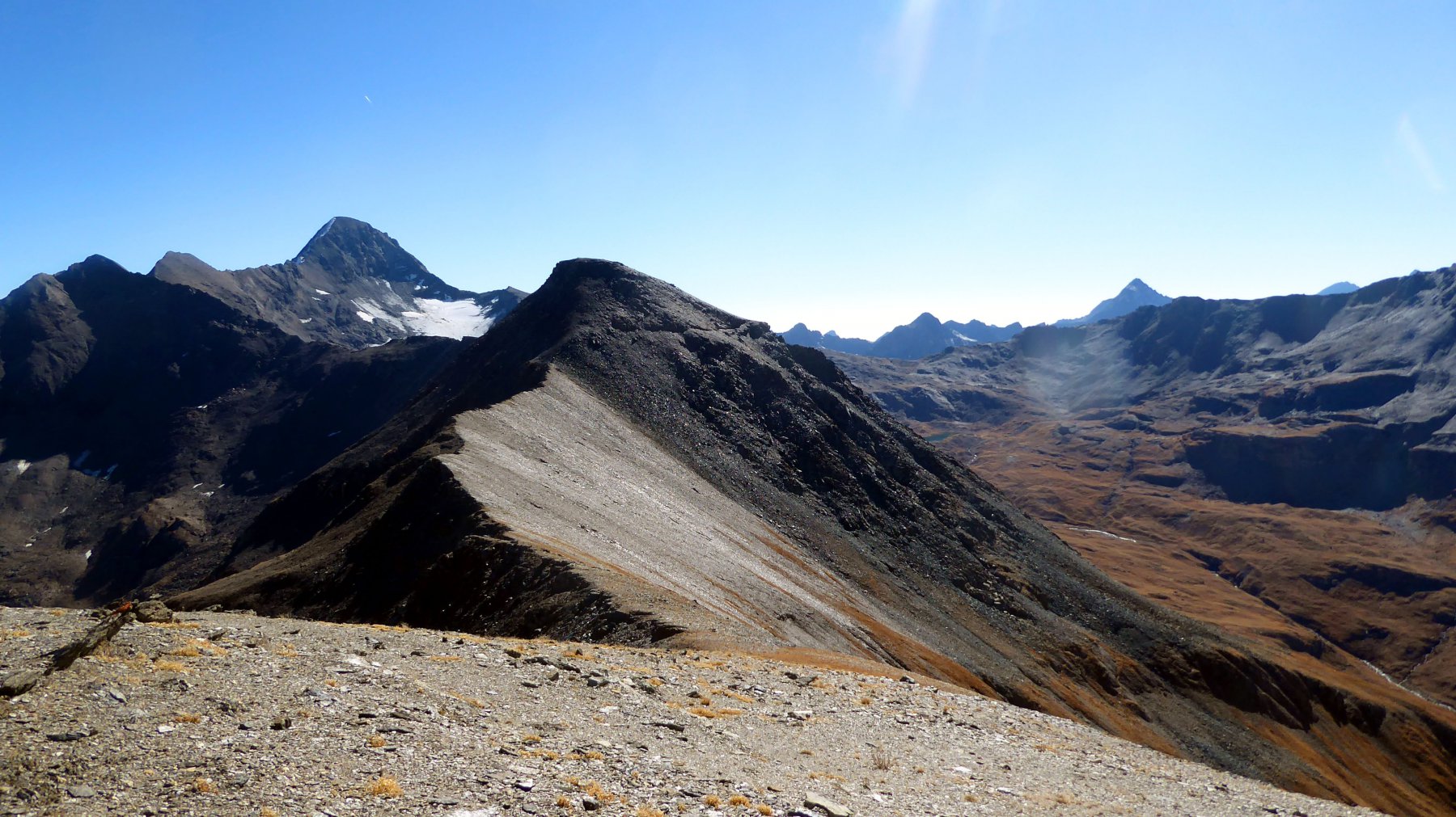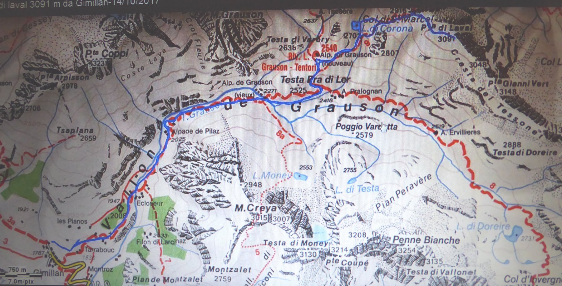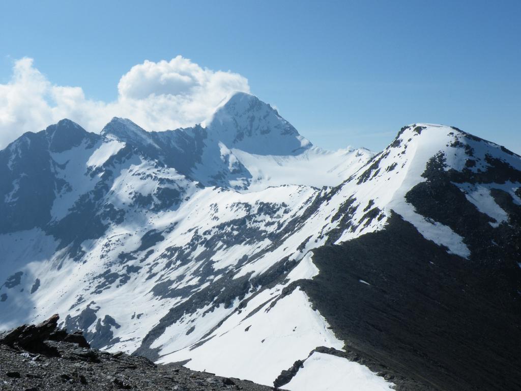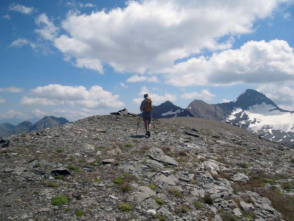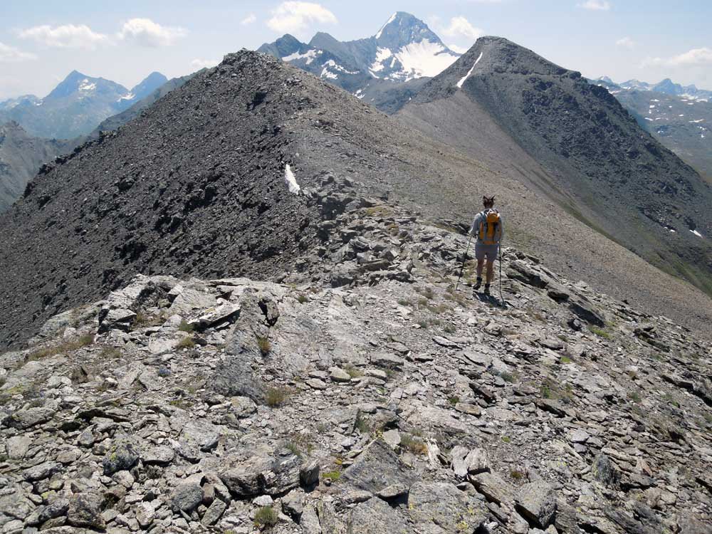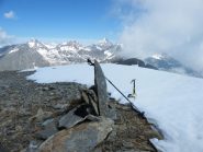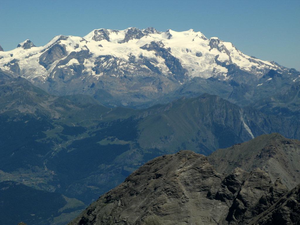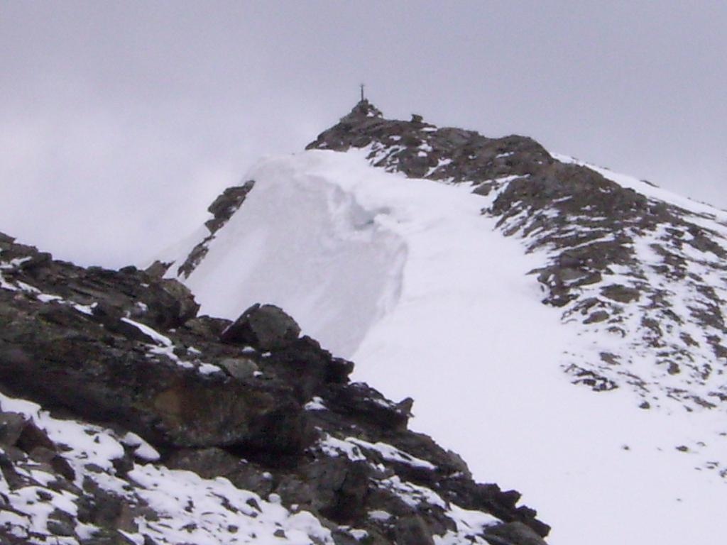 Da qui senza difficoltà seguendo il filo di cresta prima alla vetta 3091 m e in pochi minuti alla quota 3102 m. Dal colle puntare e superare verso sud la punta di Laval , raggiungere una sella ed affrontare l’ultimo pendio che porta alla piatta cima.
