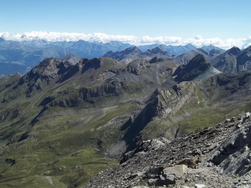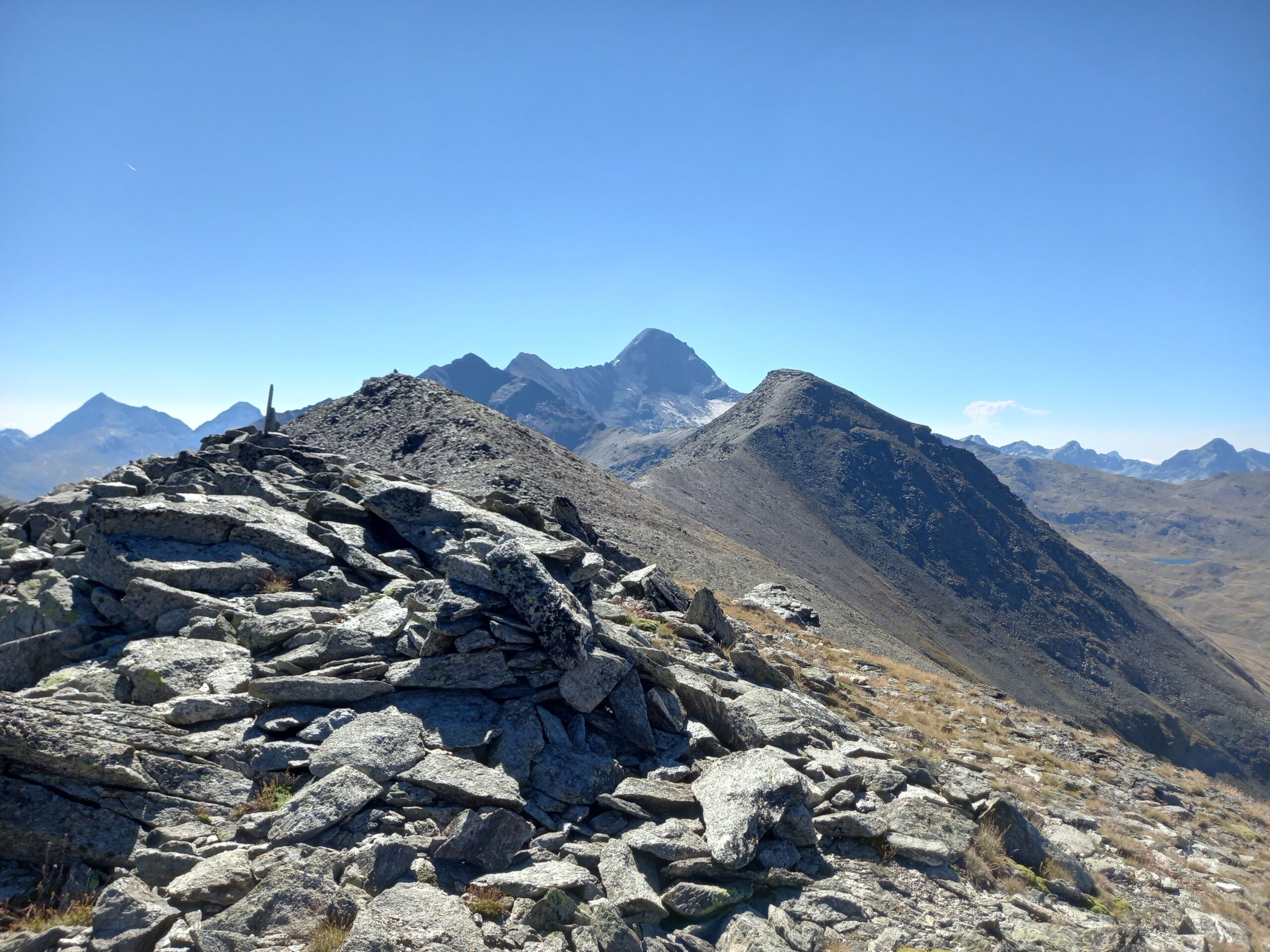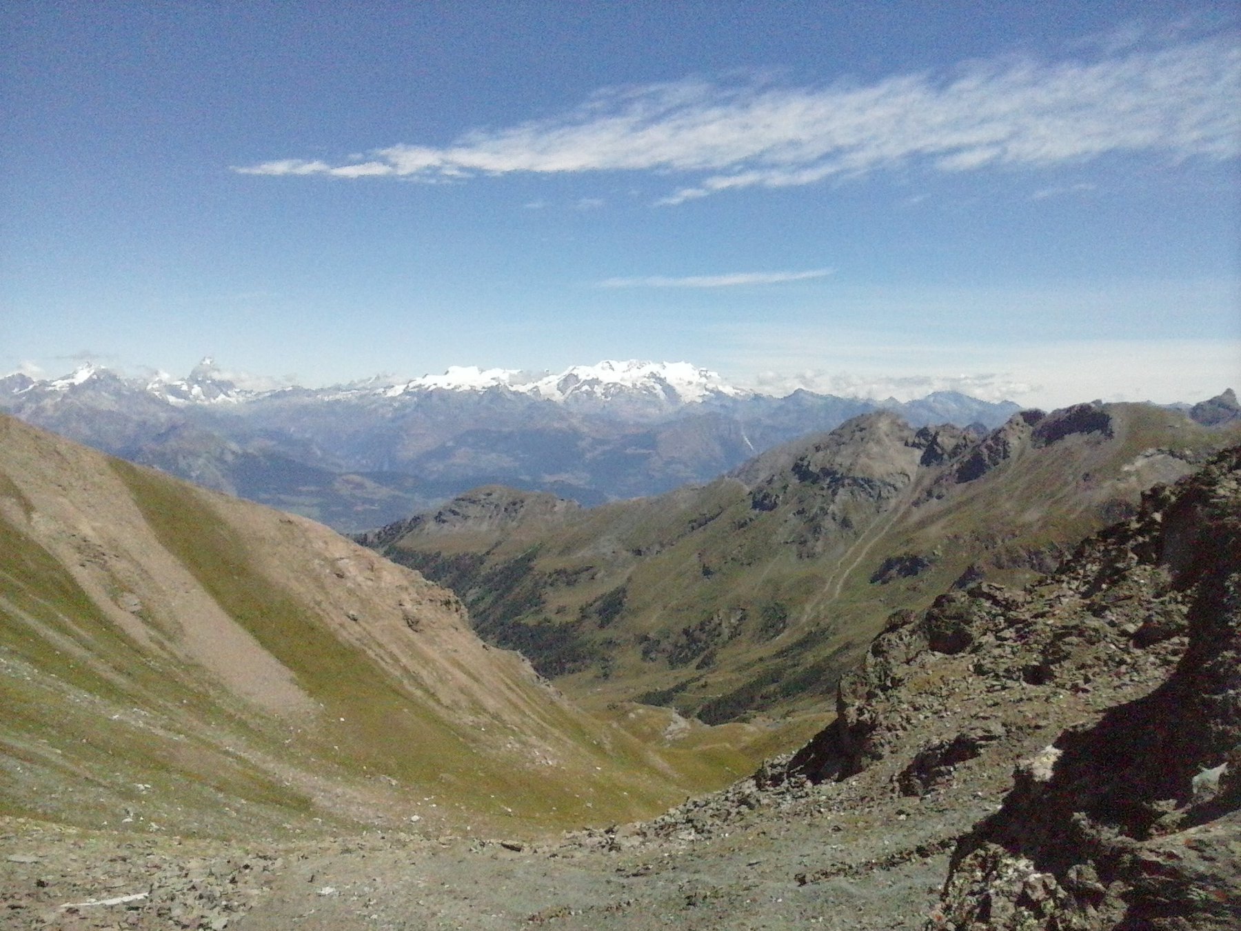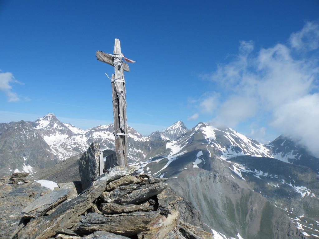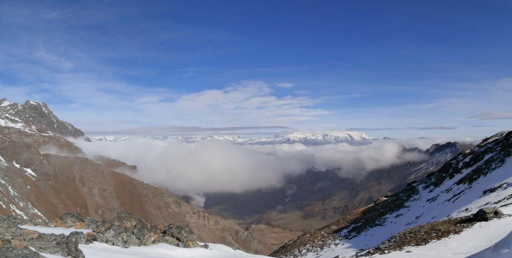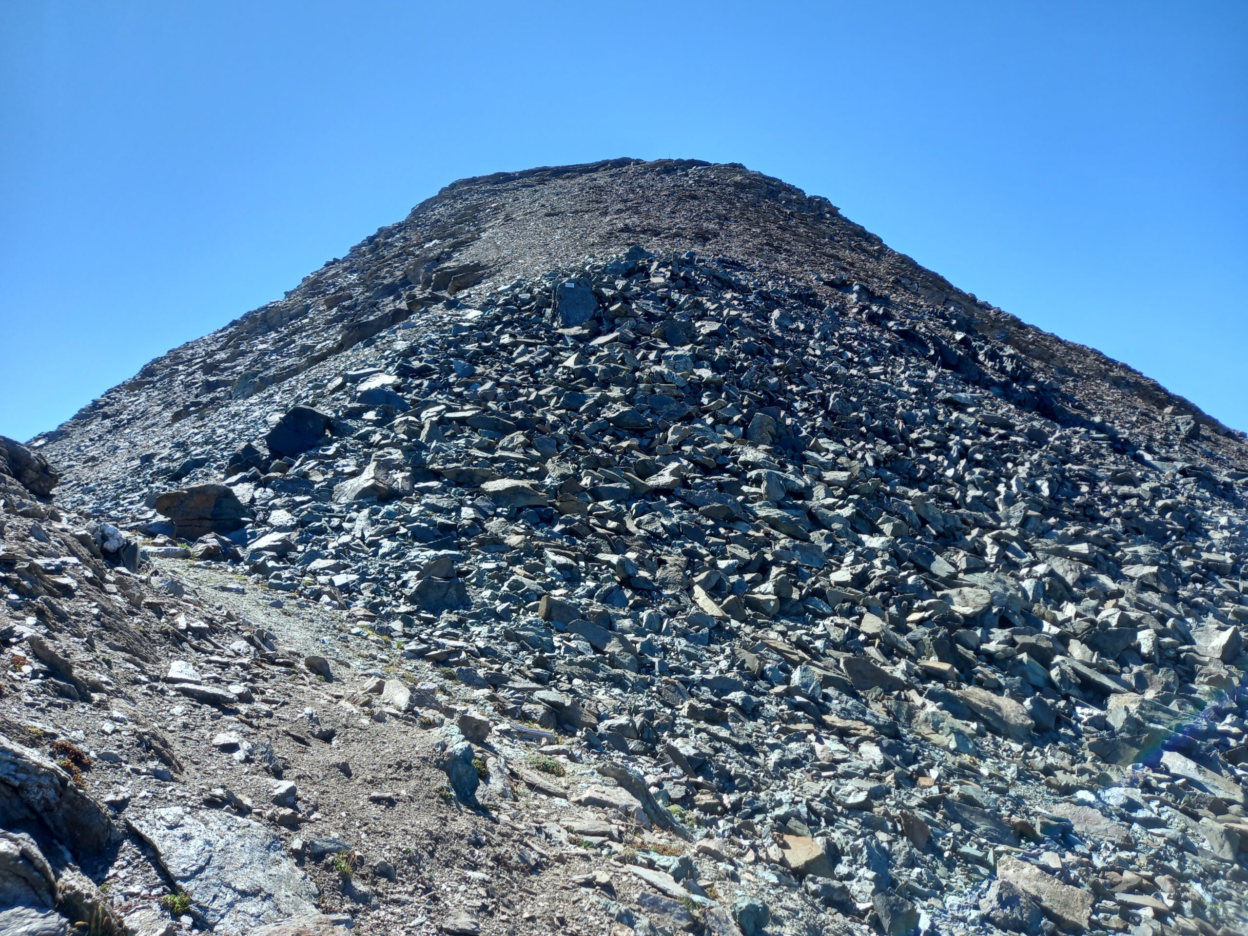 Da qui senza difficoltà seguendo il filo di cresta prima alla vetta 3091 m e in pochi minuti alla quota 3102 m. Dal colle puntare e superare verso sud la punta di Laval , raggiungere una sella ed affrontare l’ultimo pendio che porta alla piatta cima.