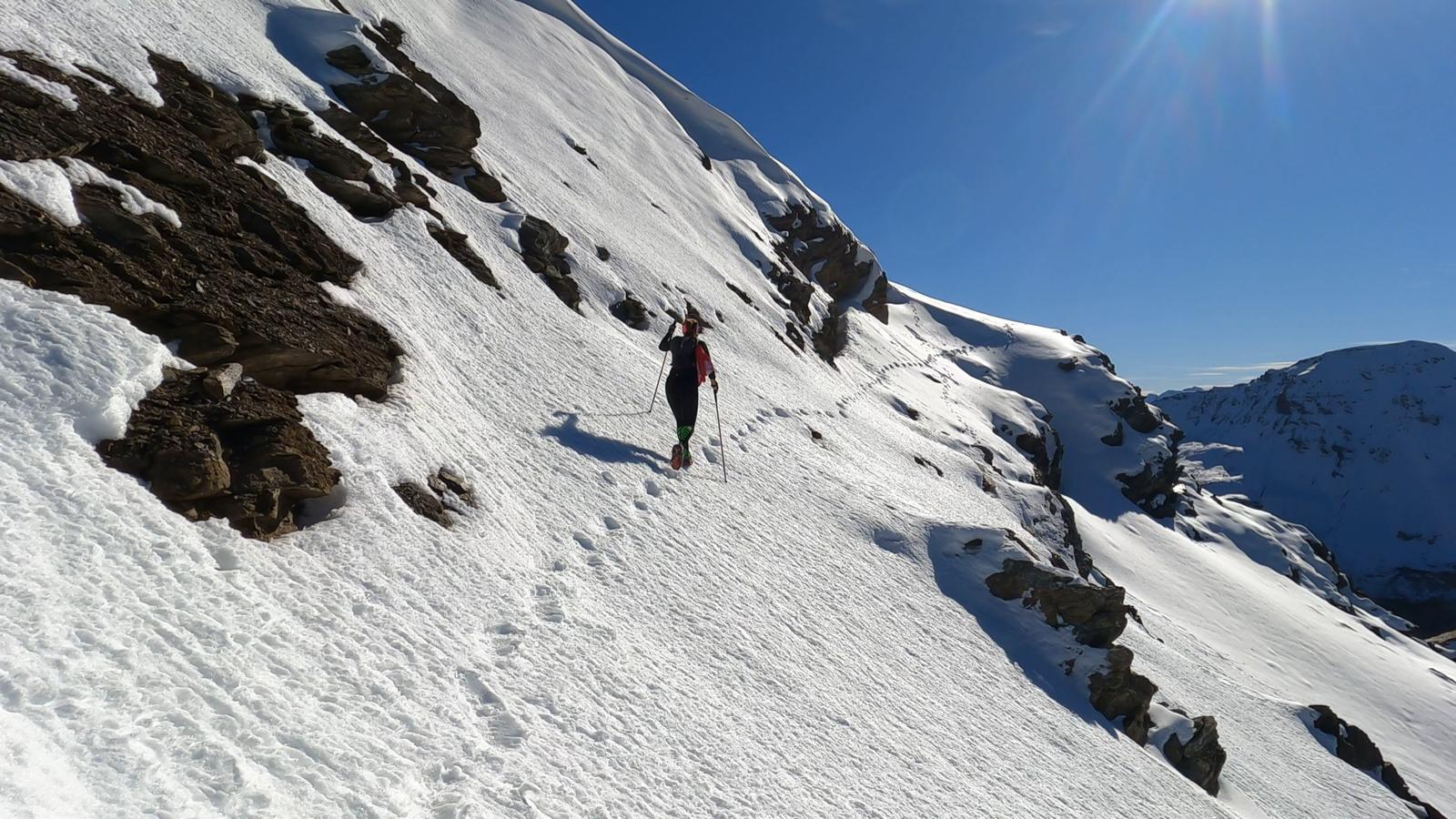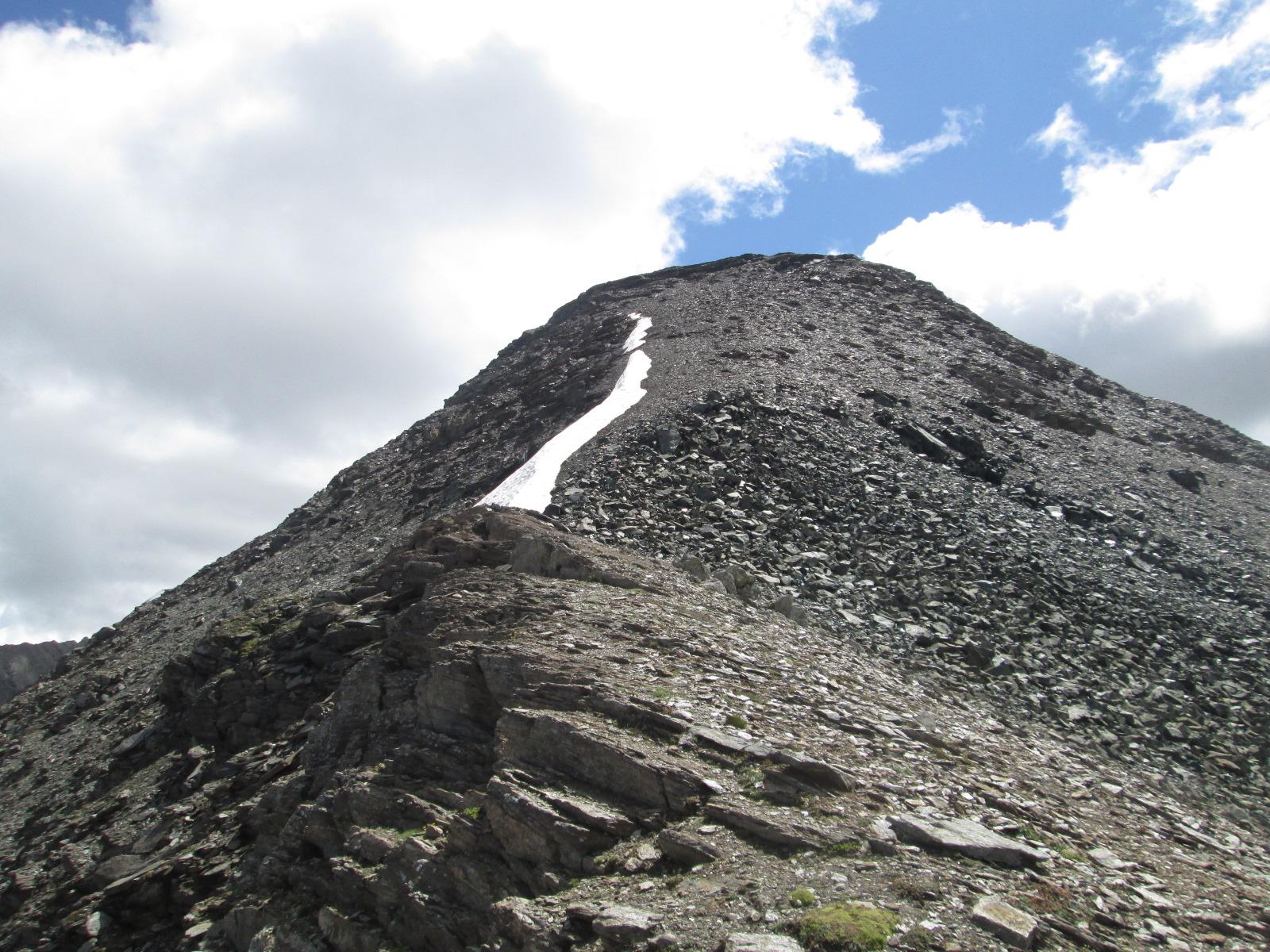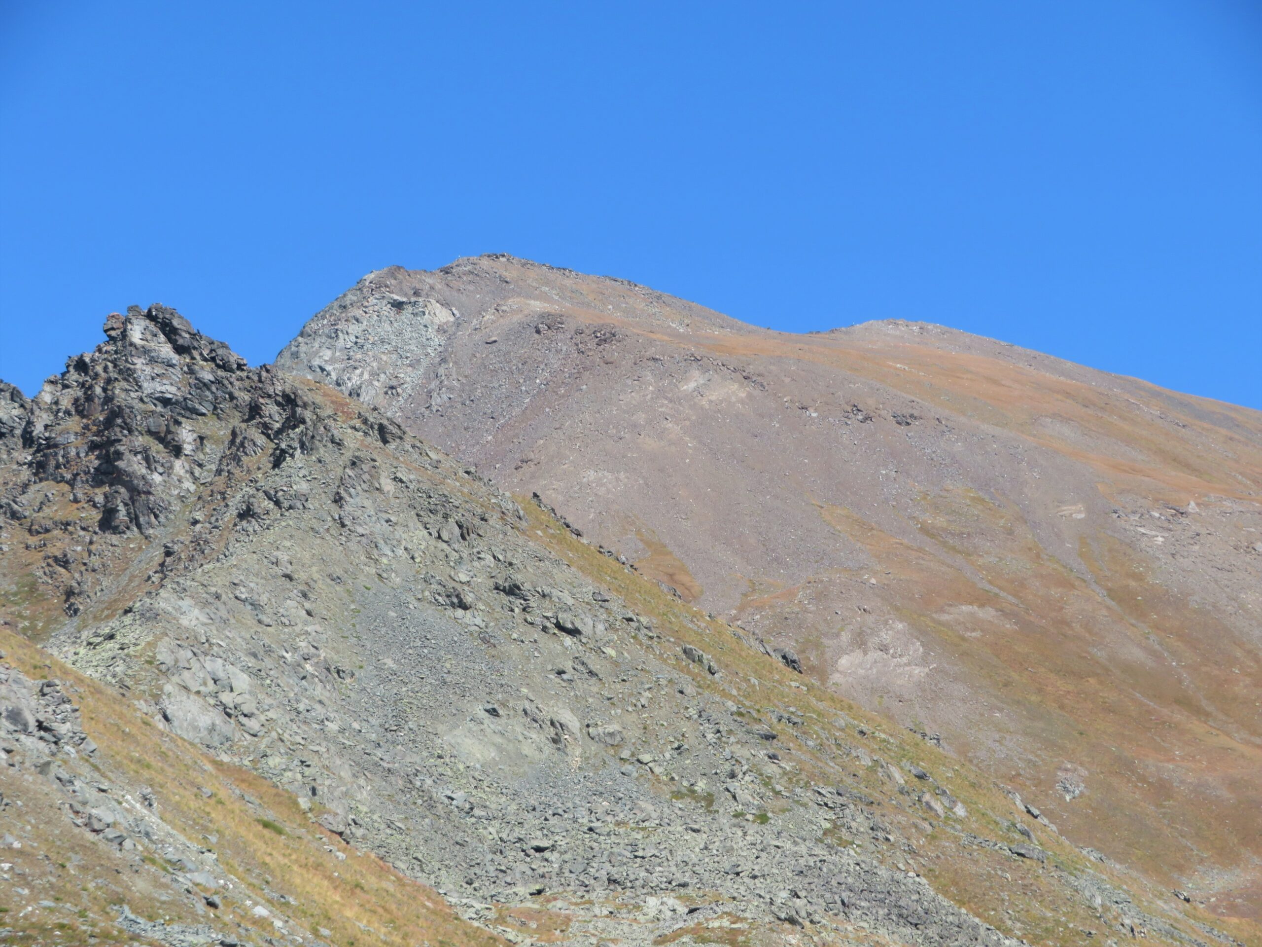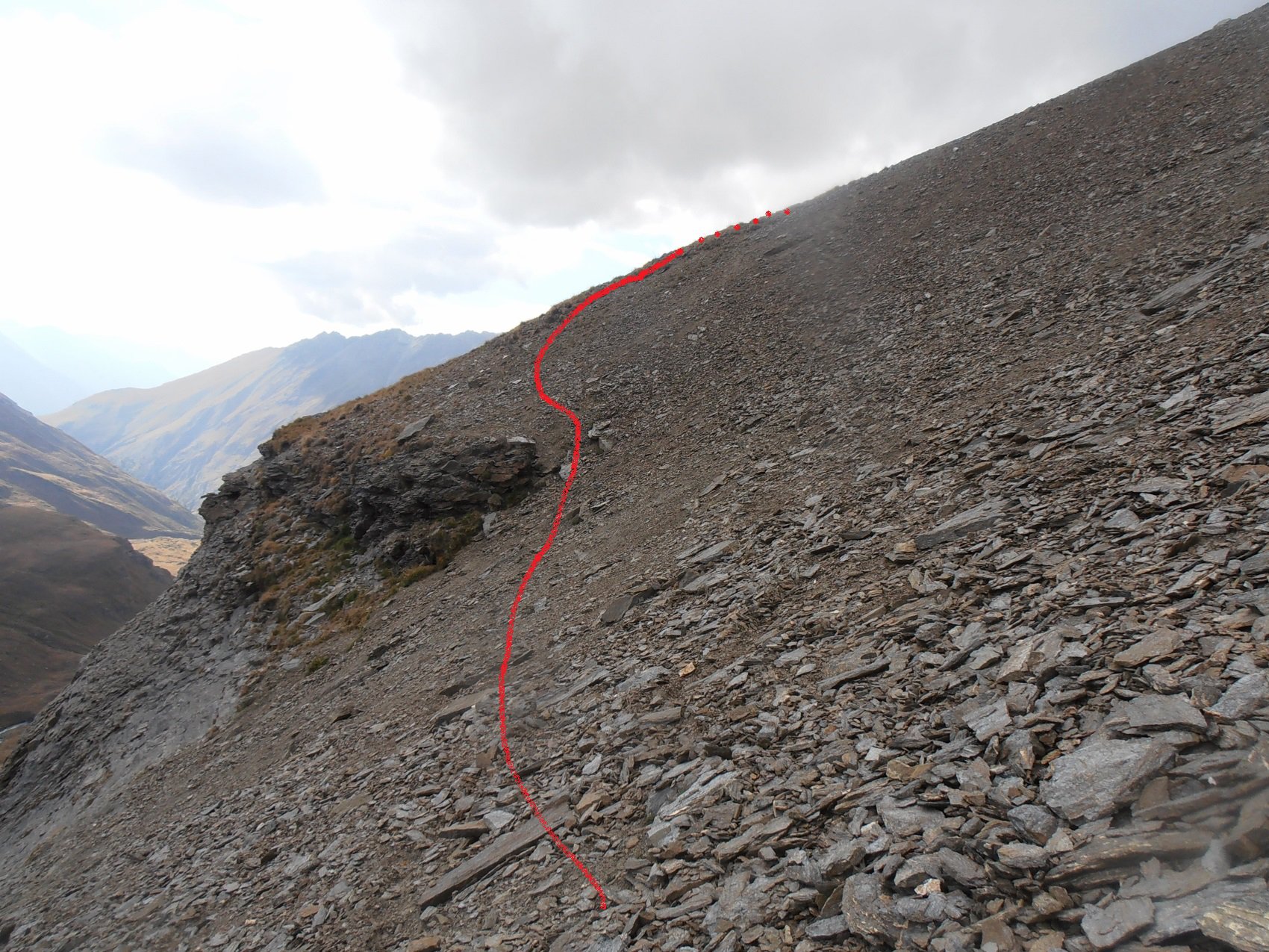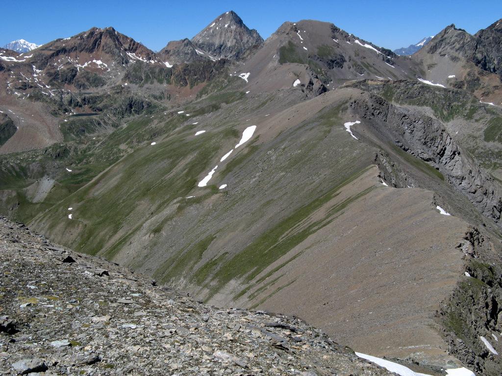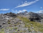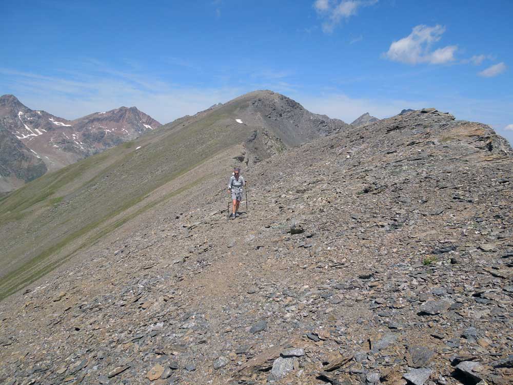 La cresta prosegue erbosa e detritica, si sale una rampa terrosa e ci si riporta sul filo. Si supera un tratto più ripido su terreno instabile (traccia di sentiero) uscendo su una spalletta a W della vetta.